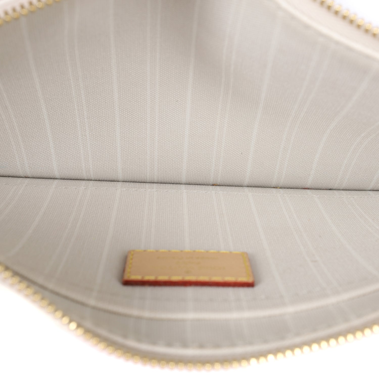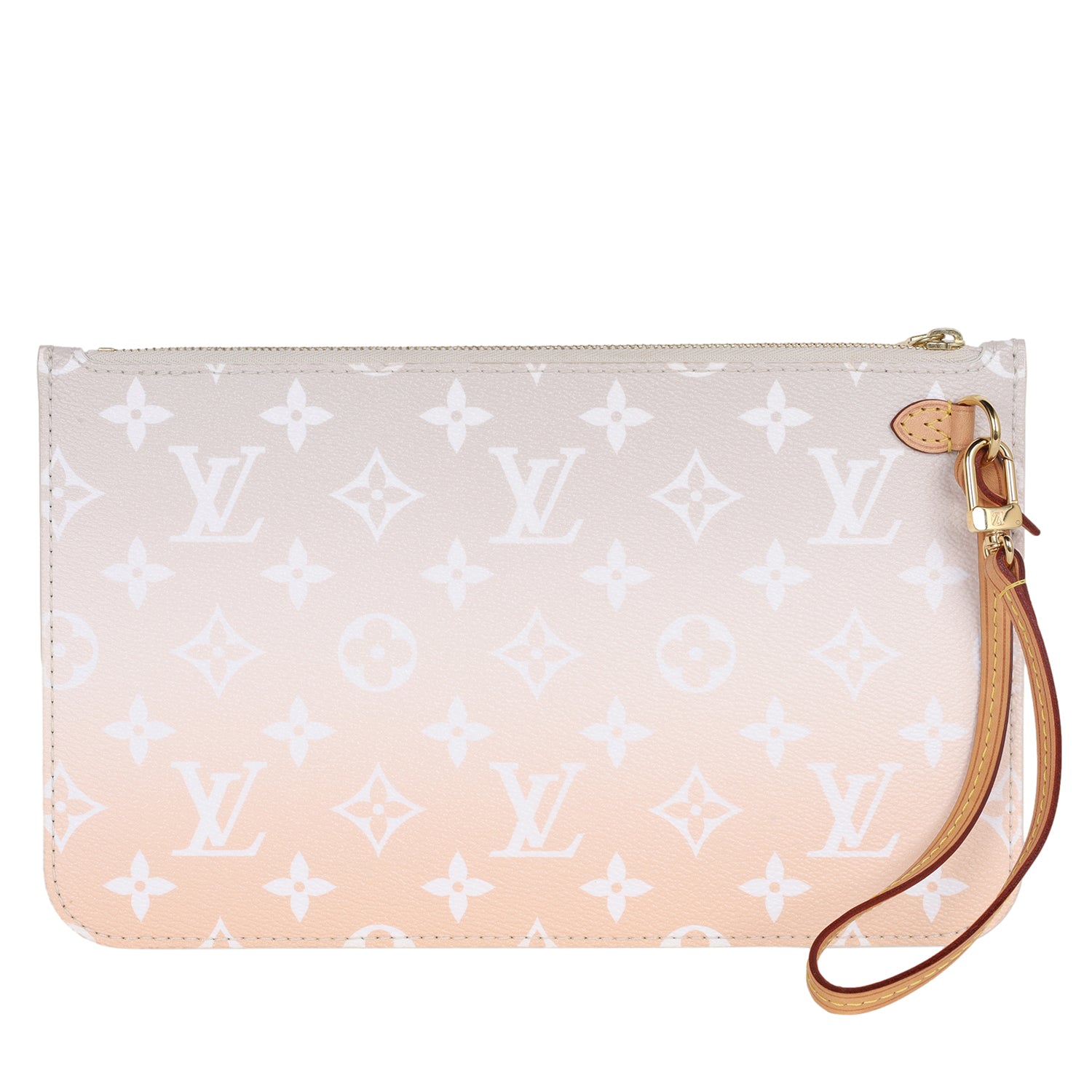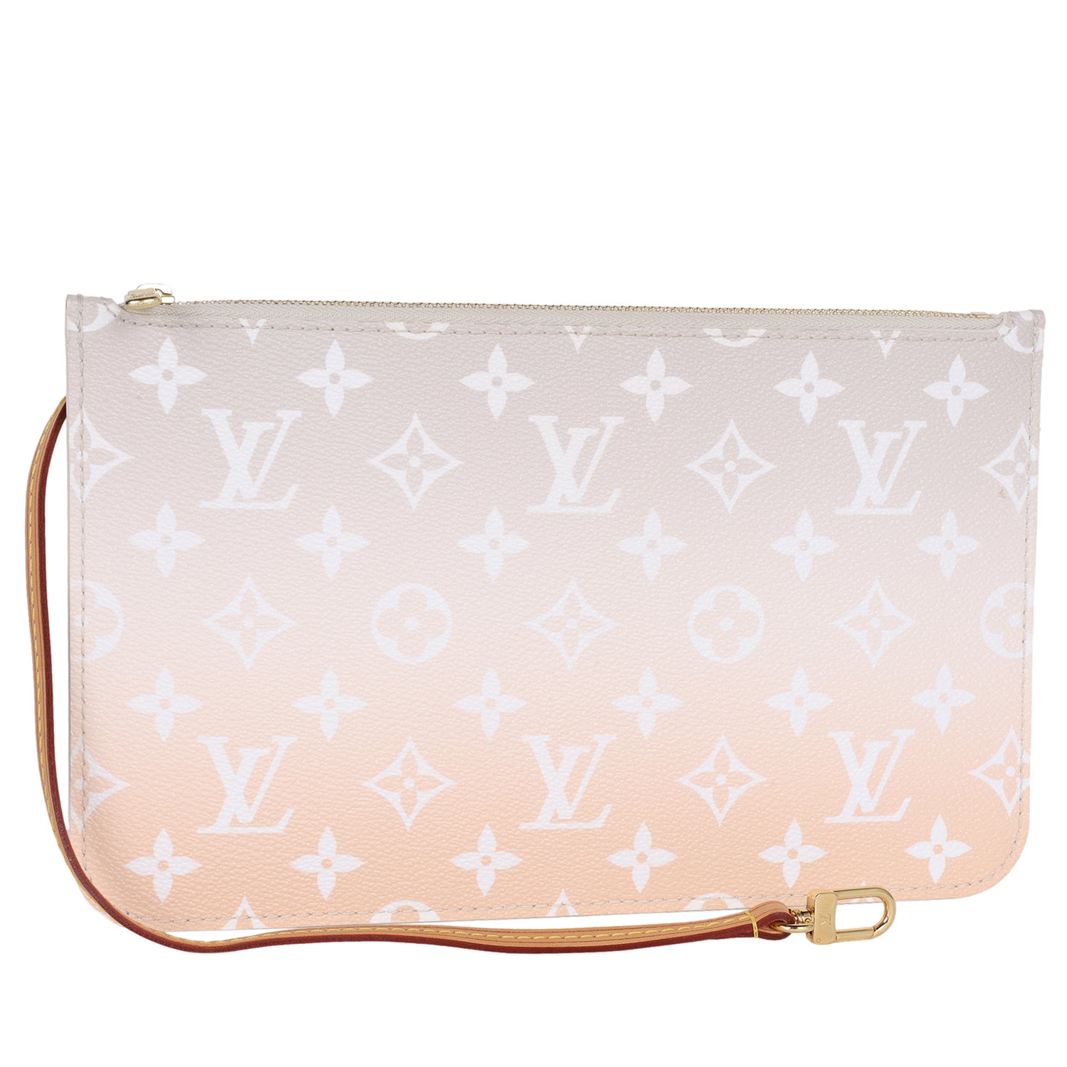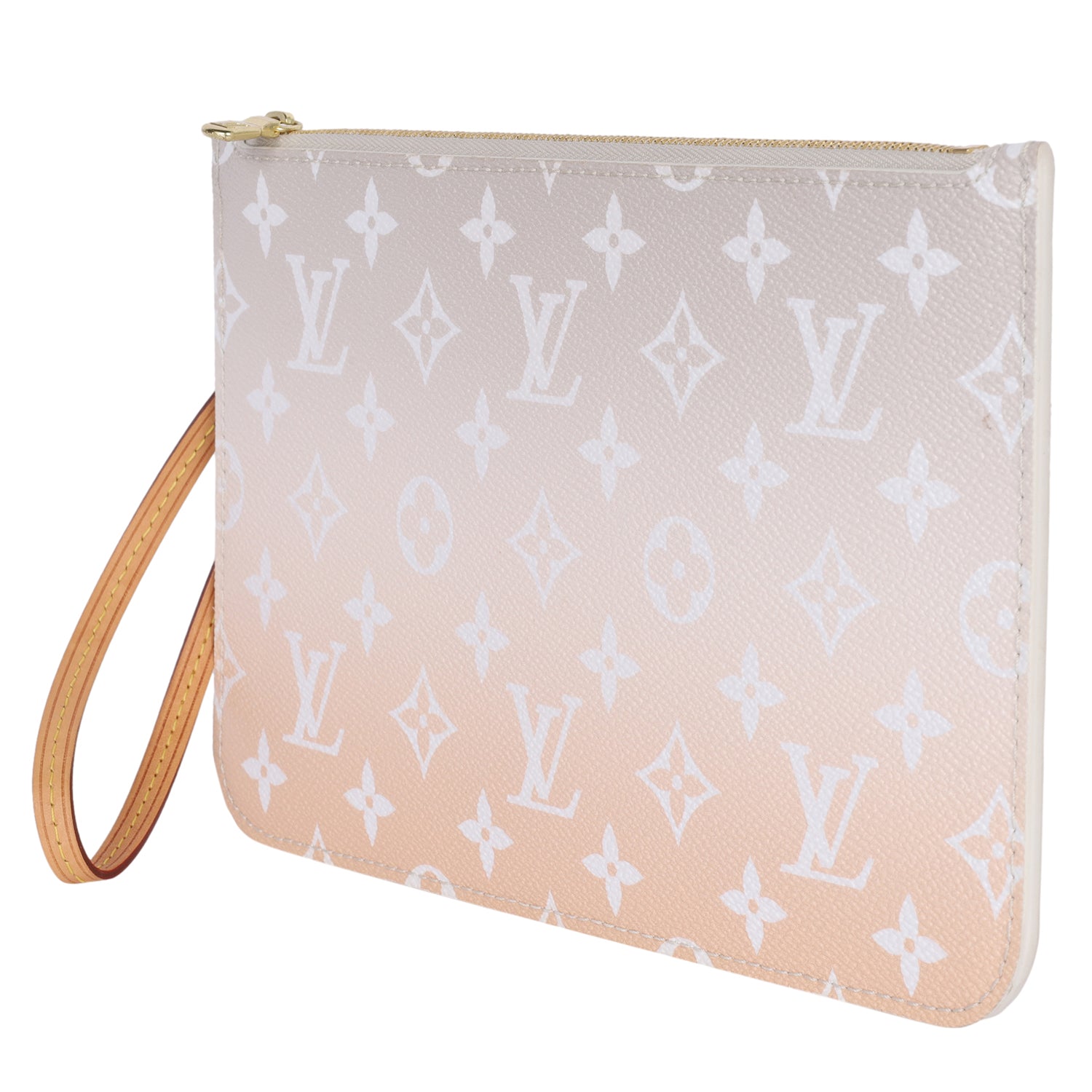 Authentic Louis VuittonĀ Monogram By The Pool Neverfull MM Pochette. This is the perfect bag! It can be used as a clutch, wristlet, wallet, cosmetic bag, grab and go, and more. Features a wristlet strap, which can connect to the D-ring inside a Neverfull as an accessory, or can also be worn as a wristlet. This pochette opens with a polished brass top zipper to a white striped fabric interior.