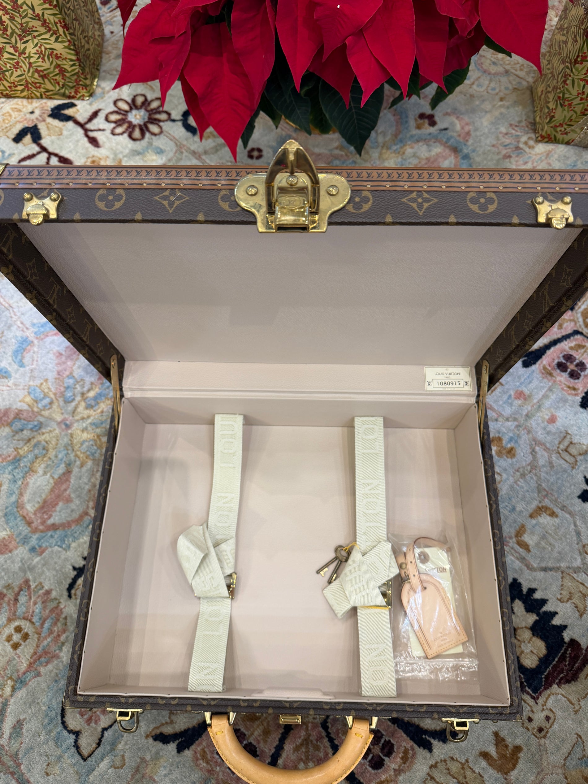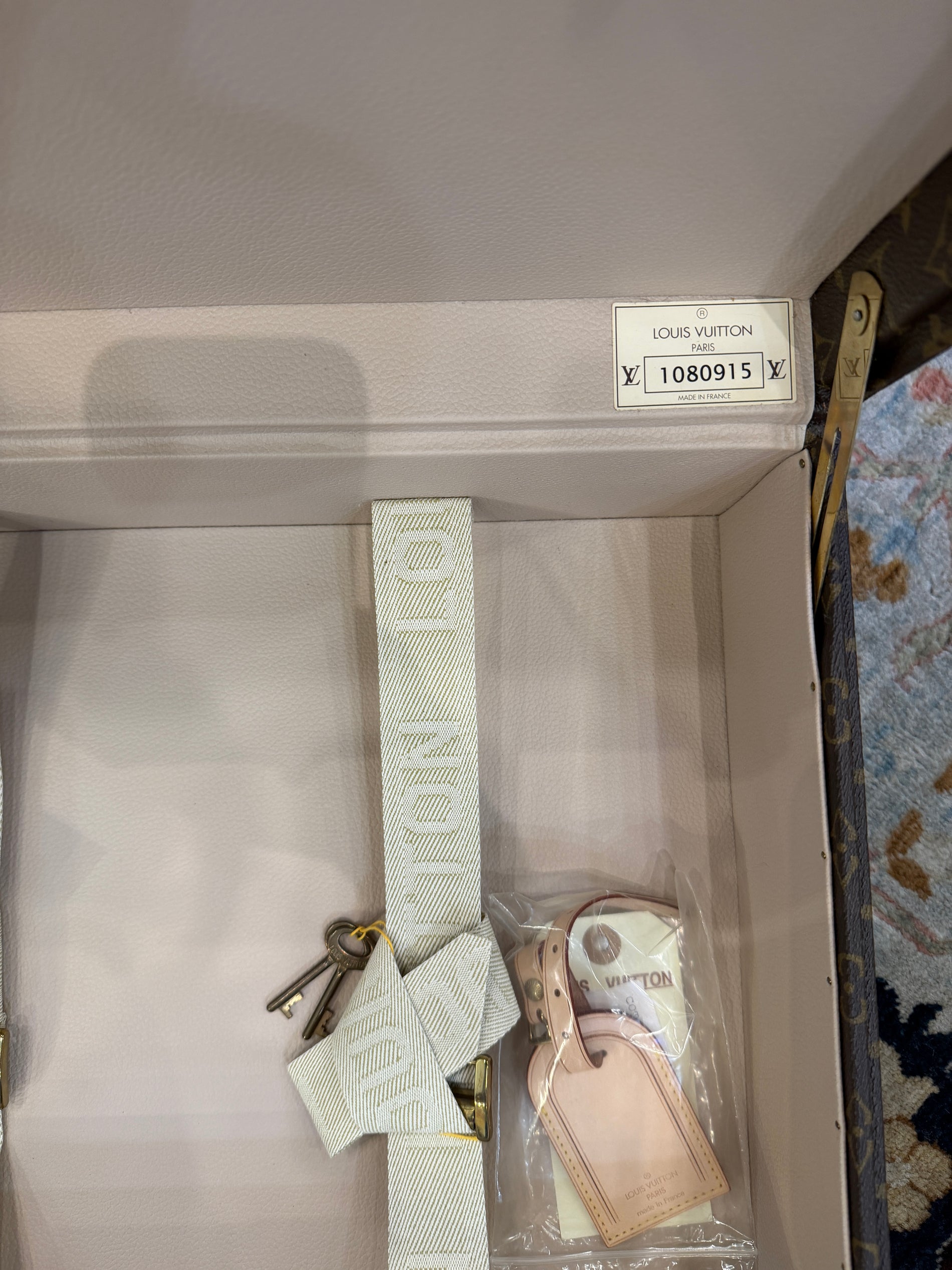 Trunk 2 comes with two keys, date code 1048520, tan cloth interior, 13.6 x 6.25 x 11