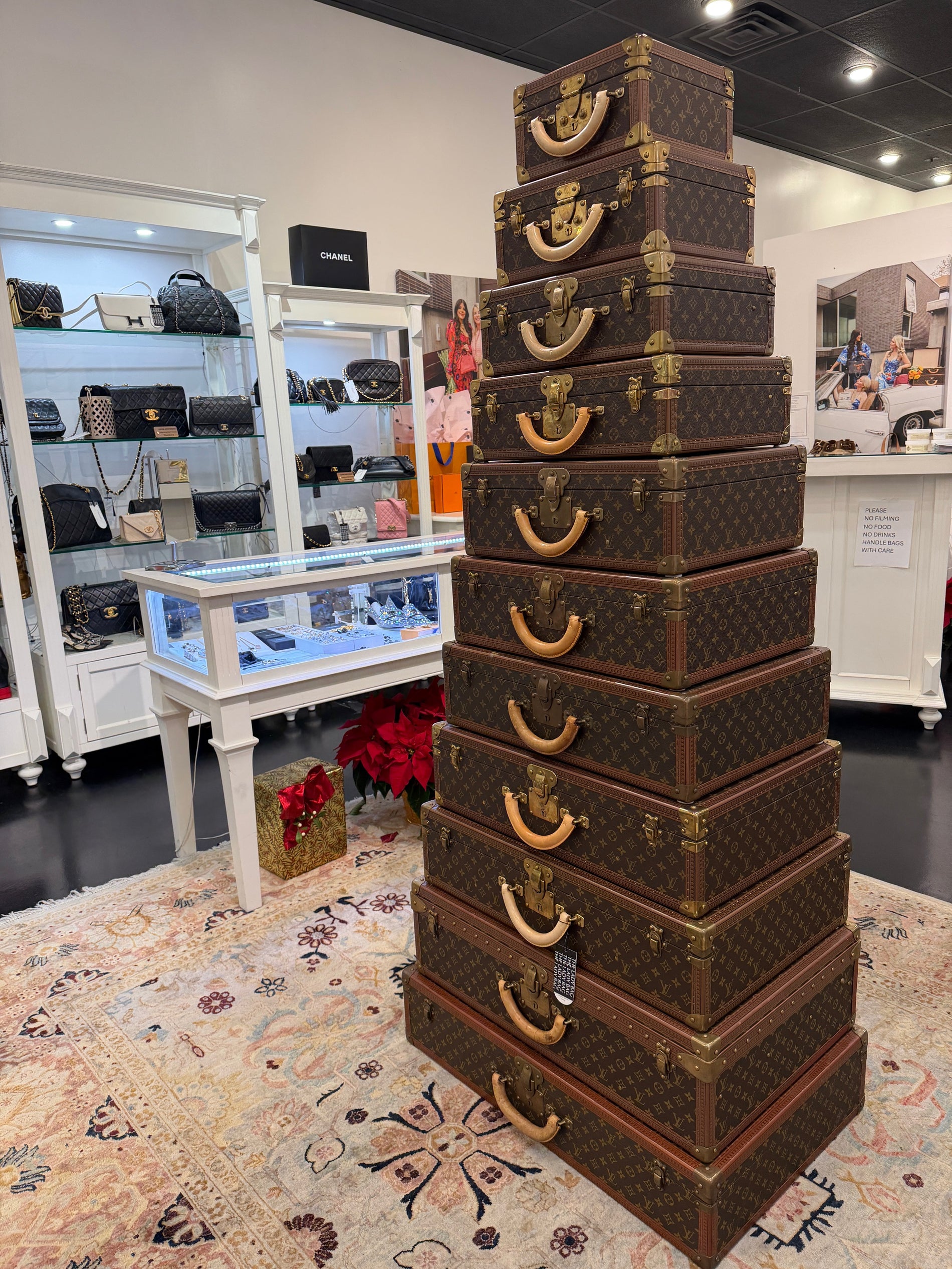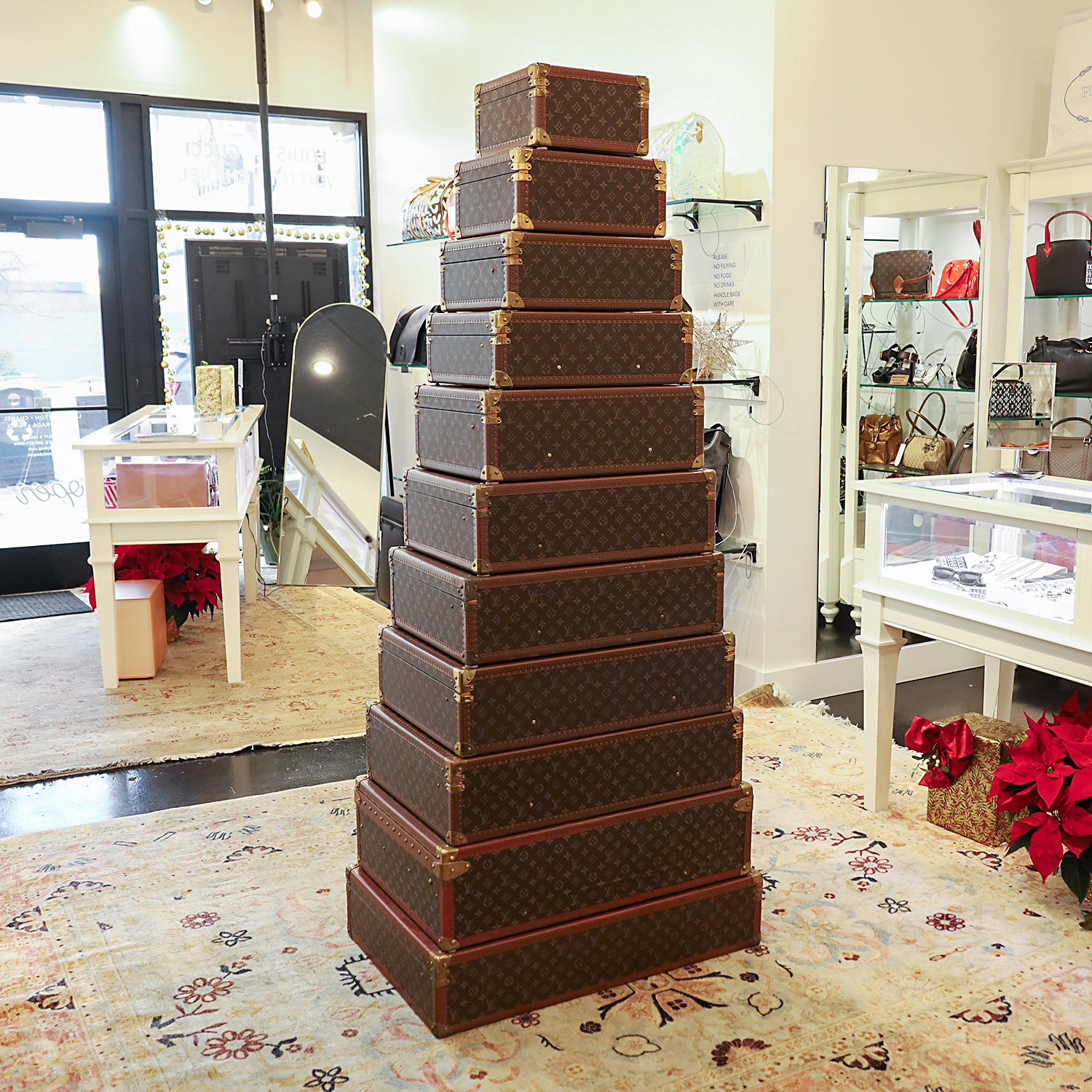 Authentic 11 Piece Stacking Set of Louis Vuitton Monogram Hard Case Trunks. Purchase as a set only. (I do have other sets with fewer pieces) All pieces are in great condition with scuffs, scratch marks, tarnish, and some stains, handles are secure, latches are all secure, some come with accessories. The interiors are clean with normal signs of use and some stains. Most trunks go corner to corner.