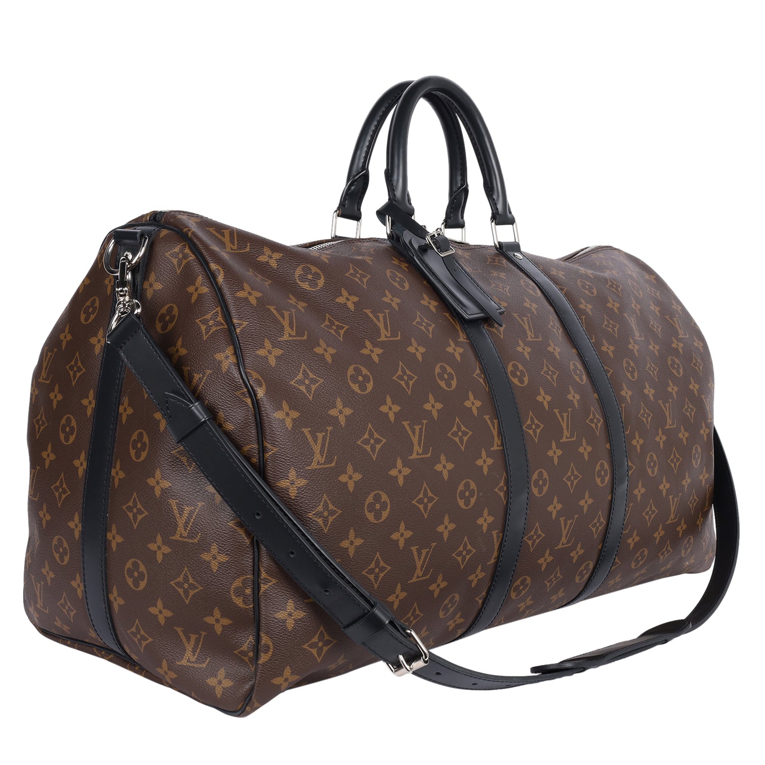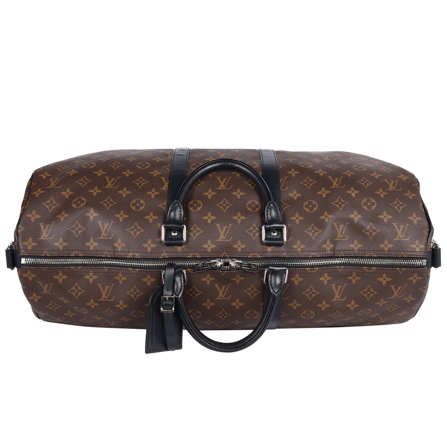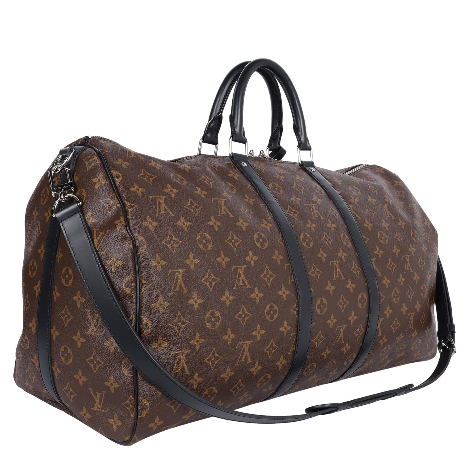 Authentic Louis Vuitton Keepall Monogram Macassar Bandouliere 55 duffle bag. Features monogram coated canvas, black leather accent, dual rolled black handles, black leather leather trim, and silver hardware. Its top zip closure opens to a fabric interior with a zipper pocket and d ring.