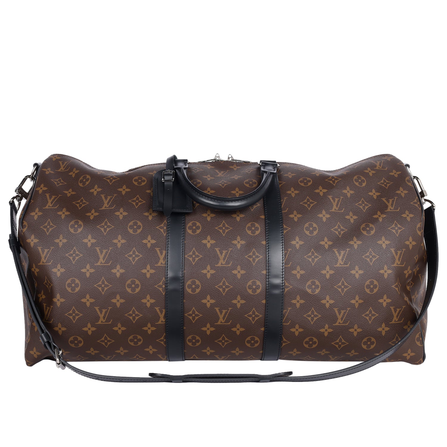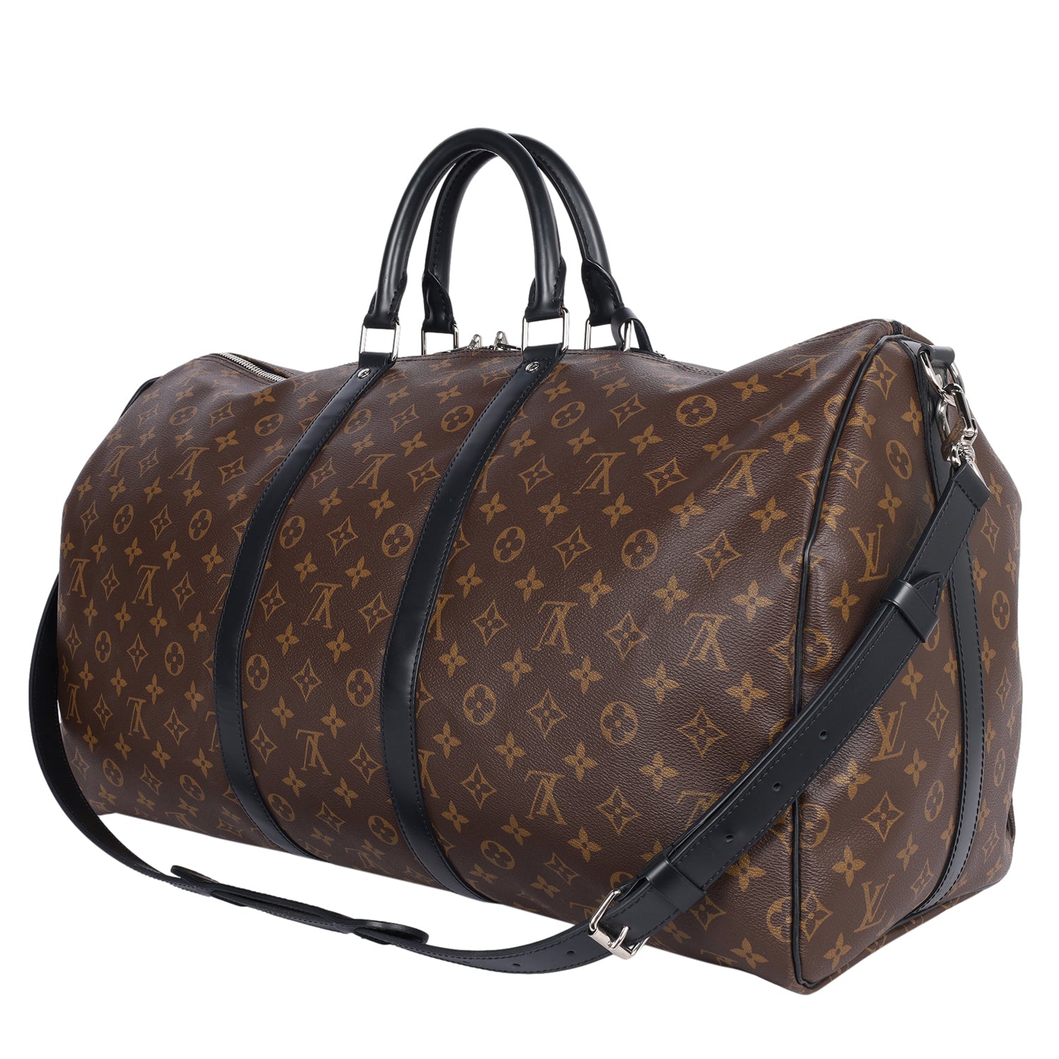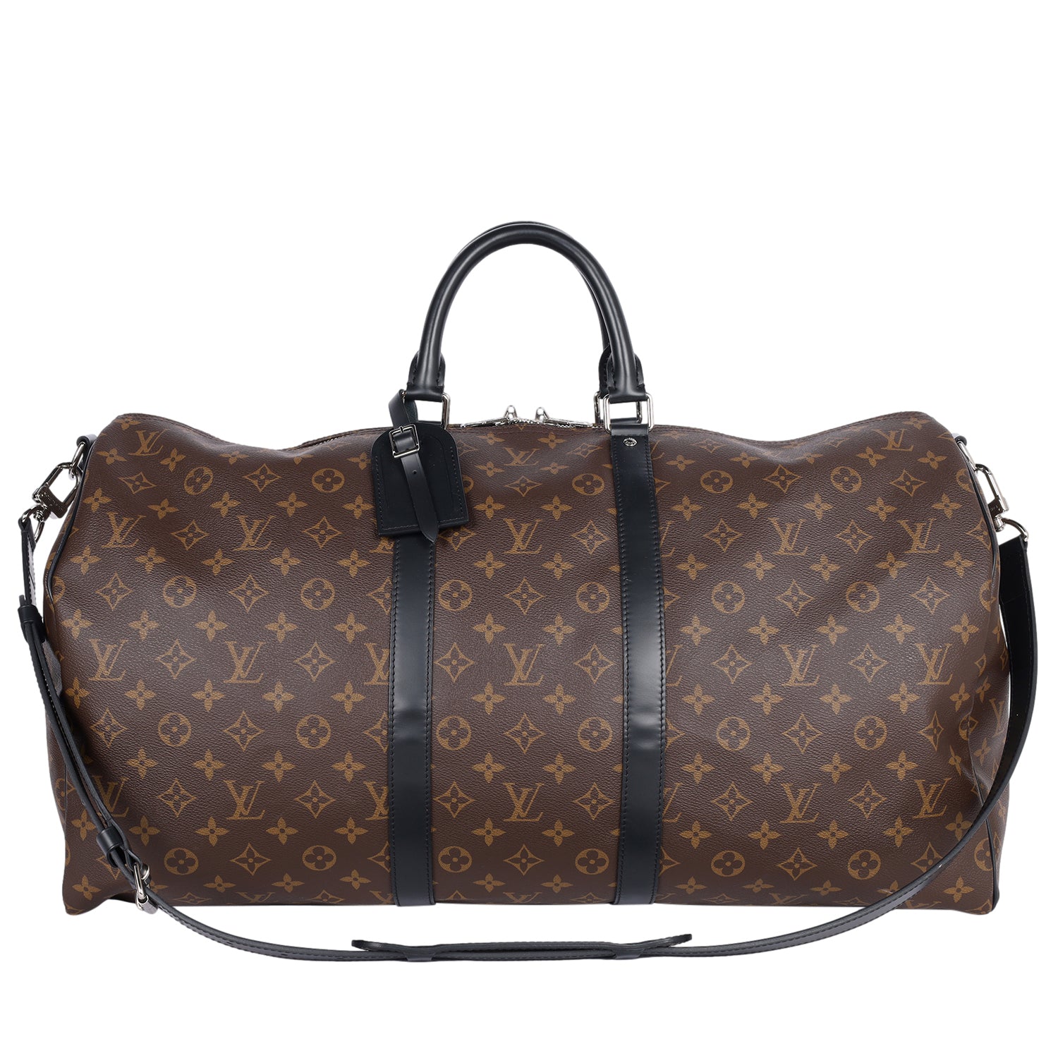 Authentic Louis Vuitton Keepall Monogram Macassar Bandouliere 55 duffle bag. Features monogram coated canvas, black leather accent, dual rolled black handles, black leather leather trim, and silver hardware. Its top zip closure opens to a fabric interior with a zipper pocket and d ring.