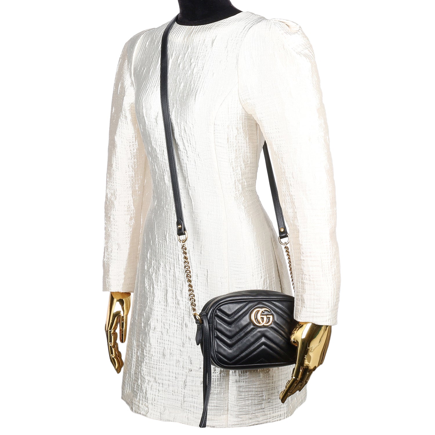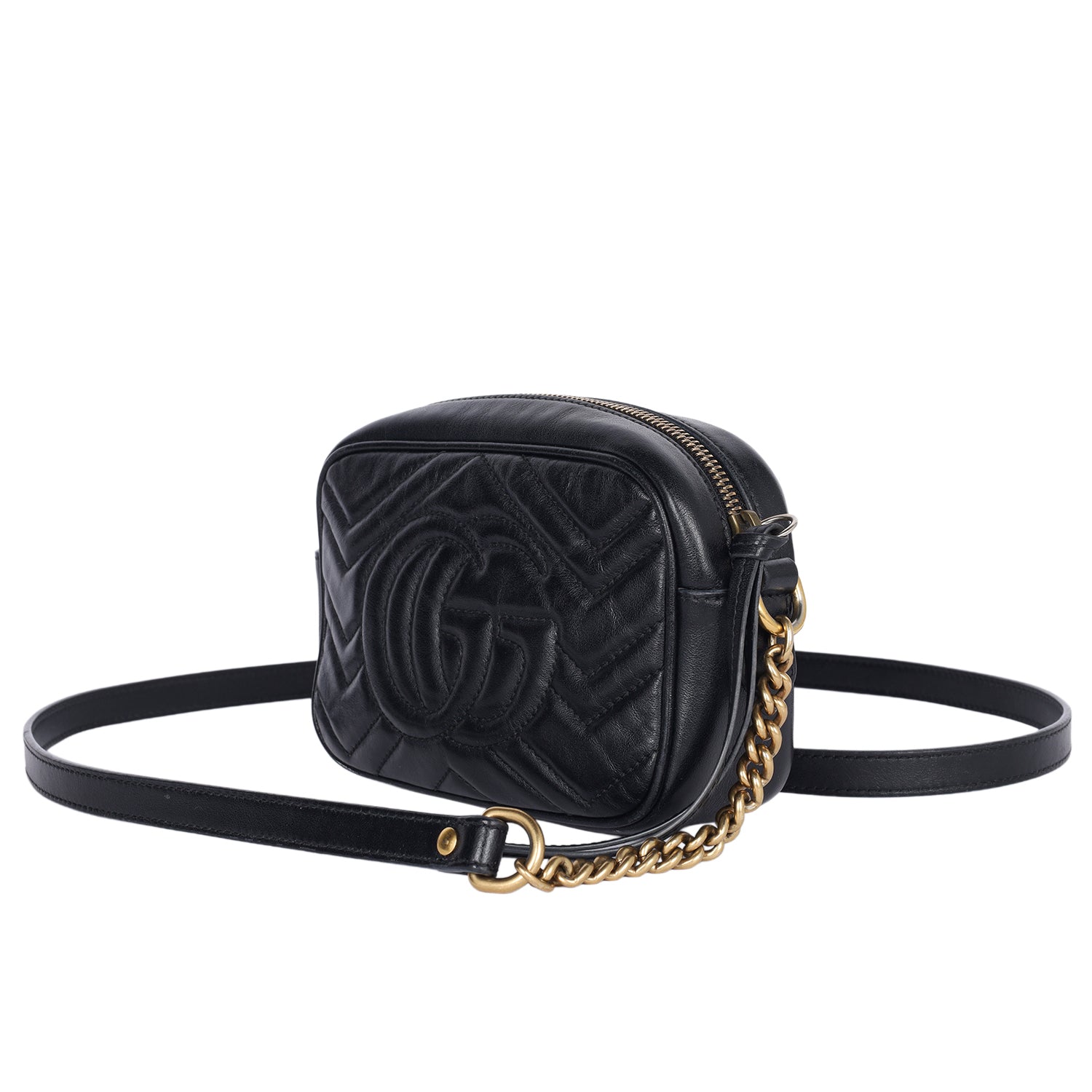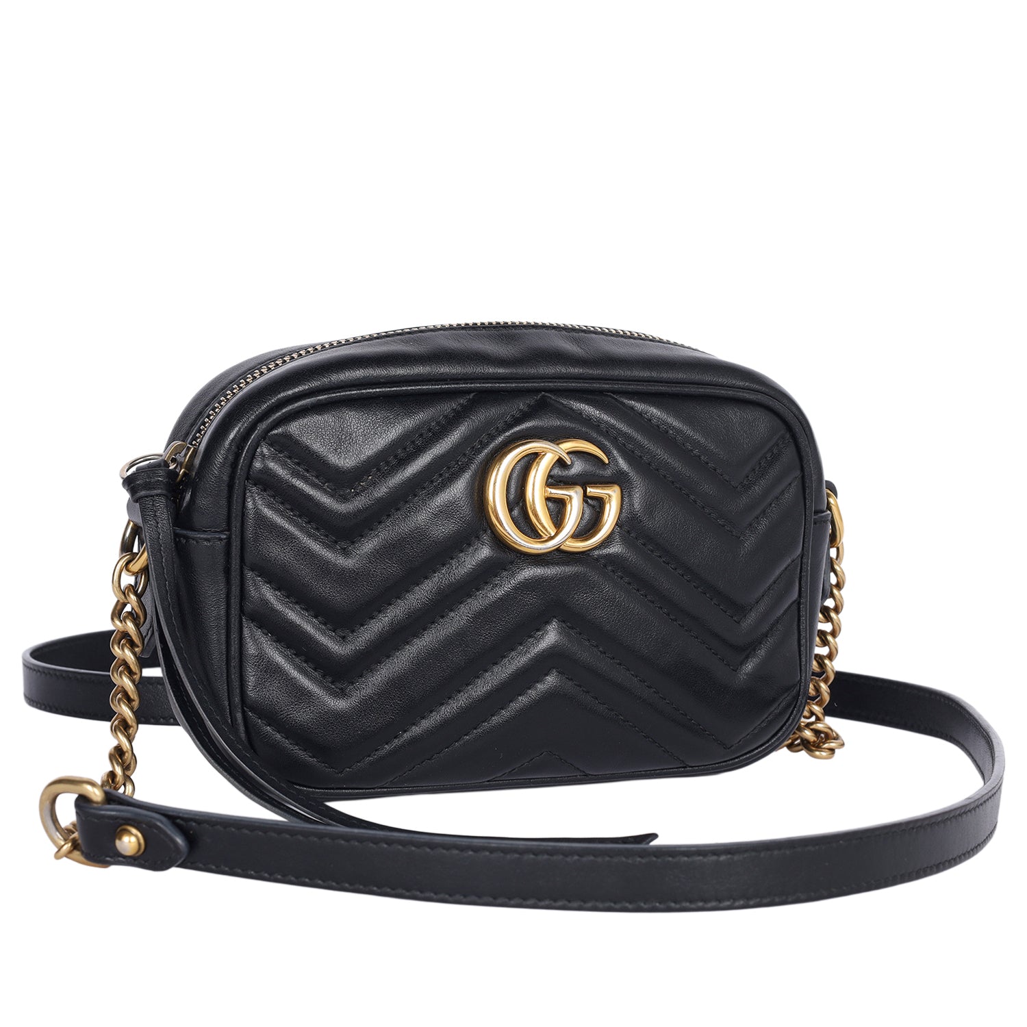 Features Black matelassé chevron leather with GG on the back, antique gold-toned hardware, double G, zipper top closure, microfiber interior lining with slip pocket, crossbody strap,