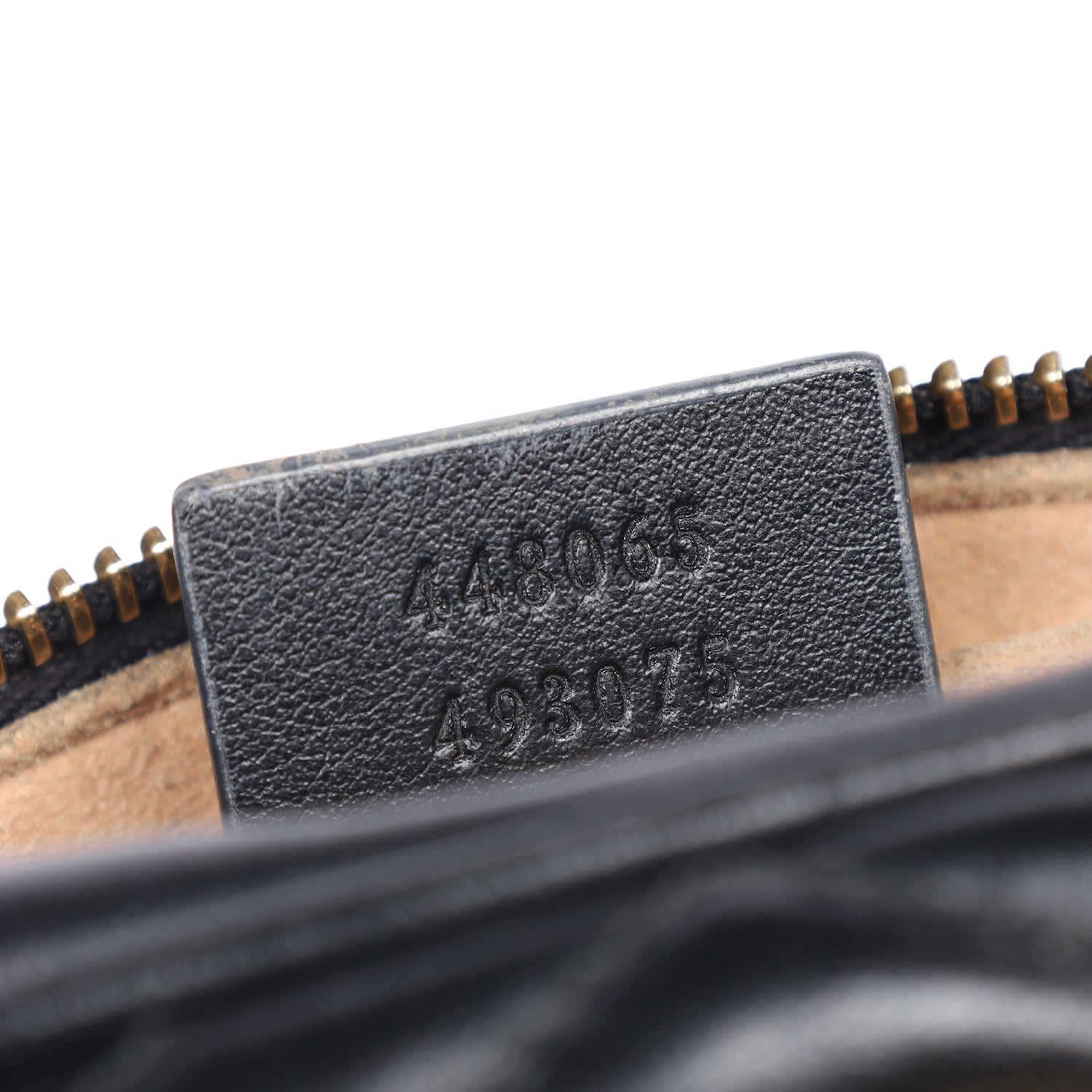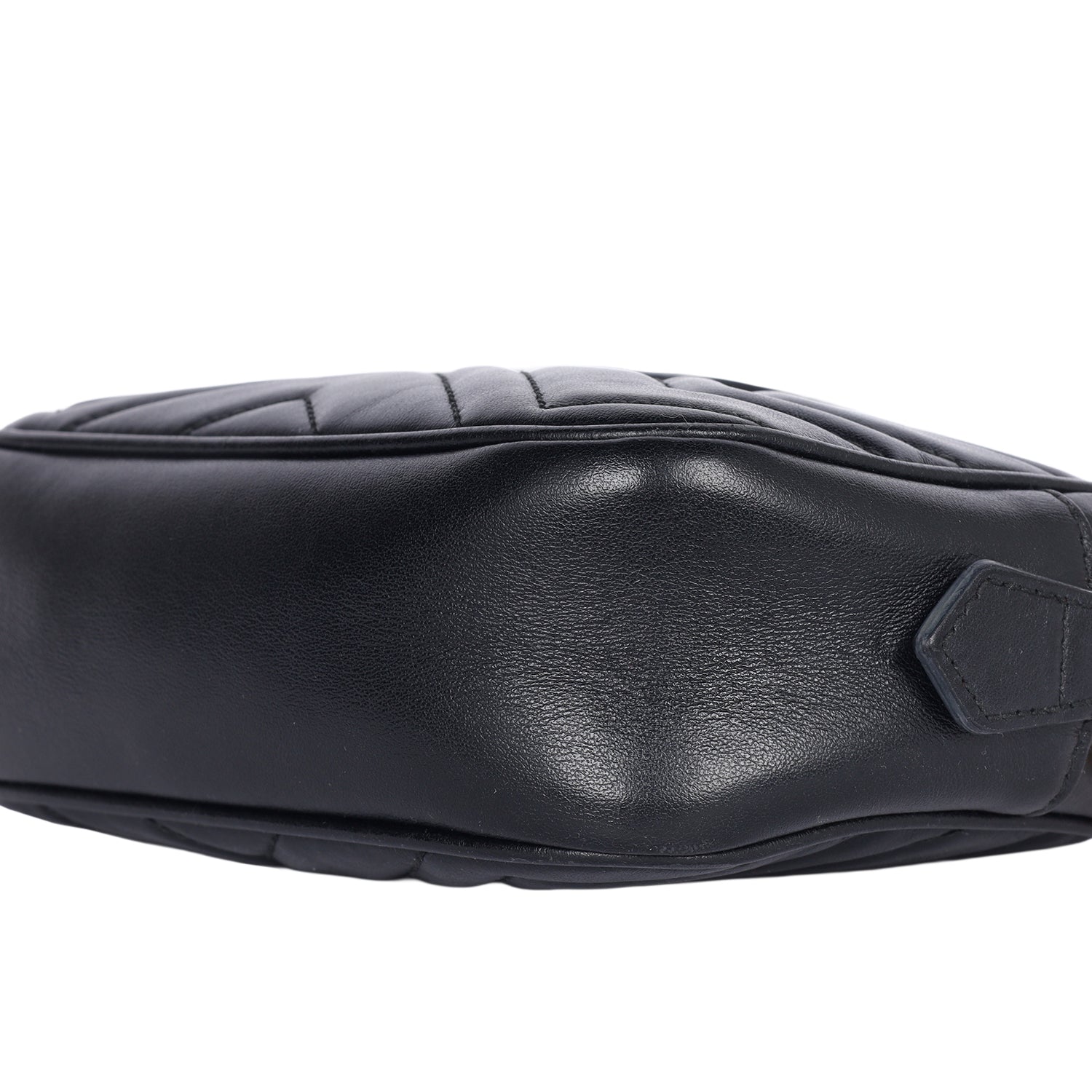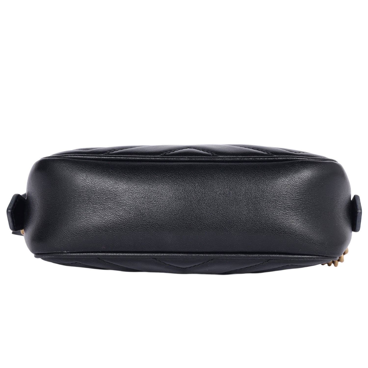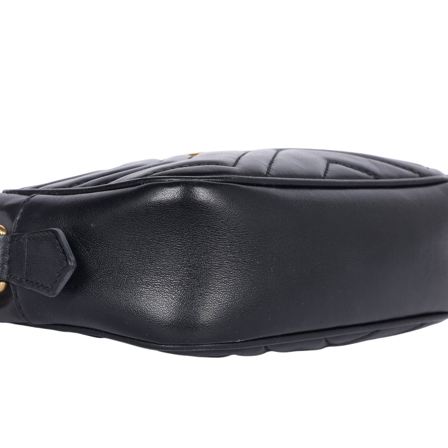 Features Black matelassé chevron leather with GG on the back, antique gold-toned hardware, double G, zipper top closure, microfiber interior lining with slip pocket, crossbody strap,