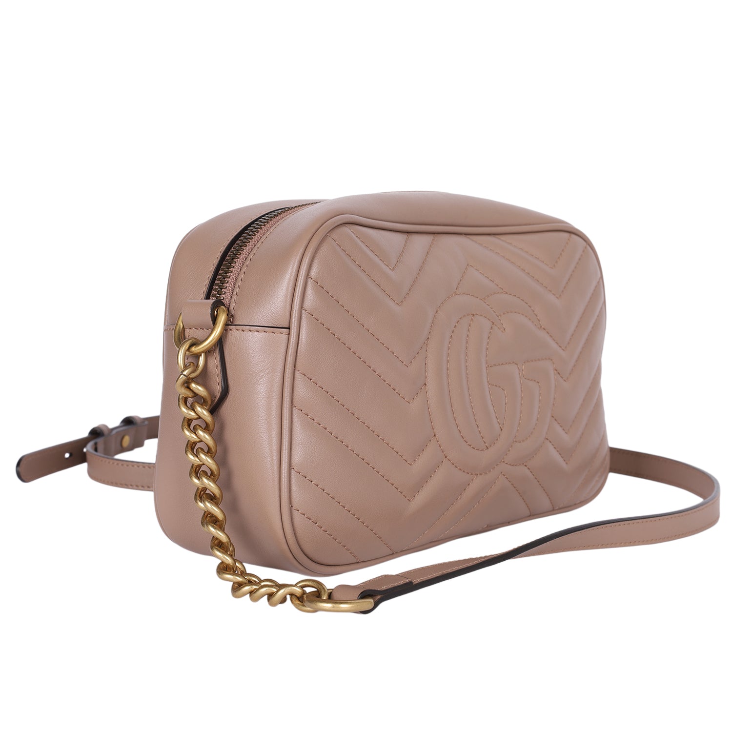 Authentic Gucci GG Marmont shoulder cross body bag in Taupe. This classic Gucci cross body bag makes a perfect everyday bag. Features Gucci GG logo on the front, gold hardware, zipper top closure, roomy interior with slip pocket. This elegant bag will be your favorite bag as it easily holds all your daily essentials in style.
