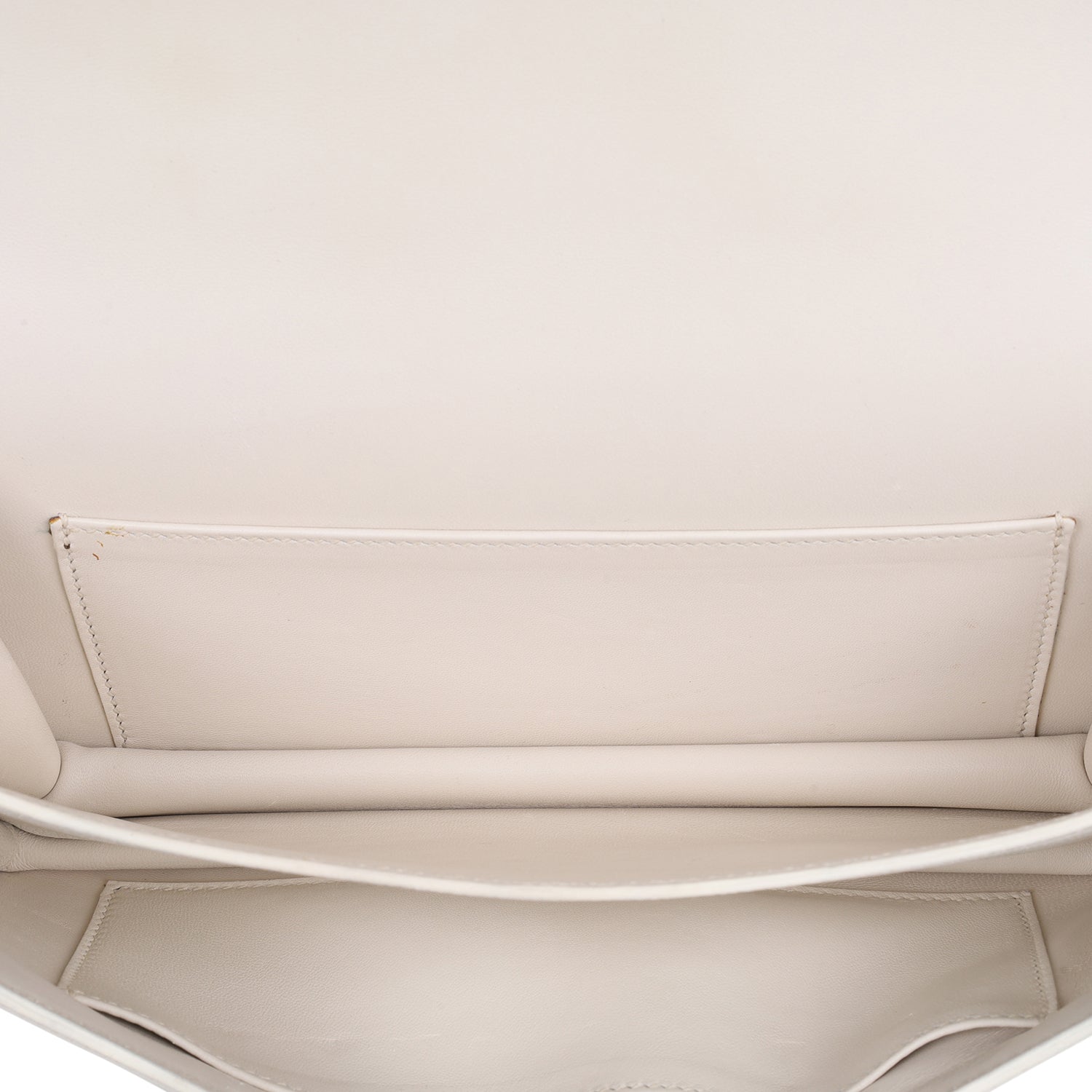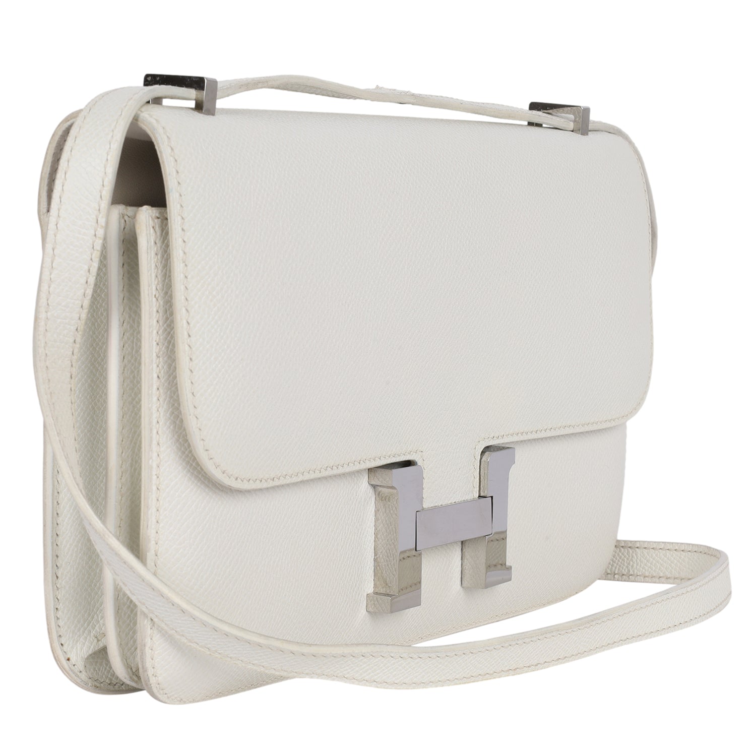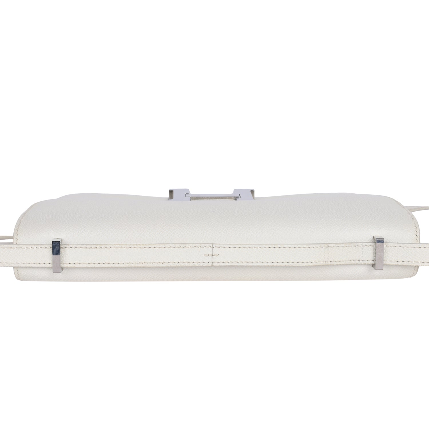 Features epsom calfskin leather in white, front flap closure with Hermes buckle snap closure, extra-long double loop shoulder strap, the front flap opens to a white compact partitioned leather interior with flat pockets. Let your bag make your statement with this gorgeous Hermes bag. Perfect for day or evening, only from Hermes!