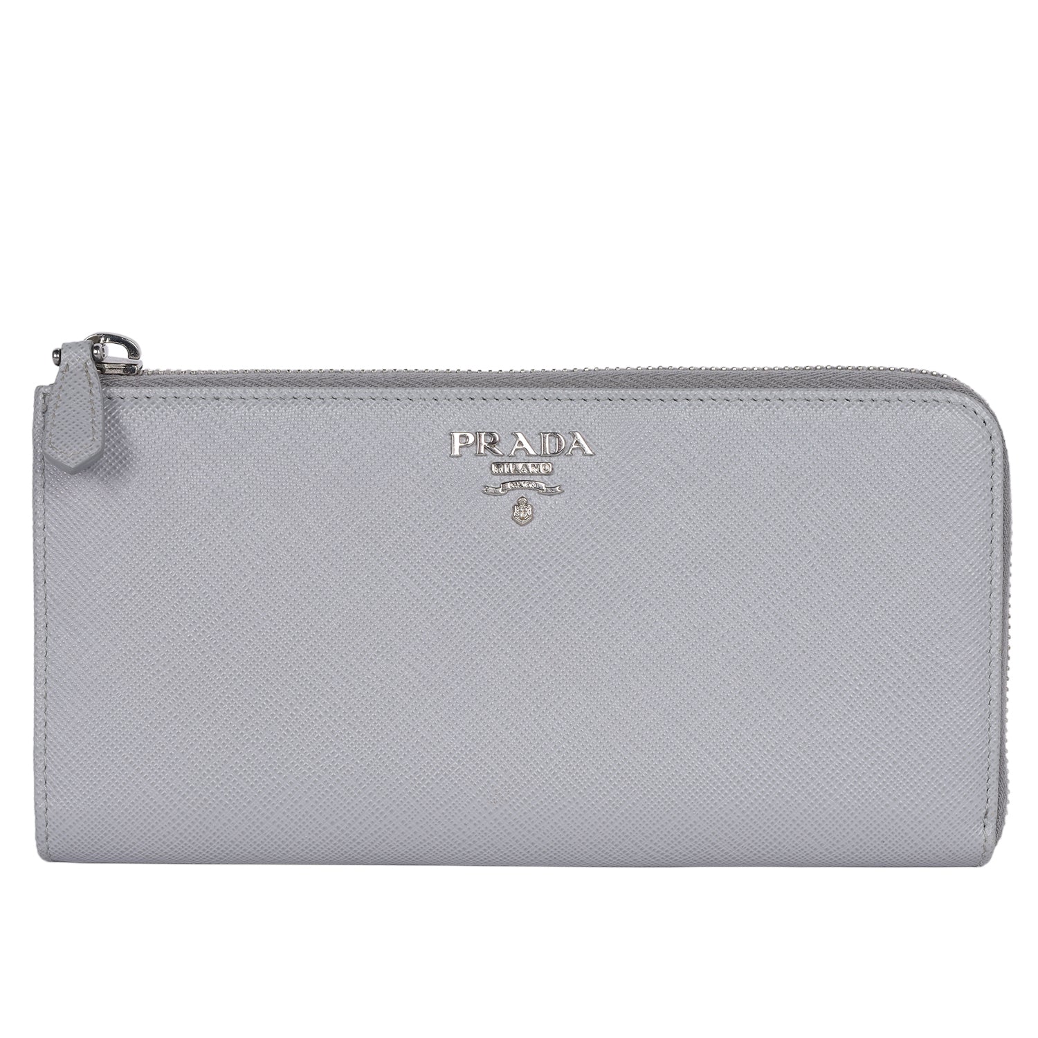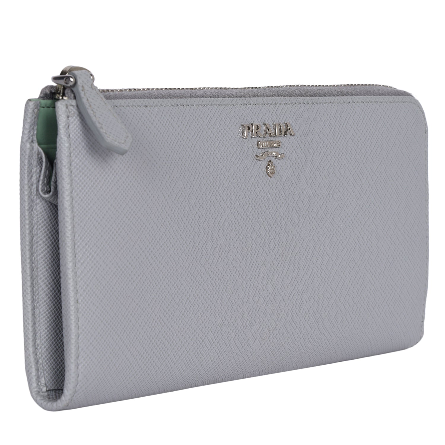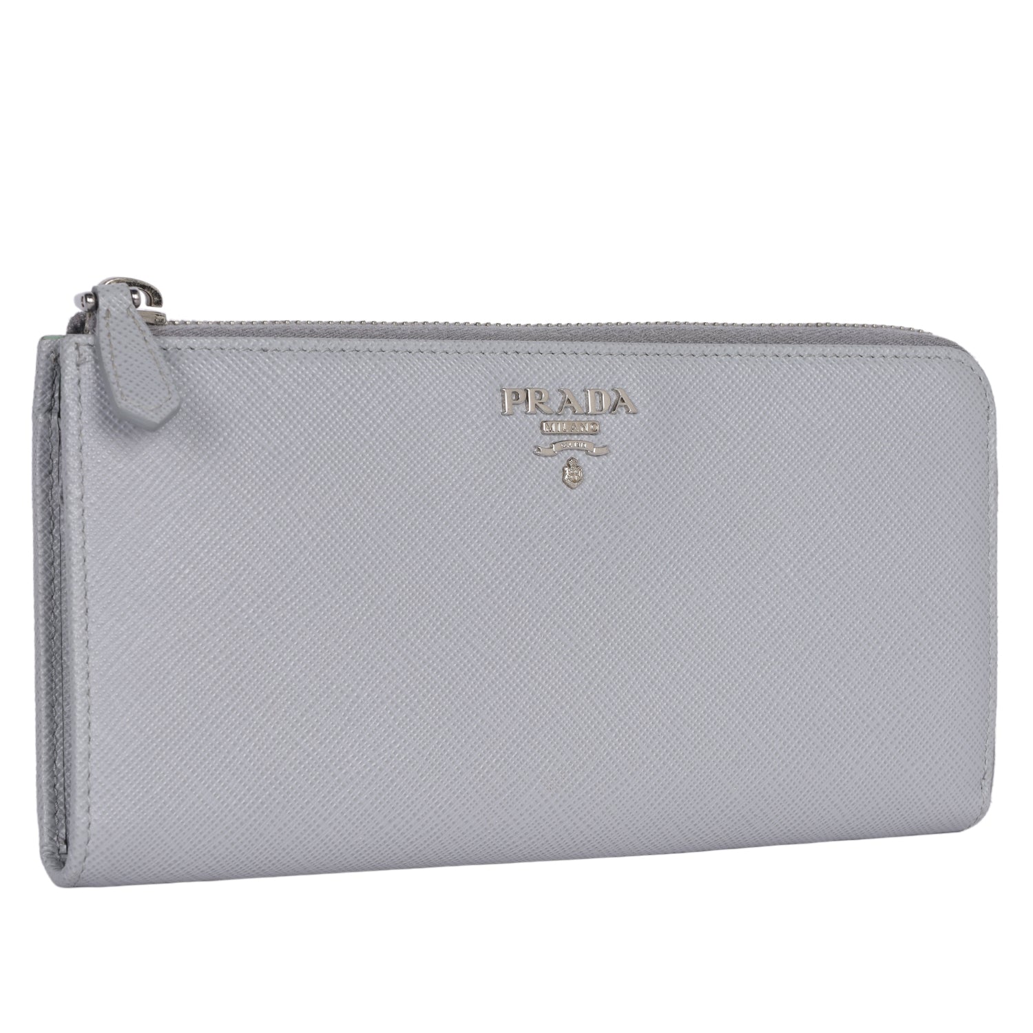 Authentic Prada Large Saffiano Triangle Half Zip Leather Wallet in Grey. The saffiano leather wallet has Prada lettering with zip closure, rear zipper pocket, reveals 8 card slots, pockets and a zippered compartment for coins.