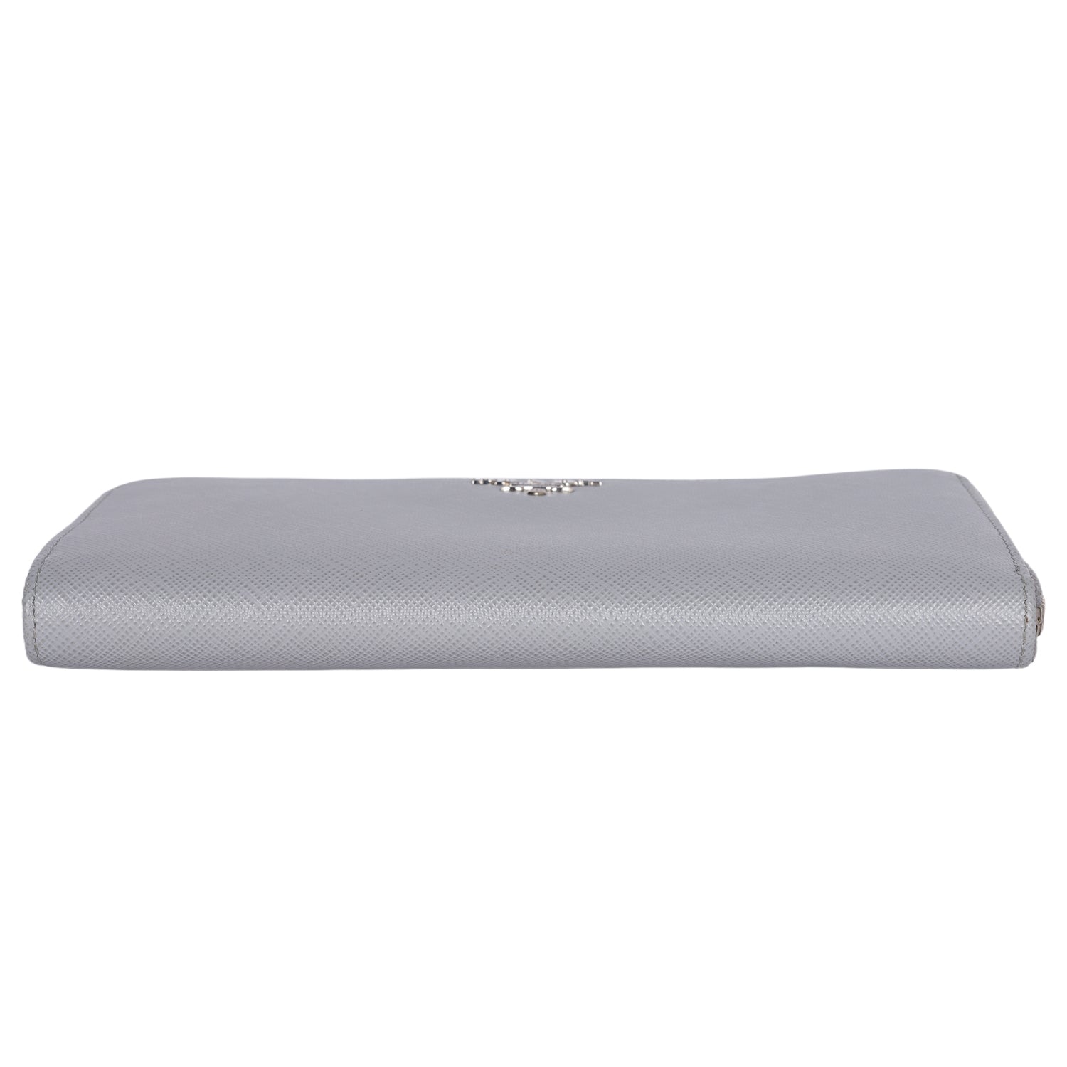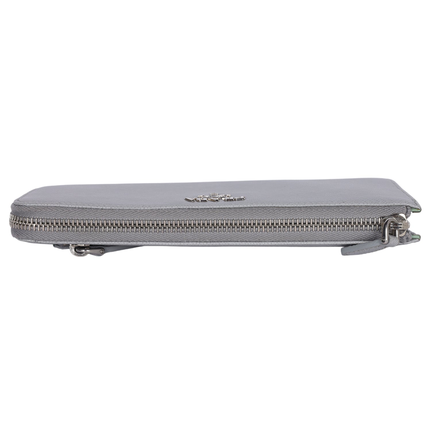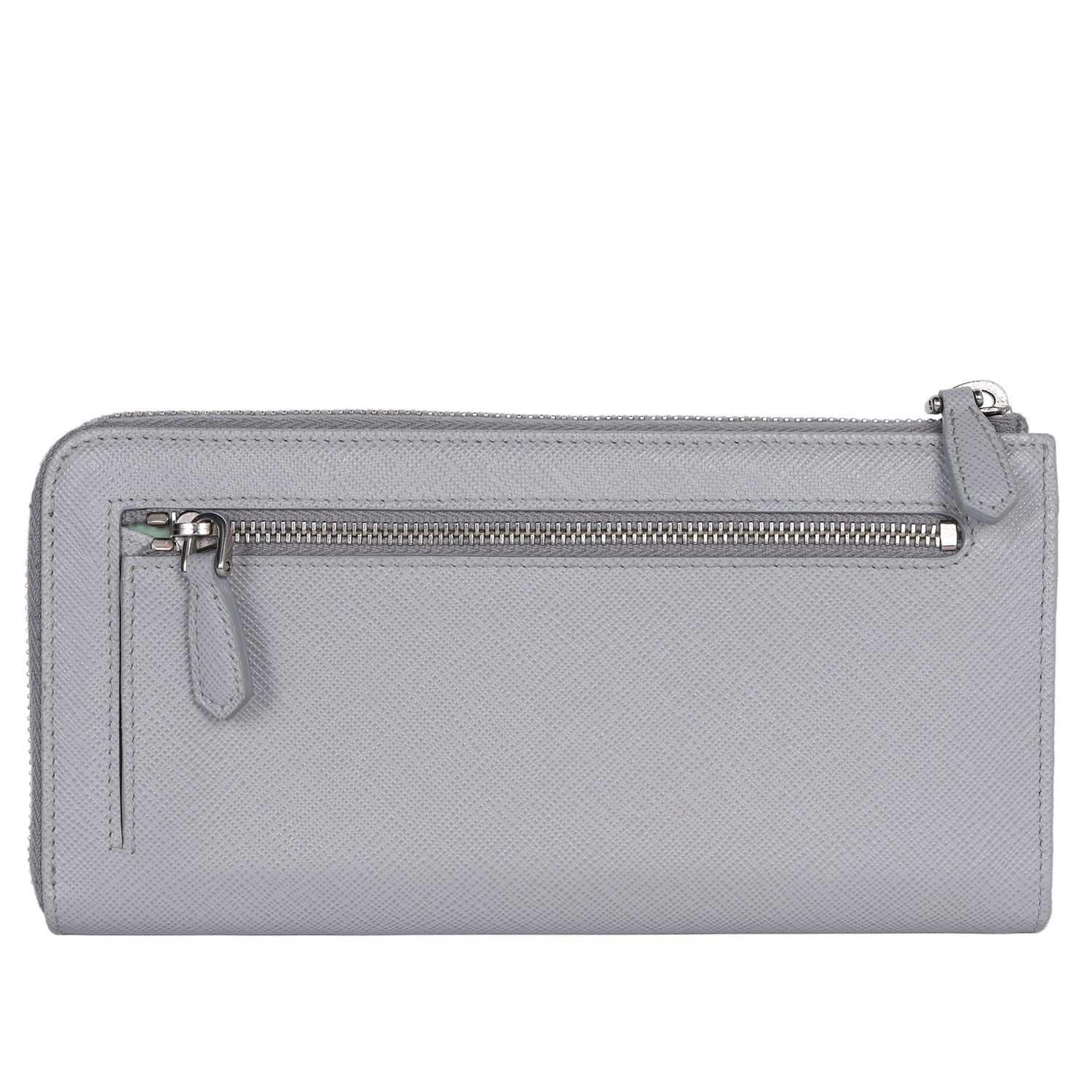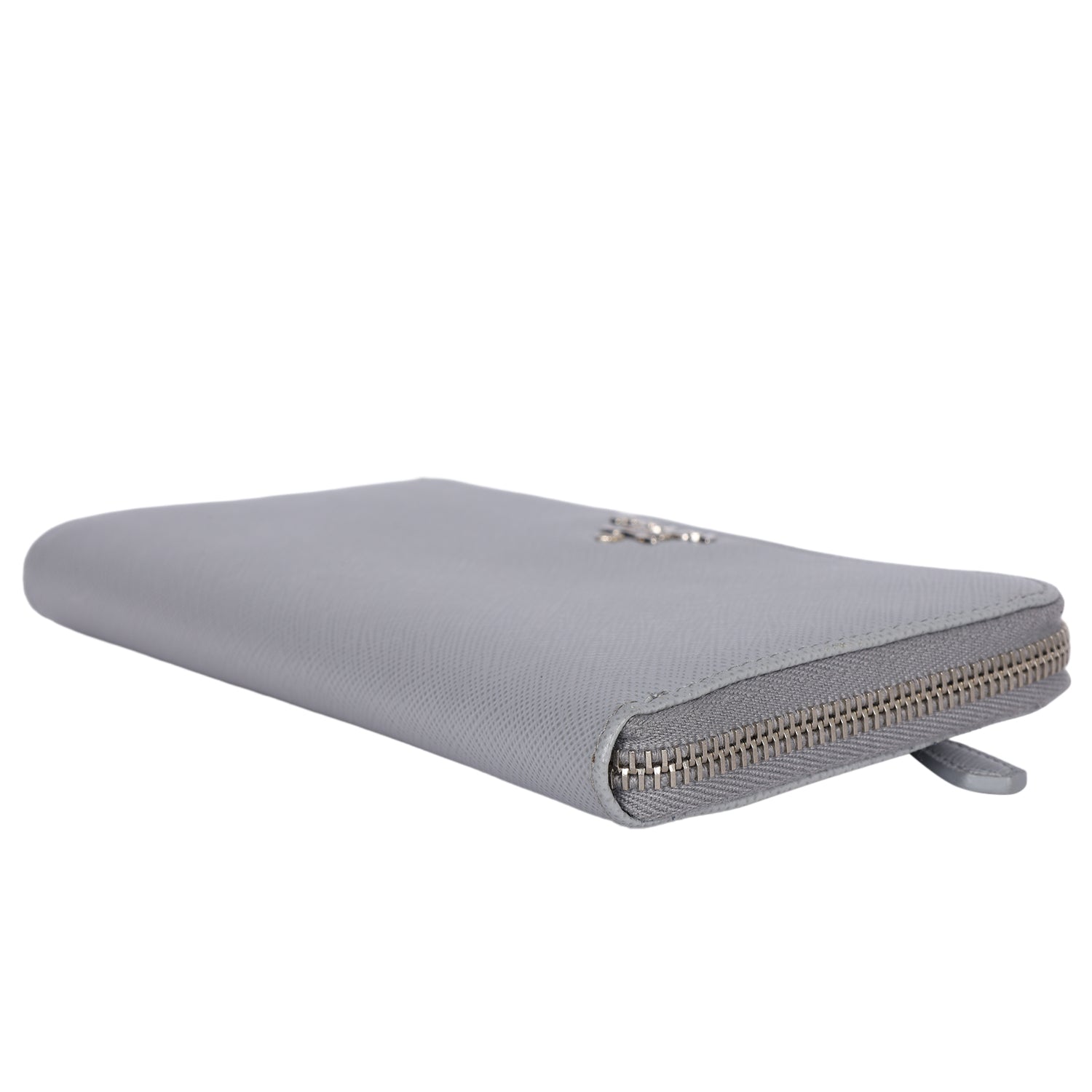 Authentic Prada Large Saffiano Triangle Half Zip Leather Wallet in Grey. The saffiano leather wallet has Prada lettering with zip closure, rear zipper pocket, reveals 8 card slots, pockets and a zippered compartment for coins.