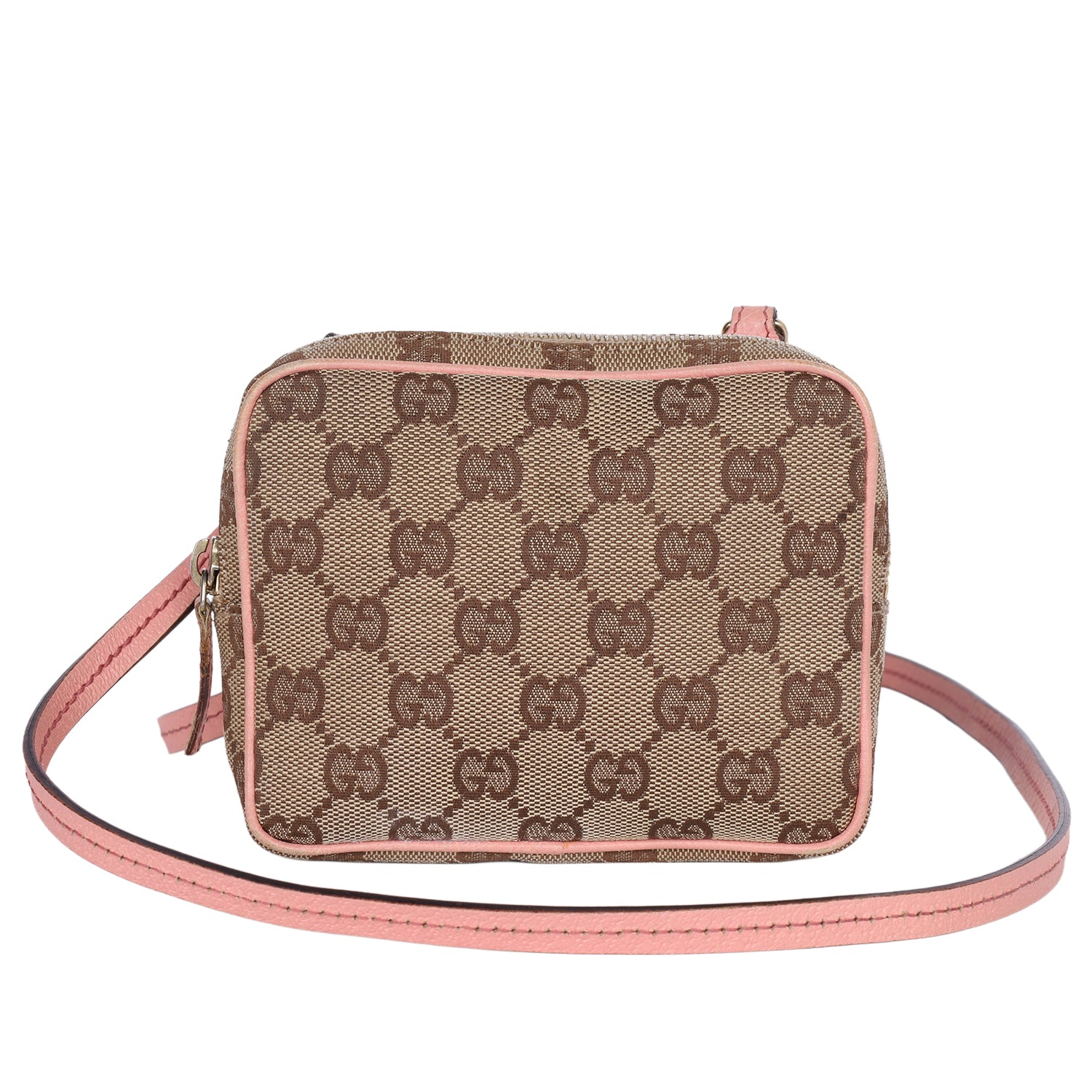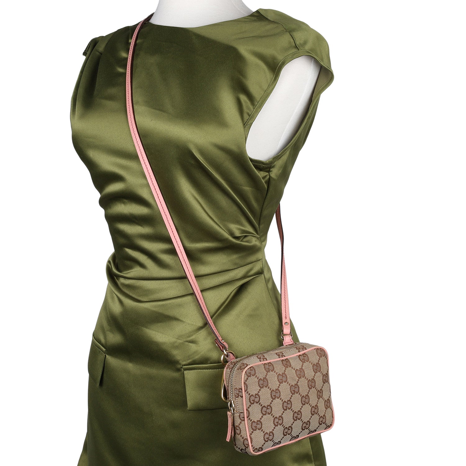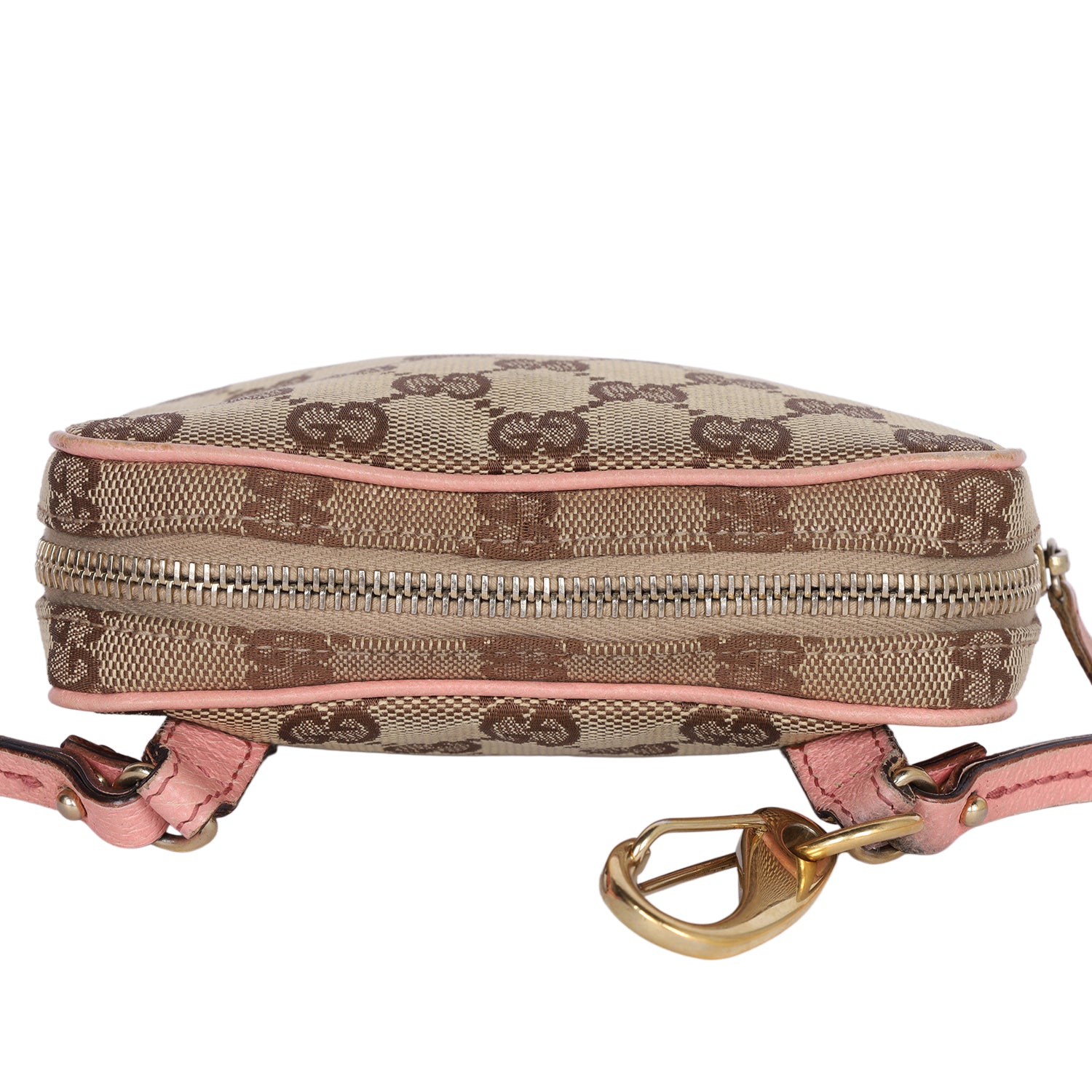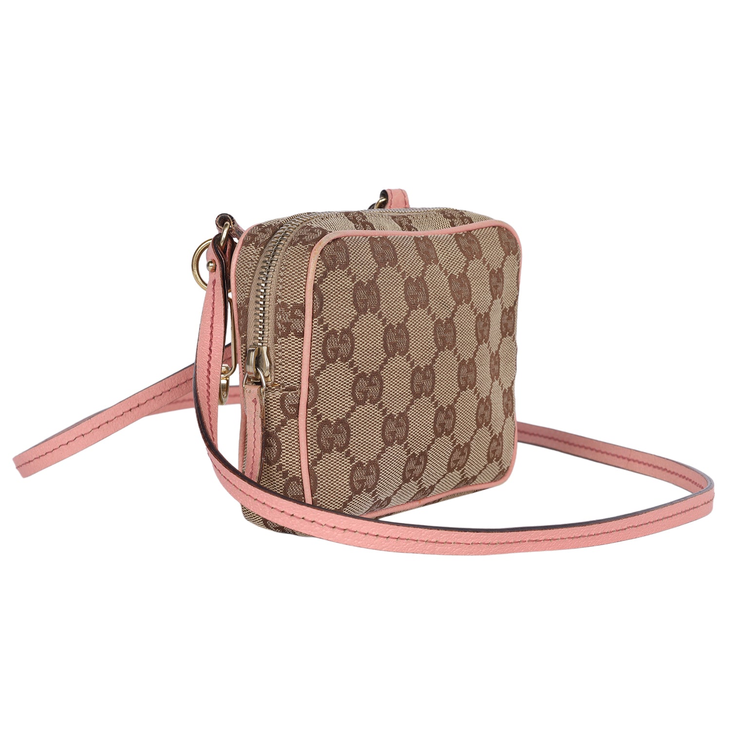 Authentic Gucci GG Canvas Bree Crossbody Bag. Features GG brown canvas with pink leather accents, zipper top closure, brown interior, key ring, pink leather strap.