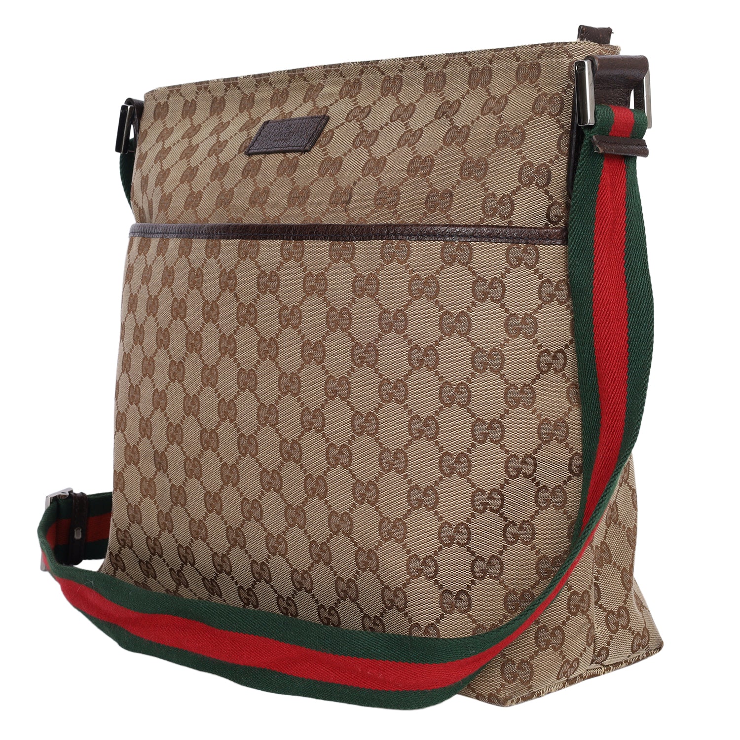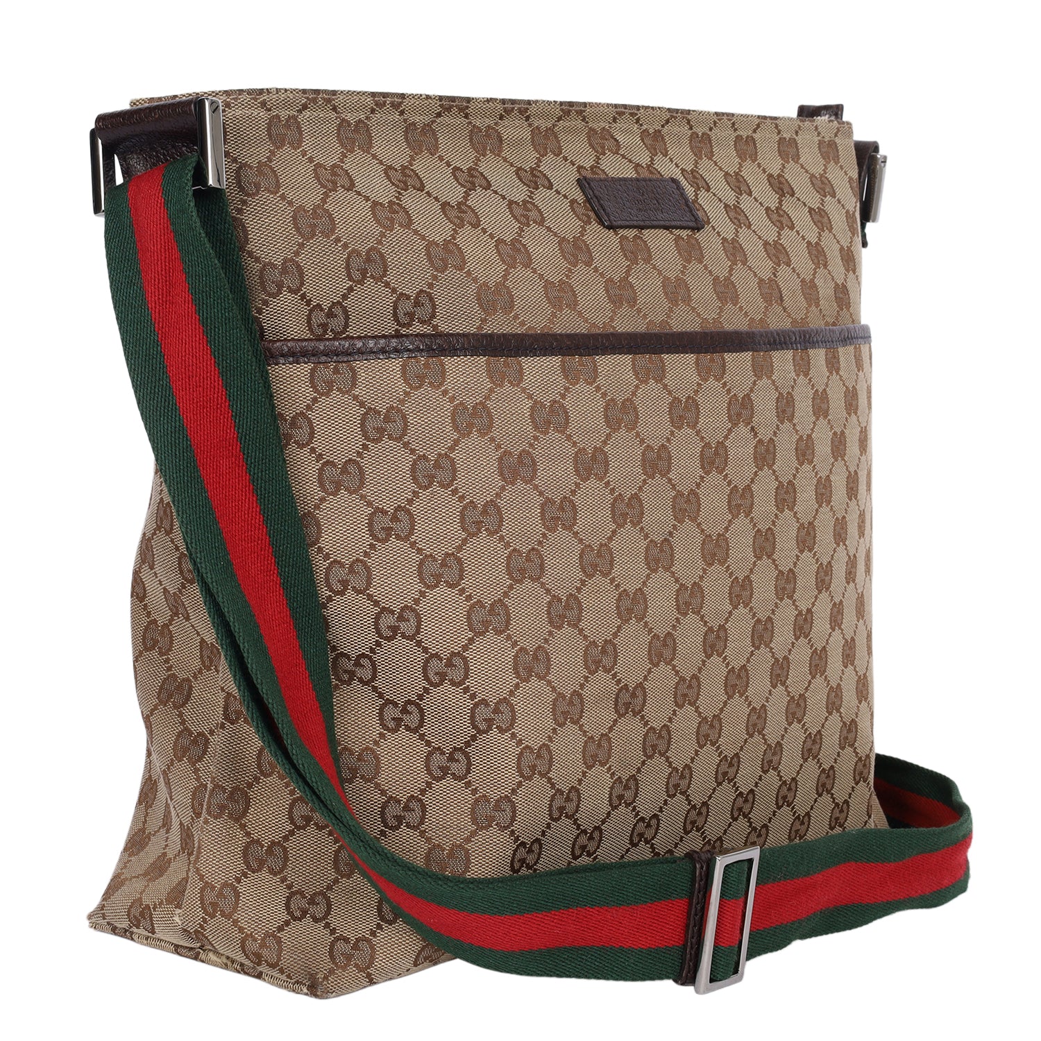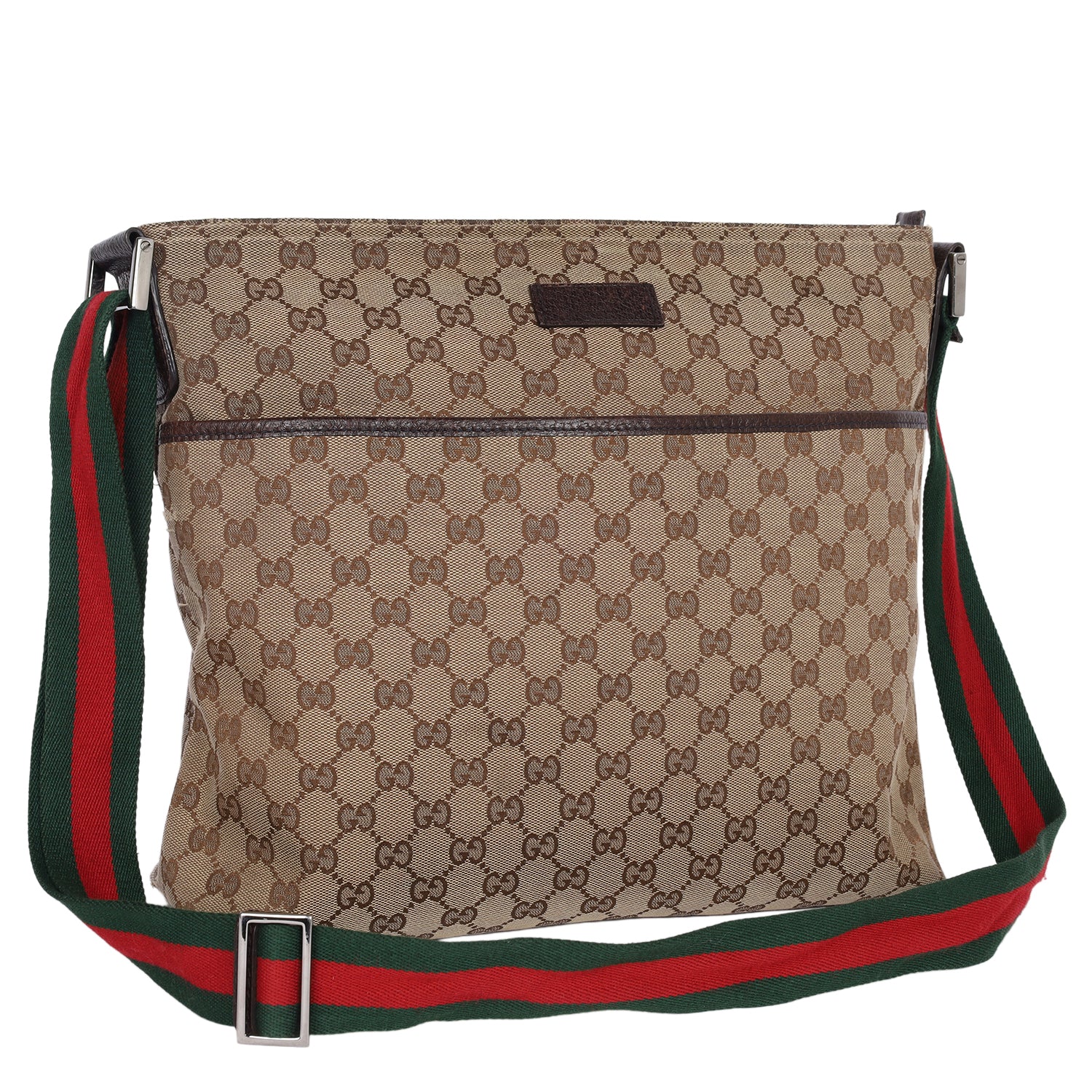 Authentic Gucci Monogram Web Medium Flat Messenger bag. This chic Gucci web bag is a must-have for Gucci lovers. The roomy interior is ideal for everyday necessities or travel with the sophisticated style of Gucci. You won't want to pass up owning this fantastic bag. Features classic GG monogram canvas, zipper top closure, front slip pocket, brown leather trim, a green and red canvas web shoulder strap, and silver hardware. The bag opens to a dark brown fabric interior with zipper and patch pockets.