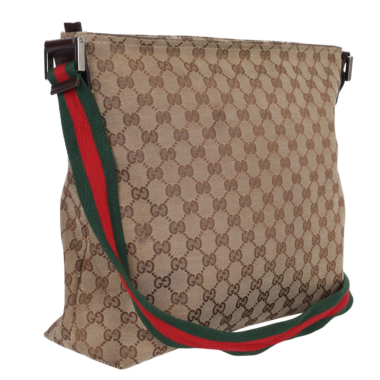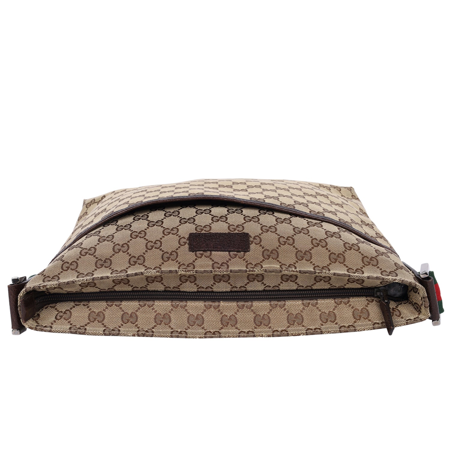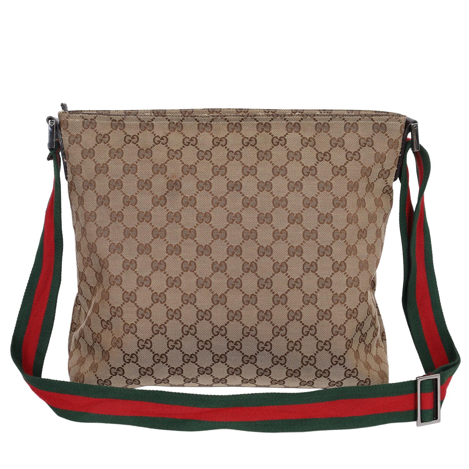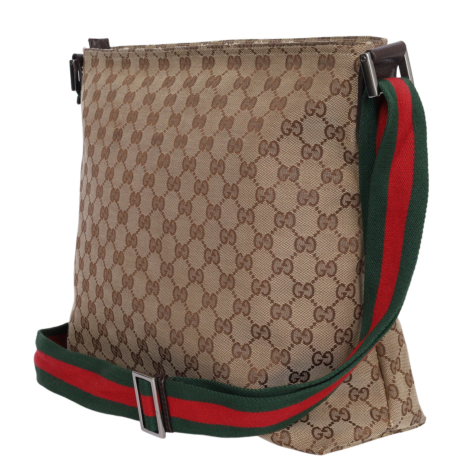 Authentic Gucci Monogram Web Medium Flat Messenger bag. This chic Gucci web bag is a must-have for Gucci lovers. The roomy interior is ideal for everyday necessities or travel with the sophisticated style of Gucci. You won't want to pass up owning this fantastic bag. Features classic GG monogram canvas, zipper top closure, front slip pocket, brown leather trim, a green and red canvas web shoulder strap, and silver hardware. The bag opens to a dark brown fabric interior with zipper and patch pockets.