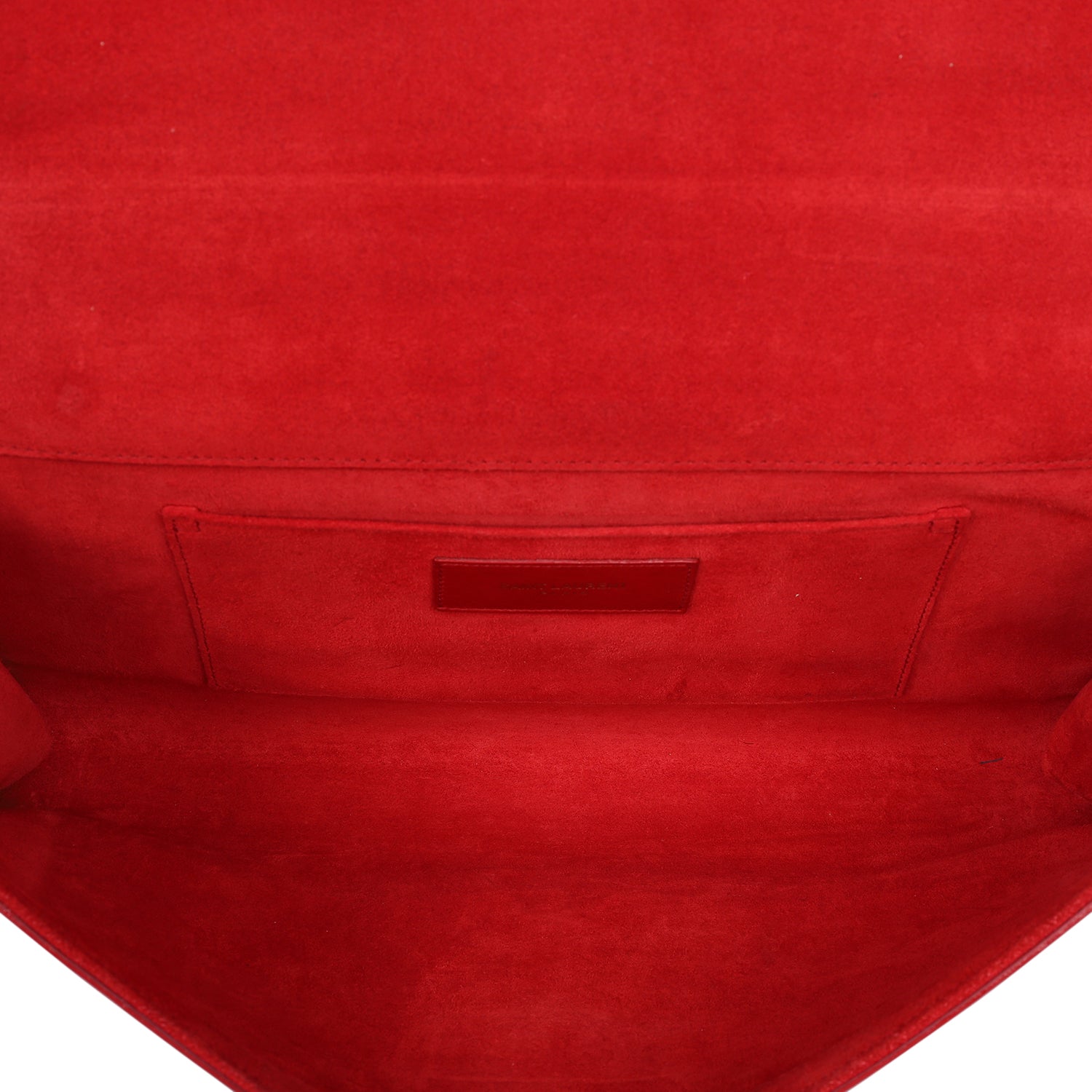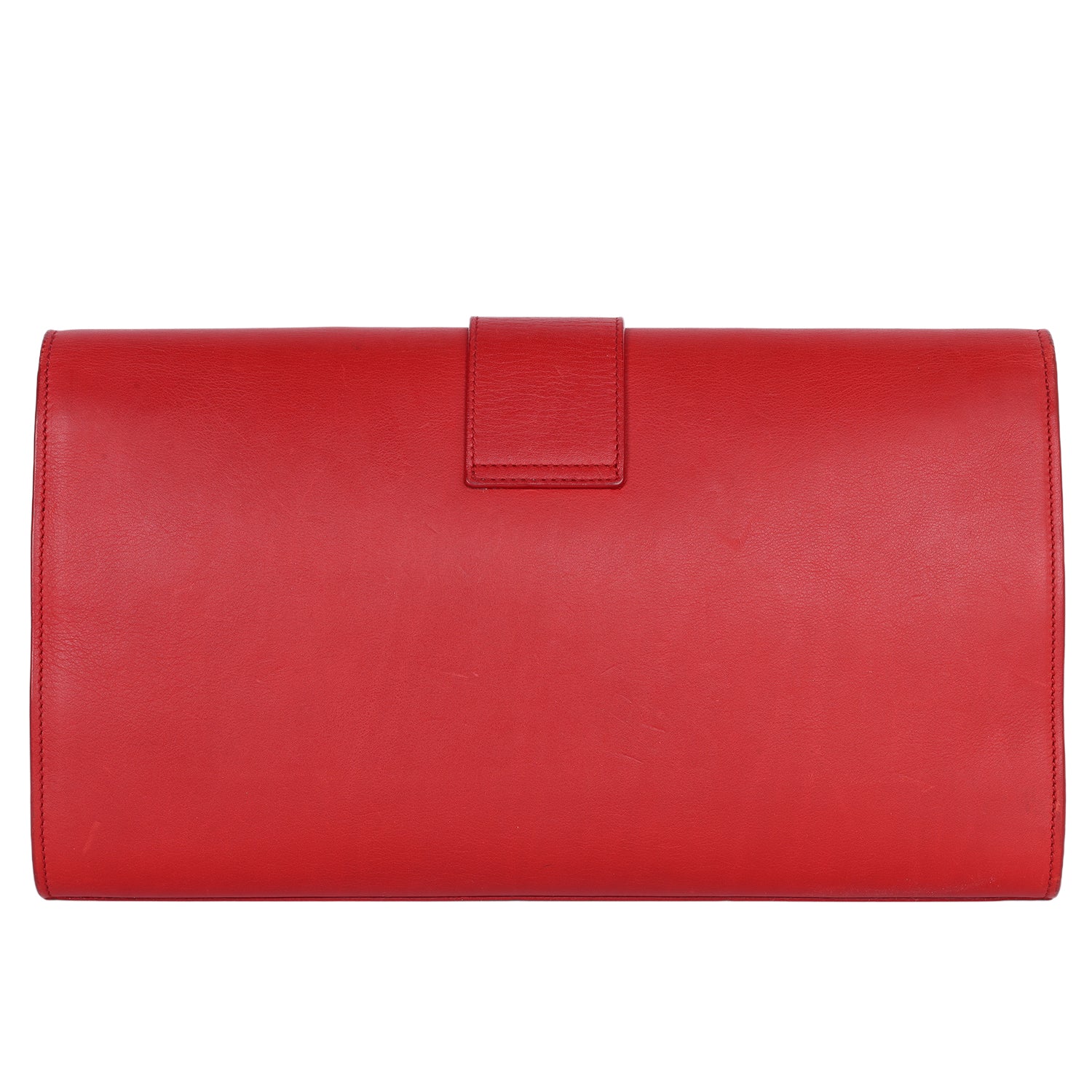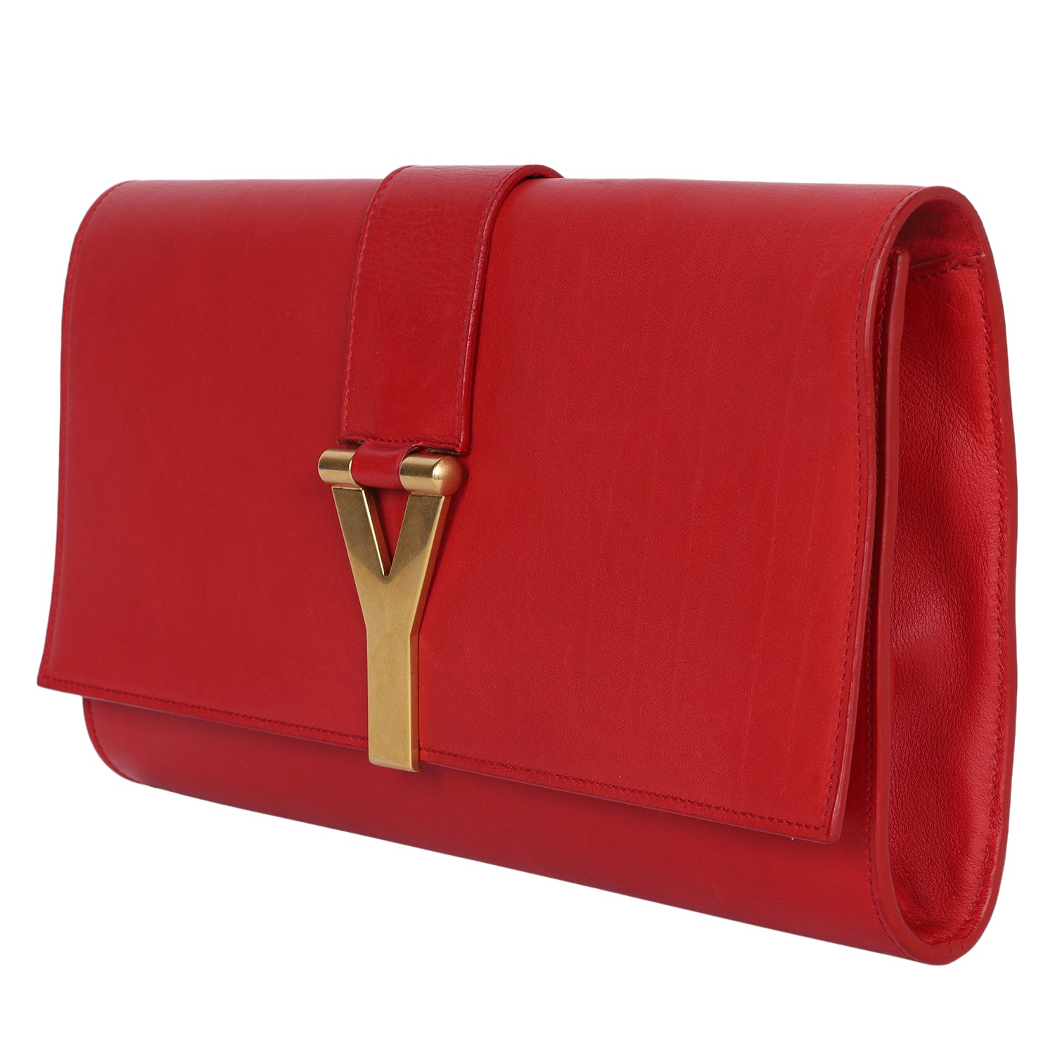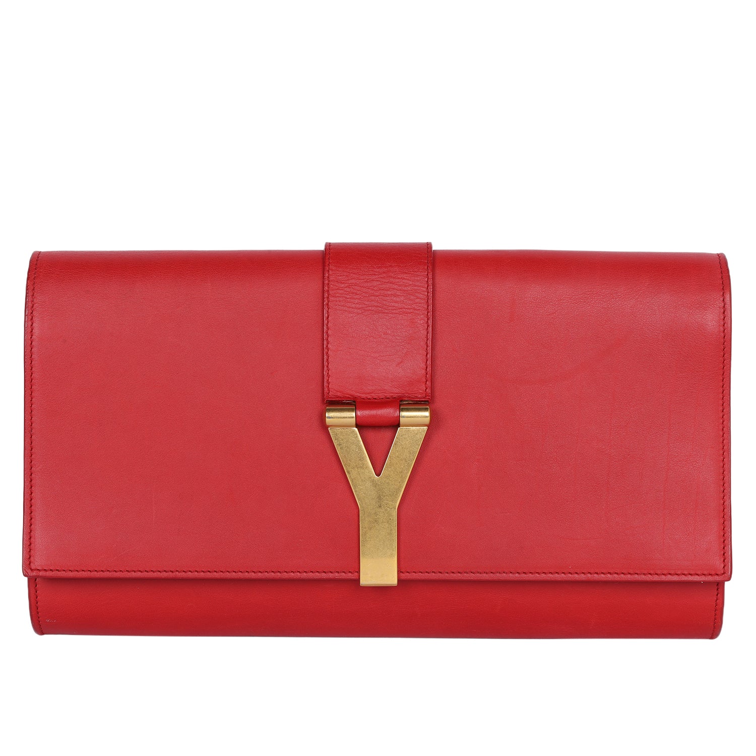 Authentic Yves Saint Laurent Lingne Y clutch in vivid red calfskin leather. Features the iconic gold-tone “Y” clasp, front flap snap closure with gold hardware. The microfiber interior in red is large with a slip pocket. Perfect bag to add your phone, cosmetics, keys and use from day to night.