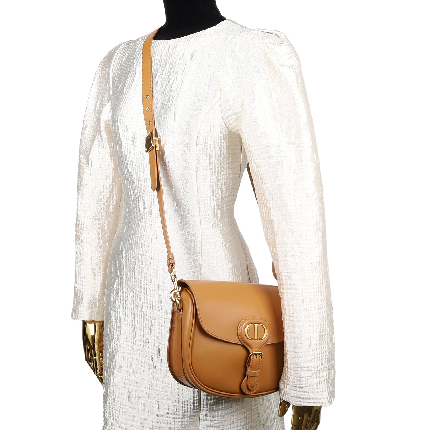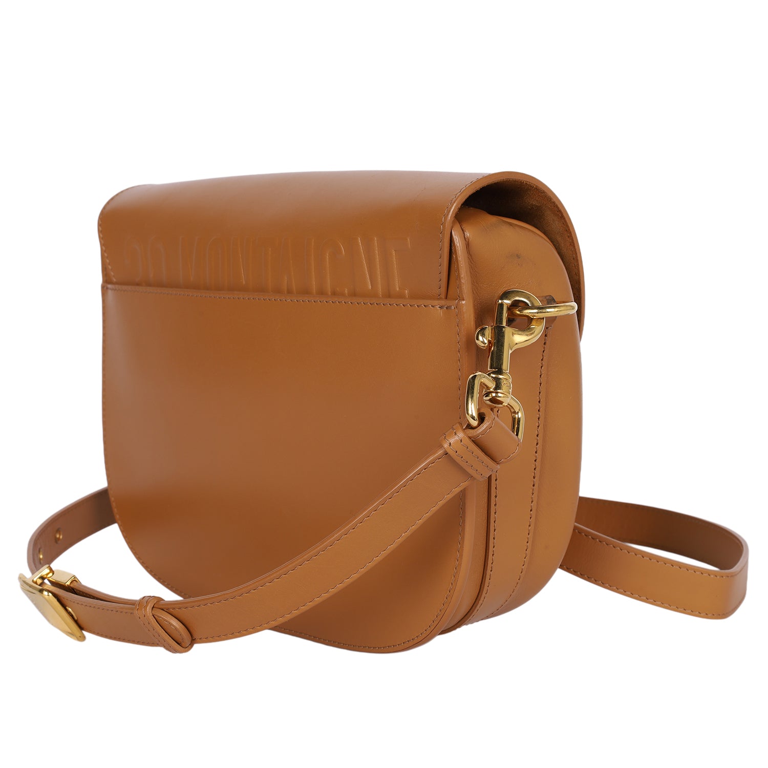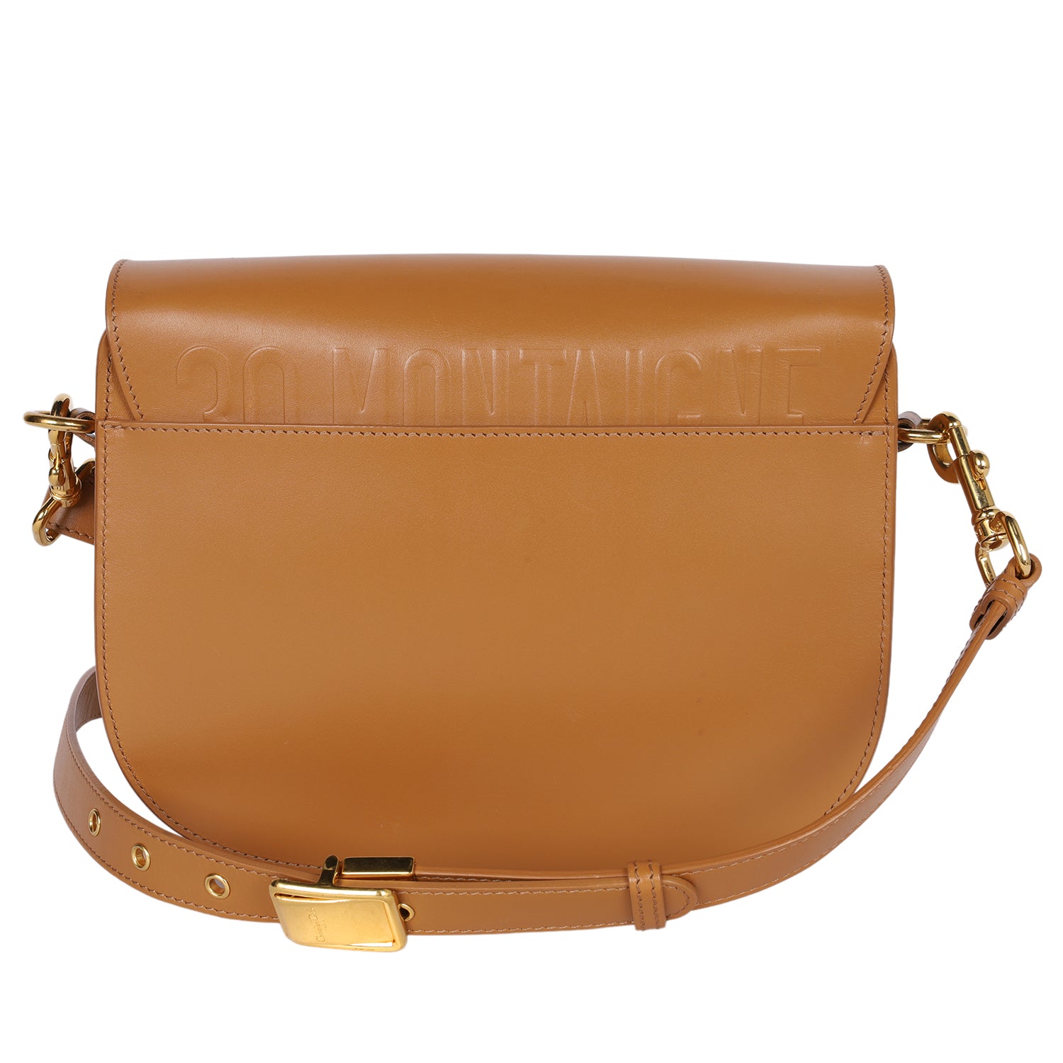 Authentic Christian Dior Box Calfskin Bobby Flap Crossbody in light brown. Features smooth brown leather, front flap with CD logo magnetic snap closure, rear slip pocket, adjustable shoulder strap with polished gold hardware and christian dior logo. The interior has a brown suede lining with a patch pocket.