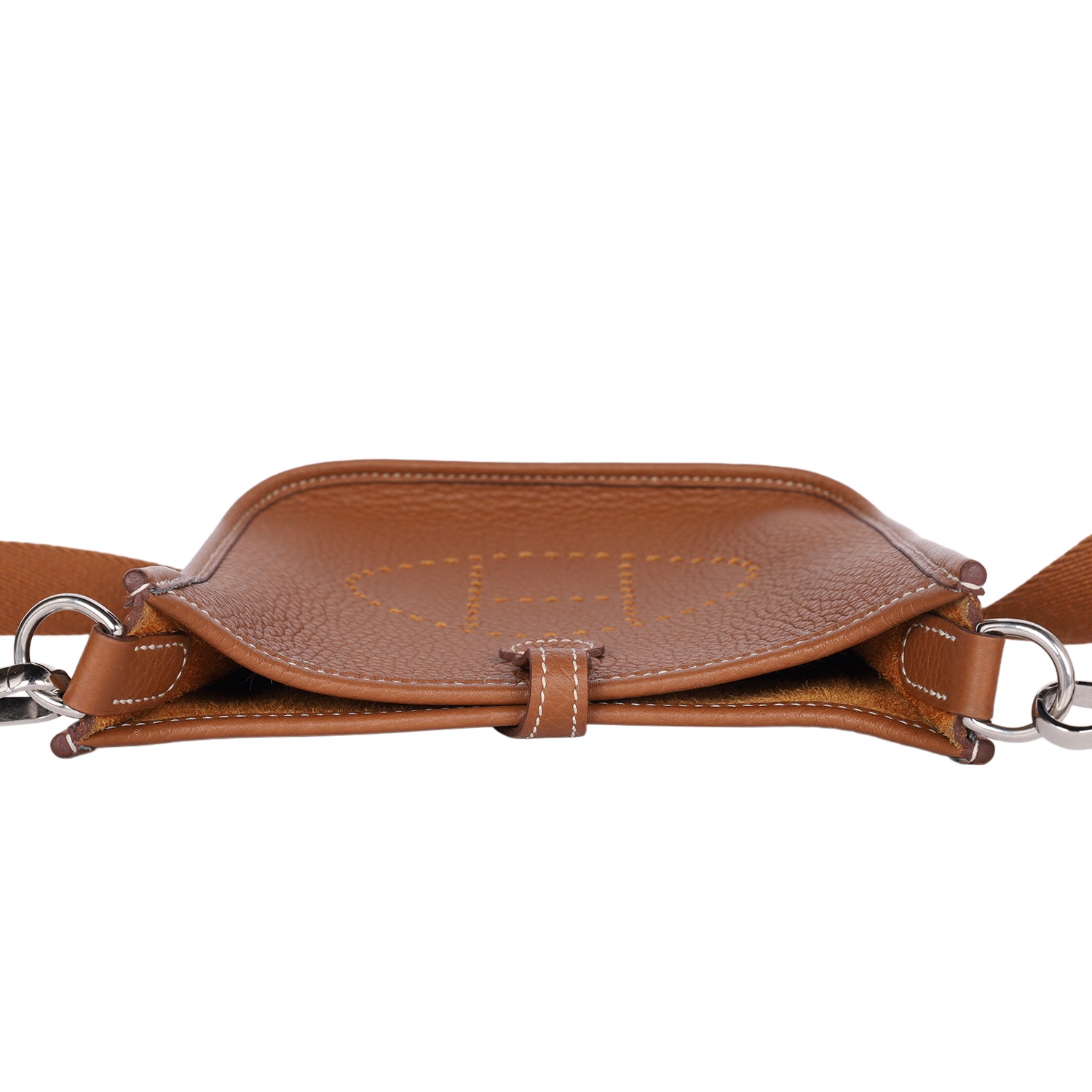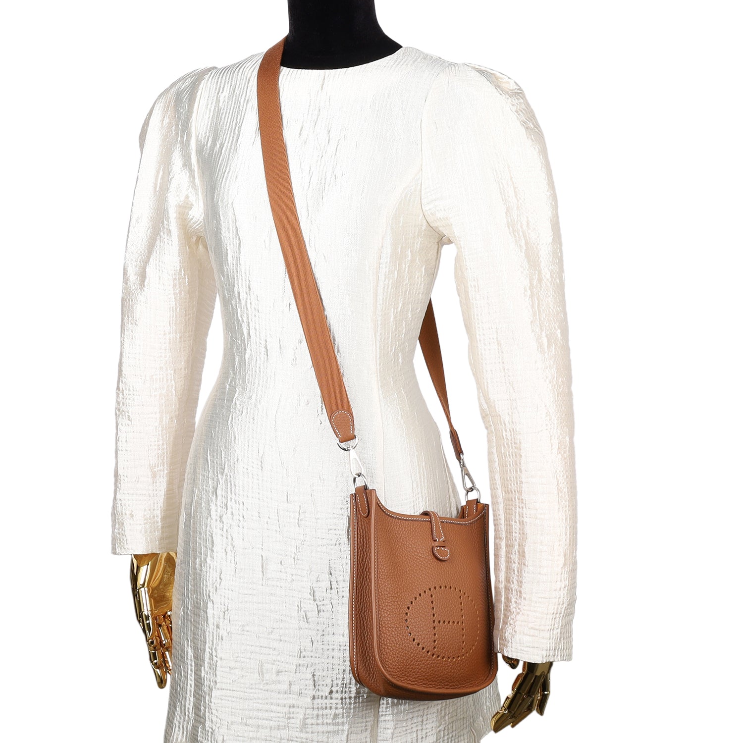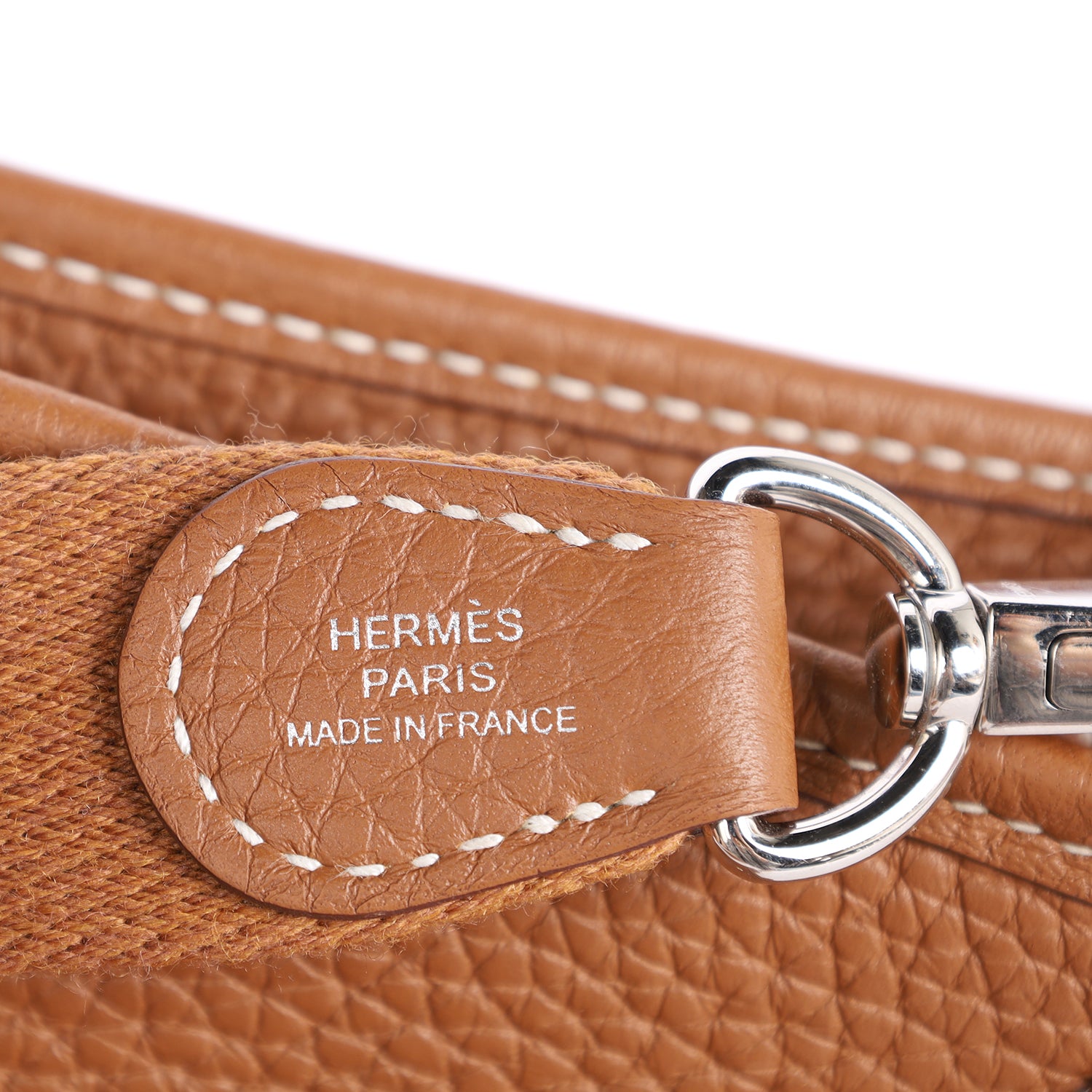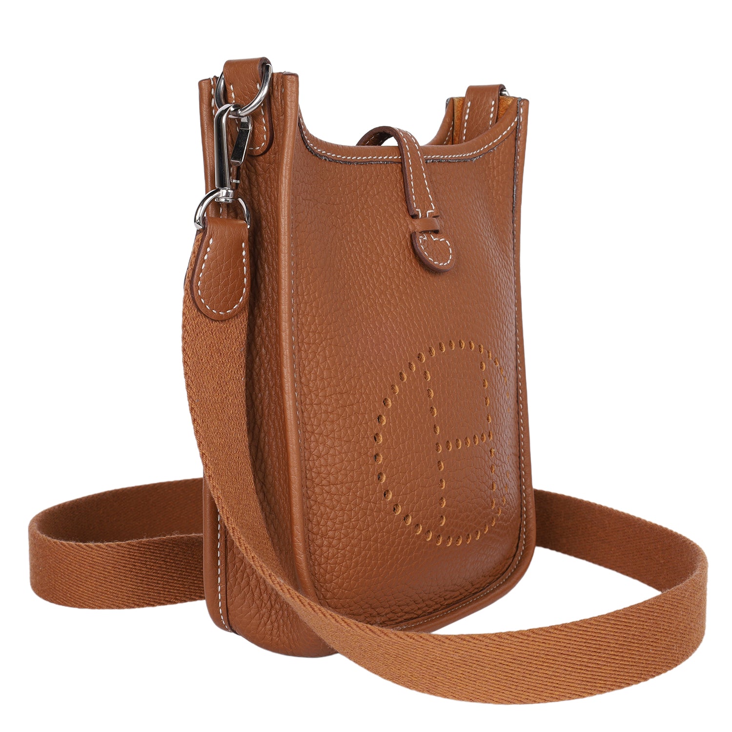 Authentic Hermes Taurillon Clemence Evelyn Bag in Brown. Features calfskin leather, a flat shoulder strap, the bag can be worn comfortably over the shoulder or crossbody. The opening is secured with the help of a snap closure. An absolute classic in a variant that offers space for all things of every day. This is the small size that is so popular today.