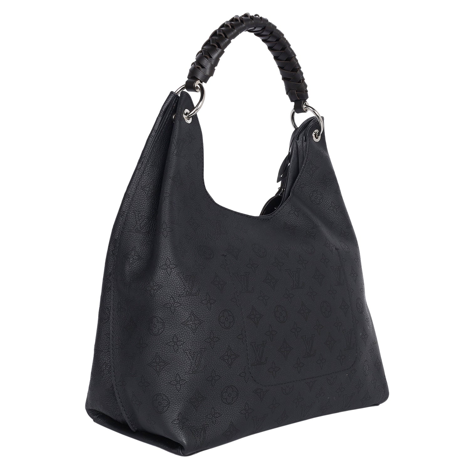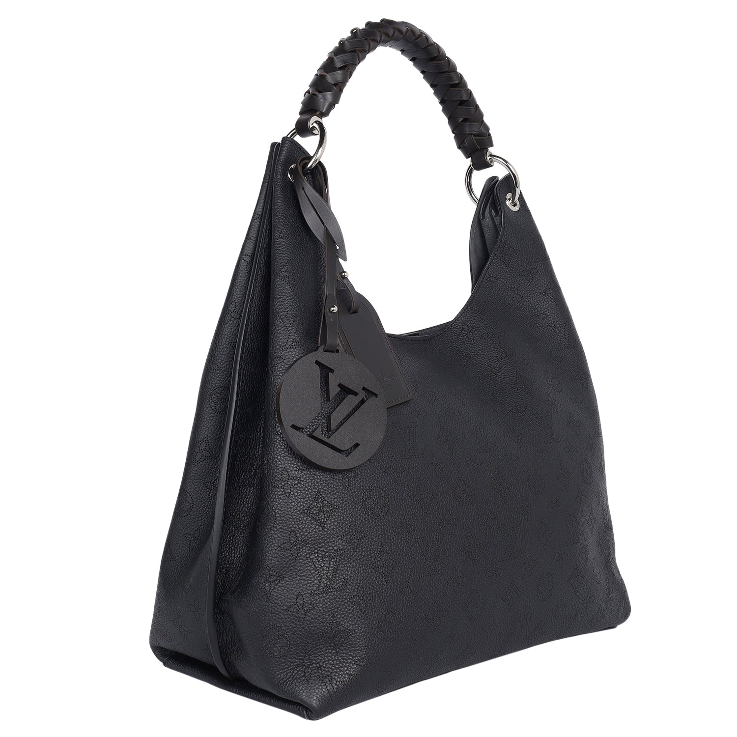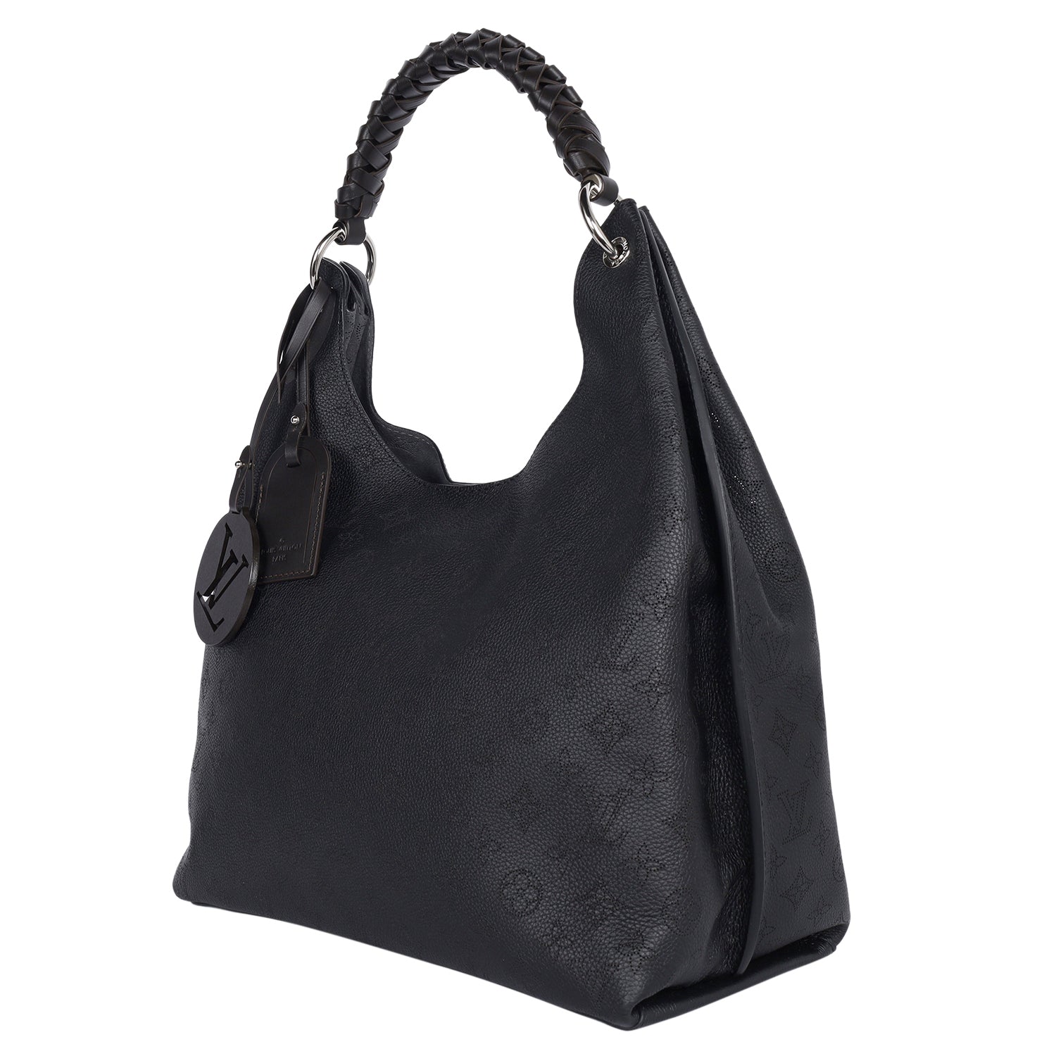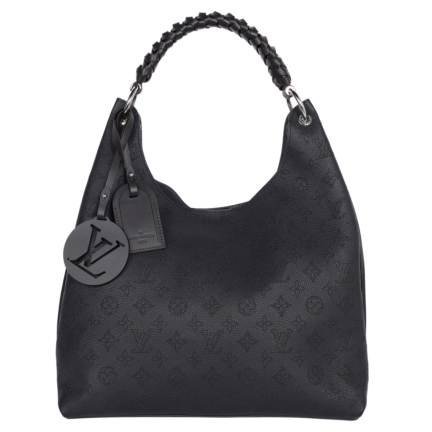Authentic Louis Vuitton Carmel Mahina Hobo Bag in Black. Features calf skin leather with monogram perforations, braided leather handle, silver hardware, magnetic snap closure, LV leather charm, spacious large interior with zipper pocket. This bag is lightweight and easy to carry on the shoulder. Your going to love it.