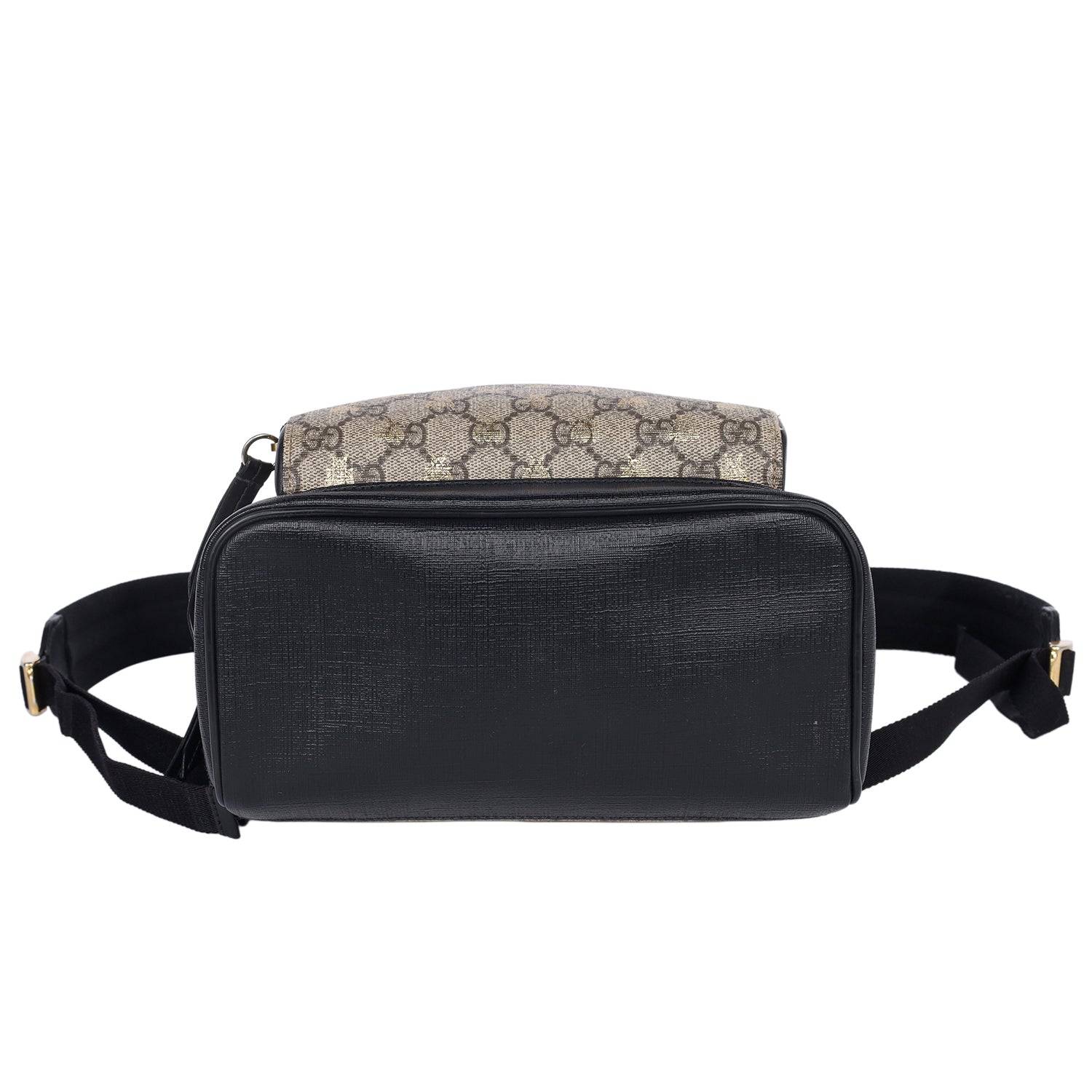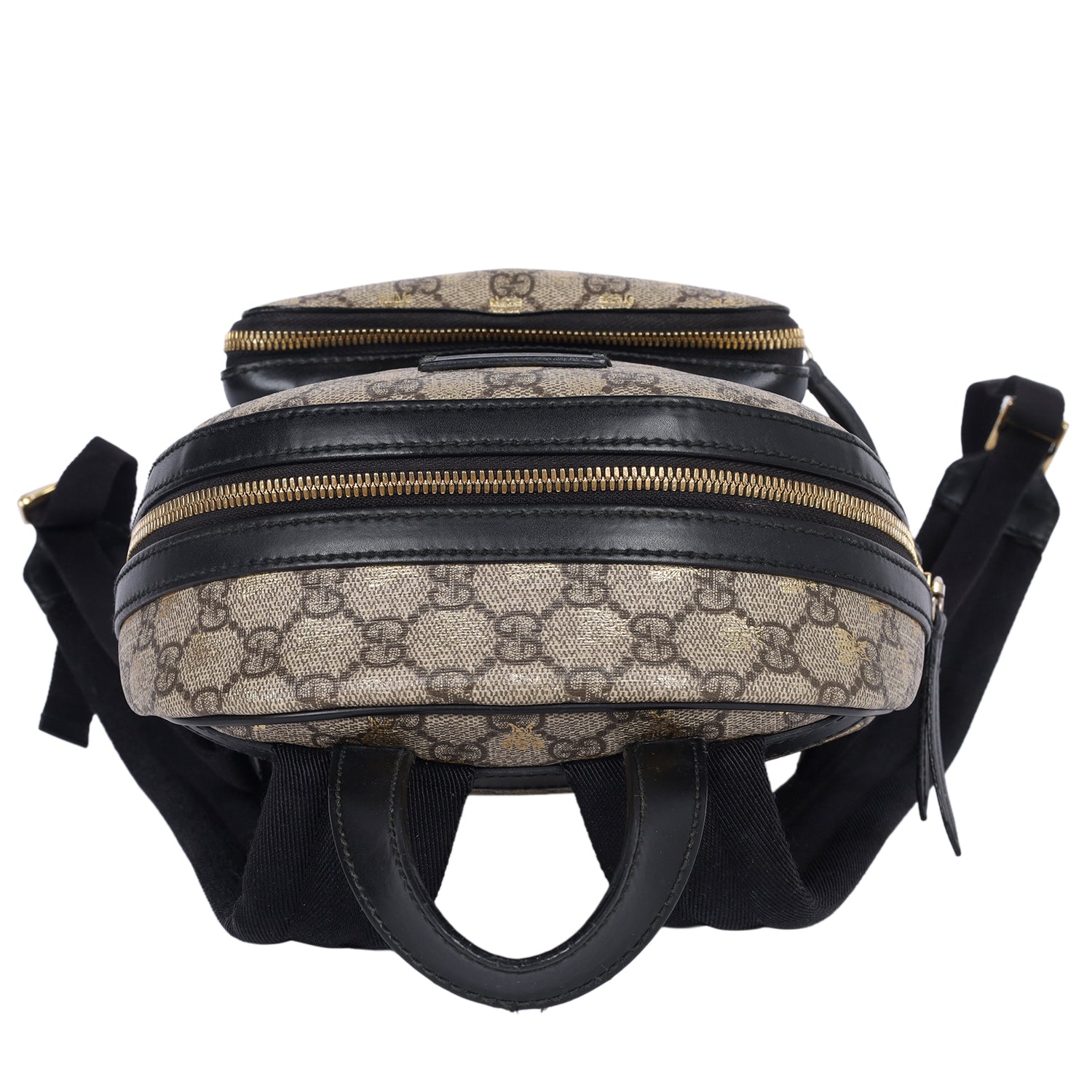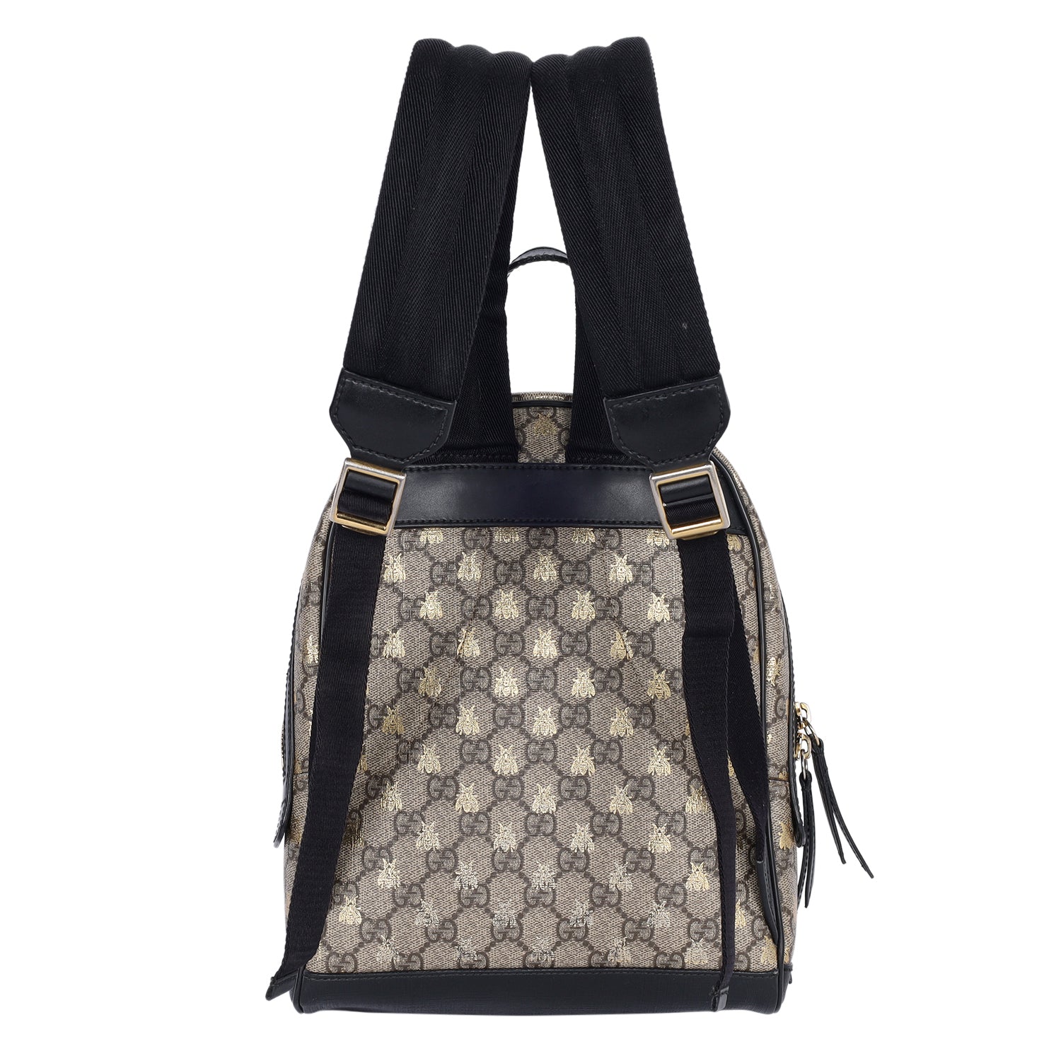 Authentic Gucci GG Supreme Monogram Small Bees Print Backpack. Features Gucci GG monogram coated canvas with gold bees, zipper top closure, front zipper pocket, adjustable black nylon shoulder straps, black leather trim, top handle. The large interior opens to a beige microfiber with slip pockets and zipper pocket. Its roomy interior is ideal for travel / school with the sophisticated style of Gucci! You won't want to pass up owning this fantastic backpack!