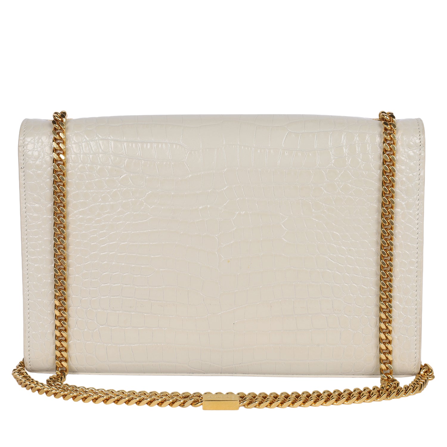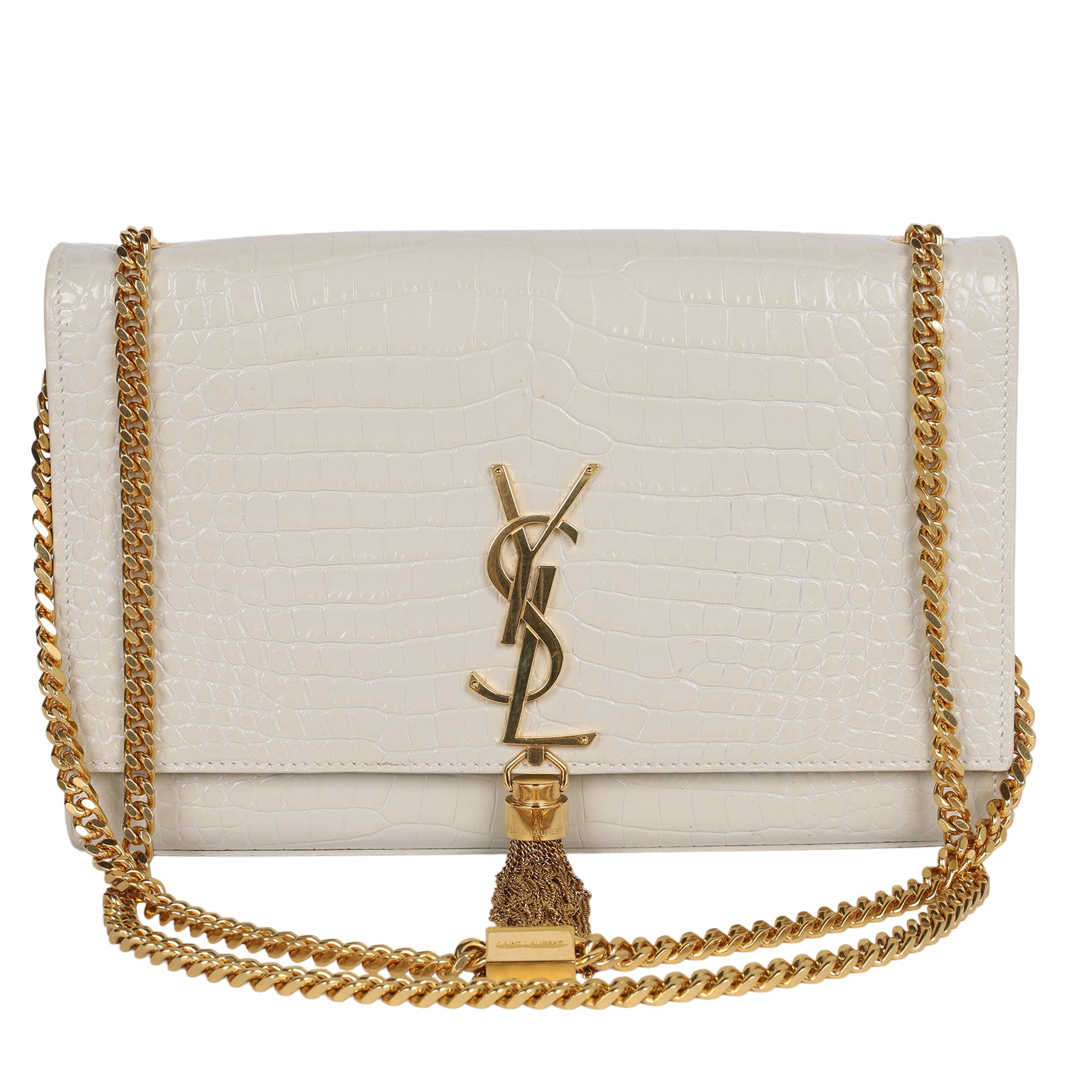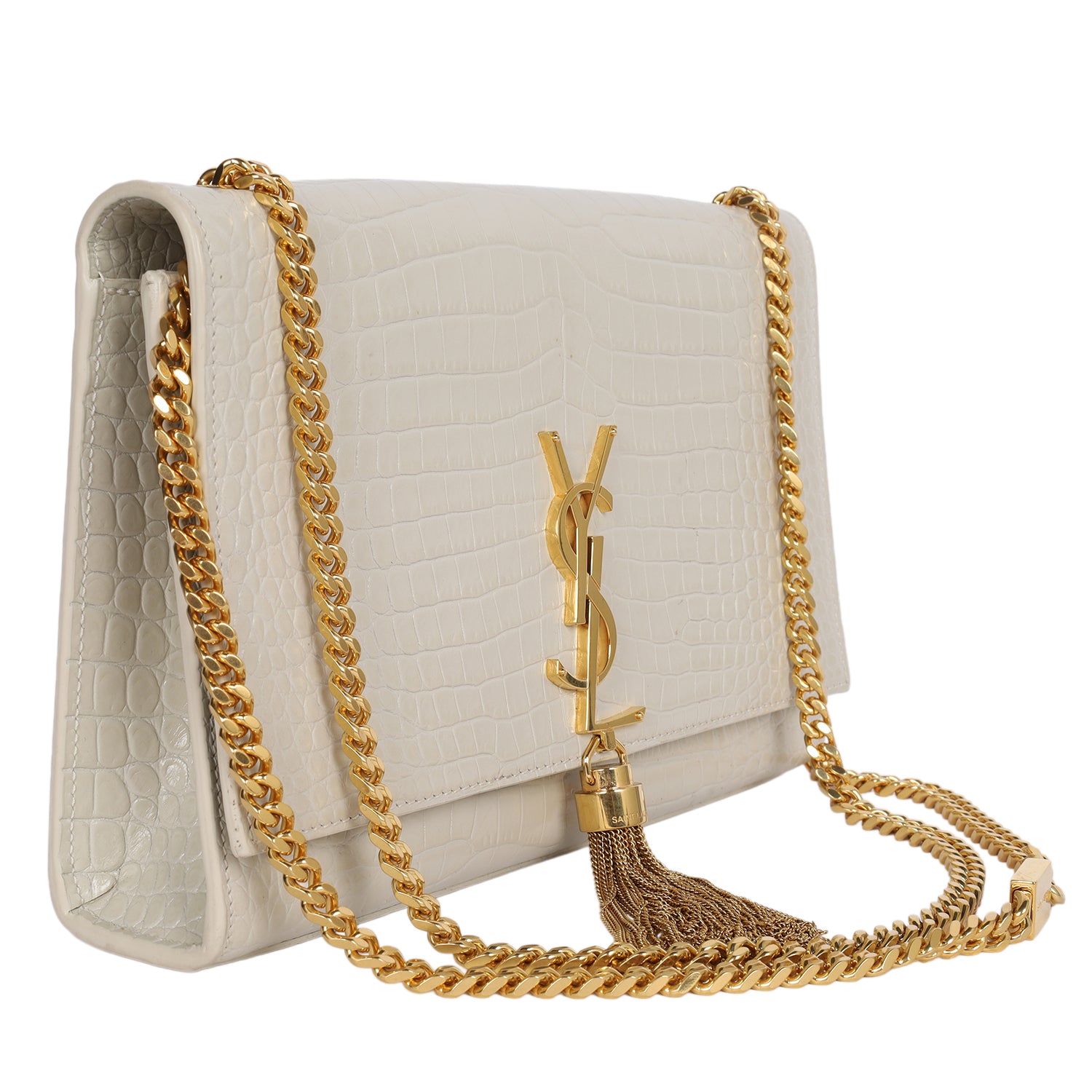 Authentic Saint Laurent kate medium tassel in crocodile embossed leather shoulder bag in Ivory. This classic bag is one that will take you through all seasons. Adorned with iconic 'YSL' gold hardware and tassel, leather body with a sleek front flap shape, an long gold shoulder strap that can be doubled, gold YSL magnetic snap closure. The interior opens to a black lining with a slip pocket.
