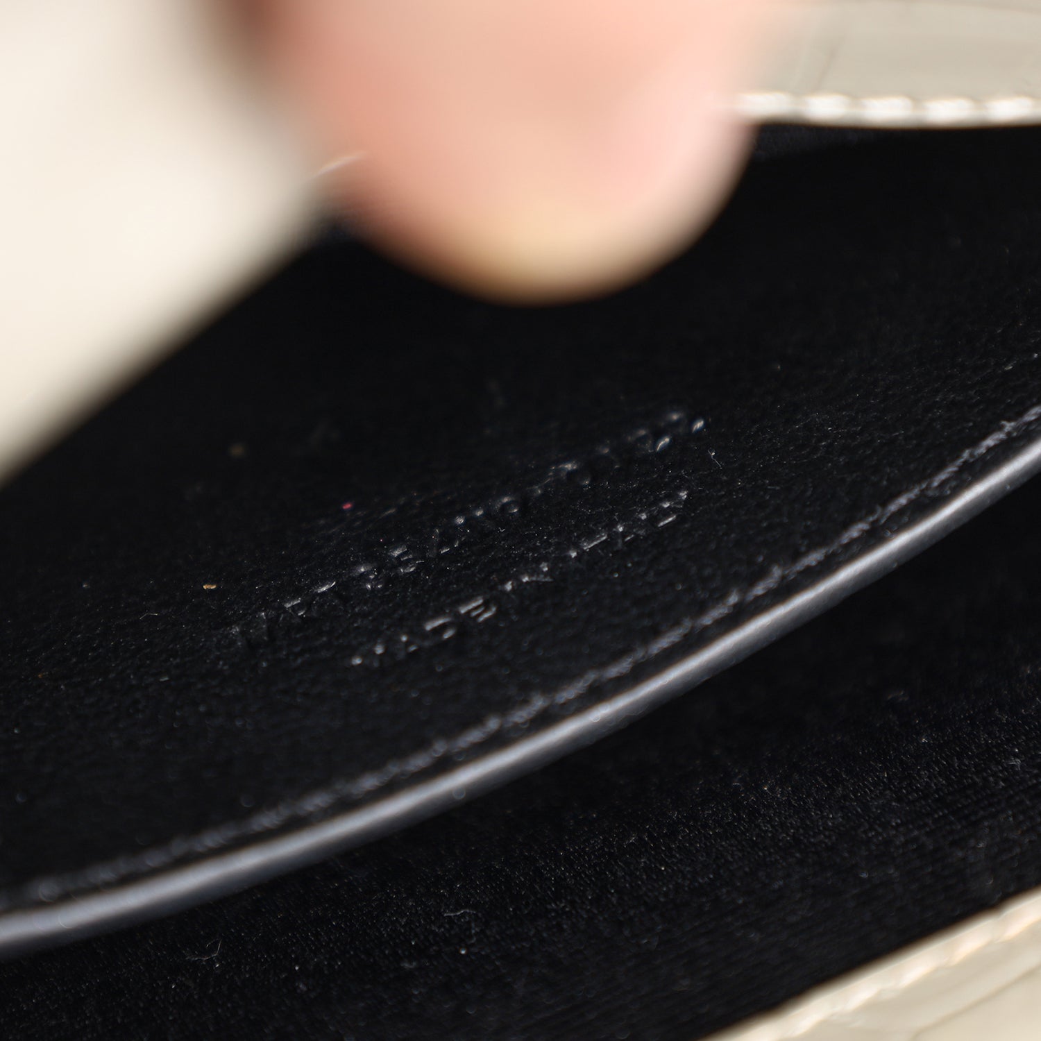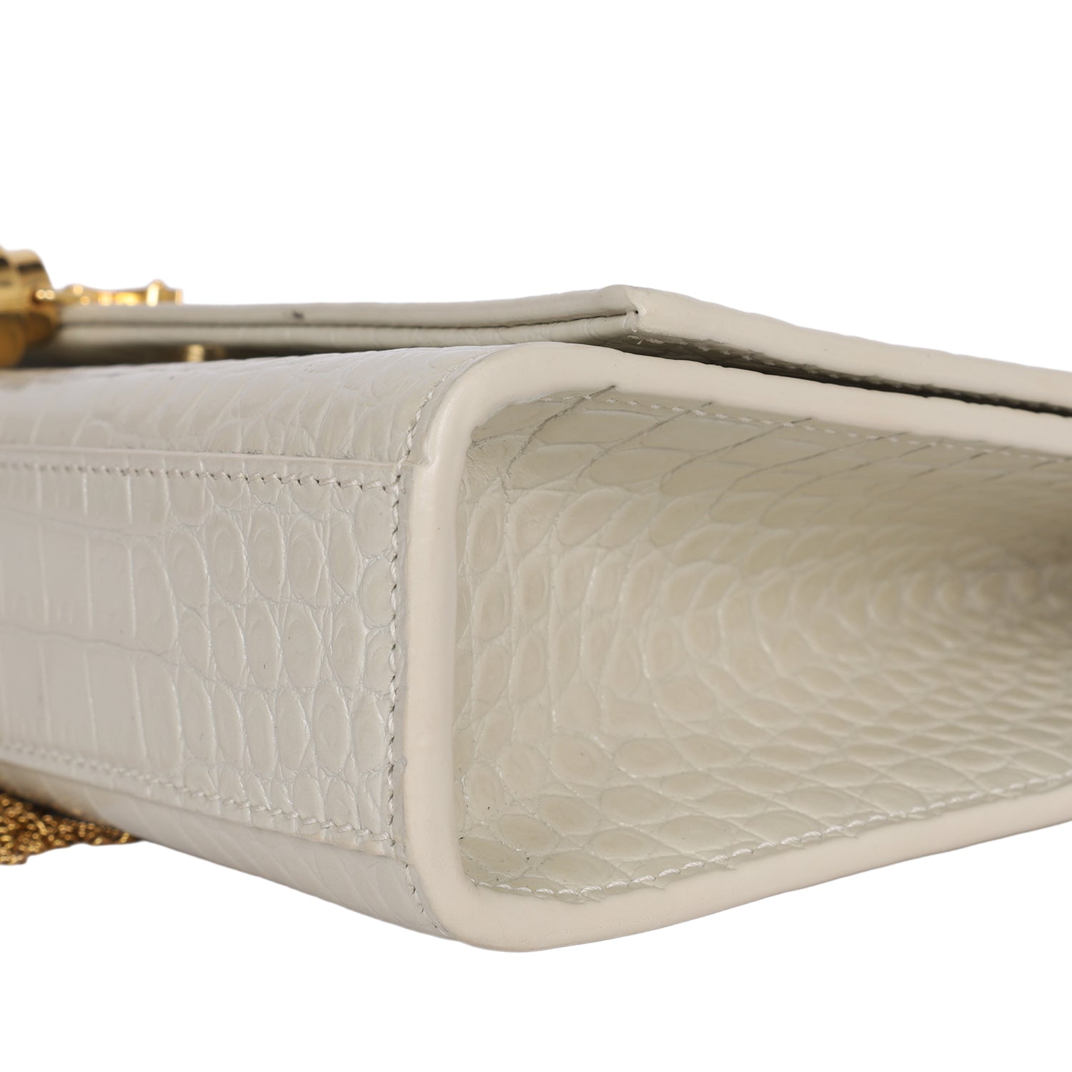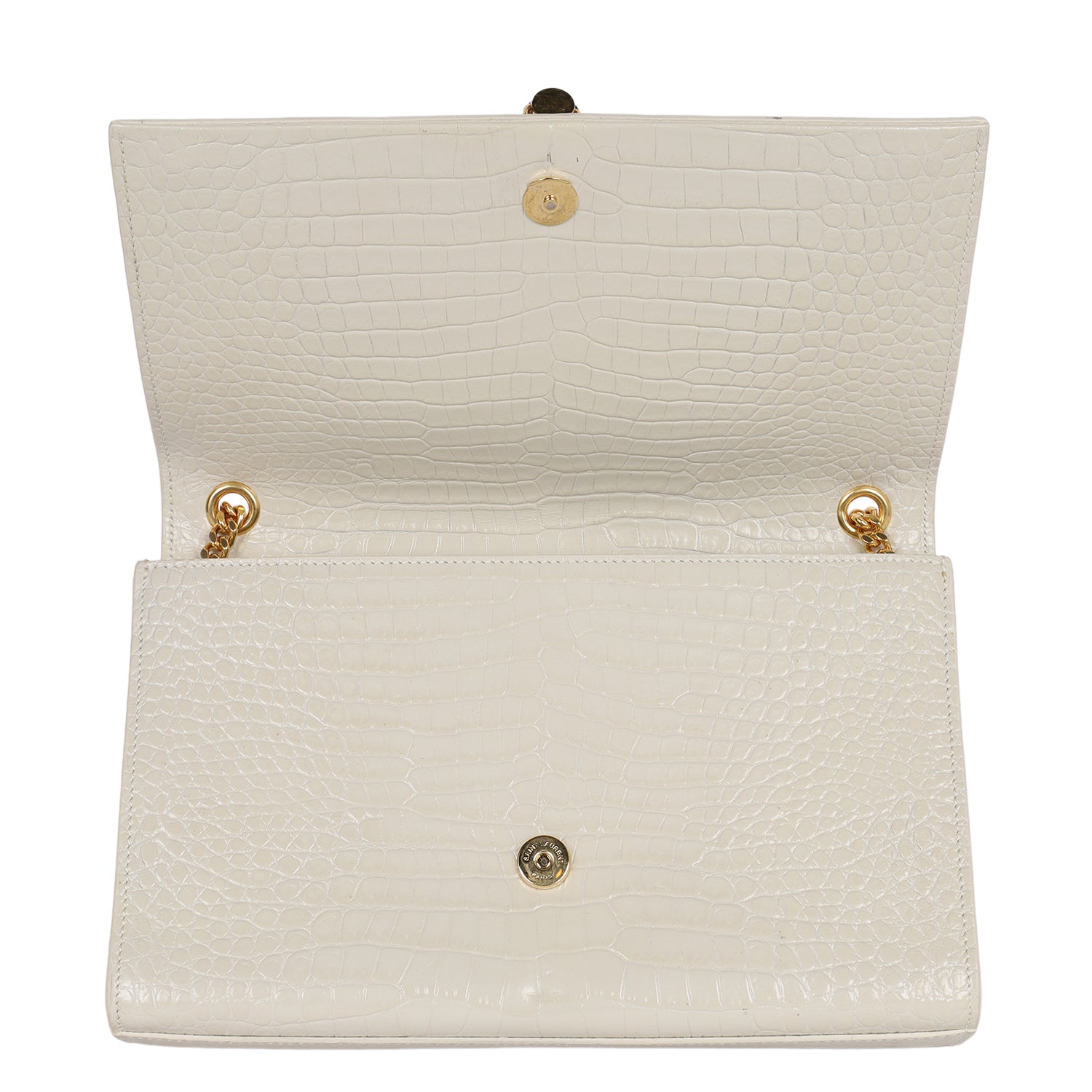 Authentic Saint Laurent kate medium tassel in crocodile embossed leather shoulder bag in Ivory. This classic bag is one that will take you through all seasons. Adorned with iconic 'YSL' gold hardware and tassel, leather body with a sleek front flap shape, an long gold shoulder strap that can be doubled, gold YSL magnetic snap closure. The interior opens to a black lining with a slip pocket.