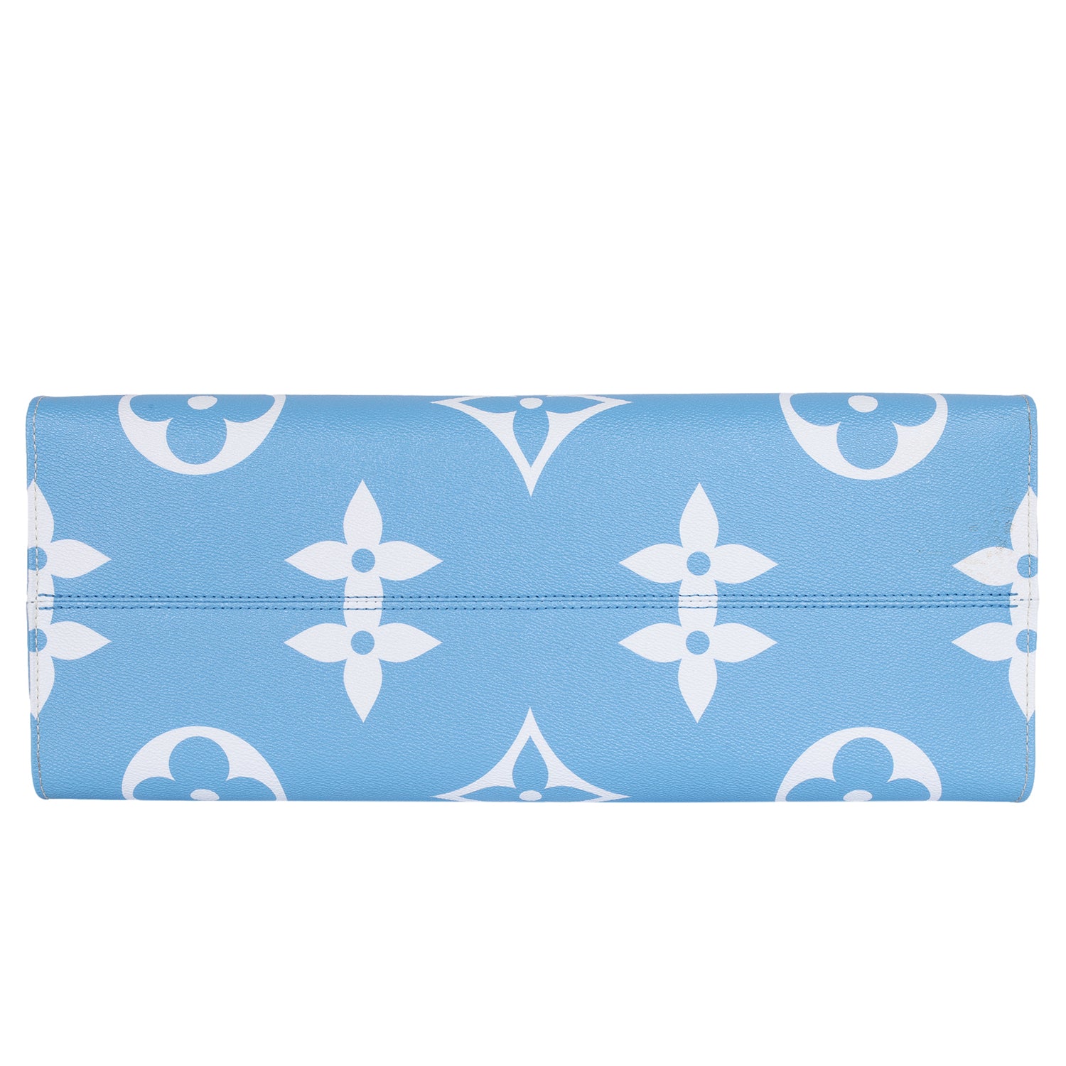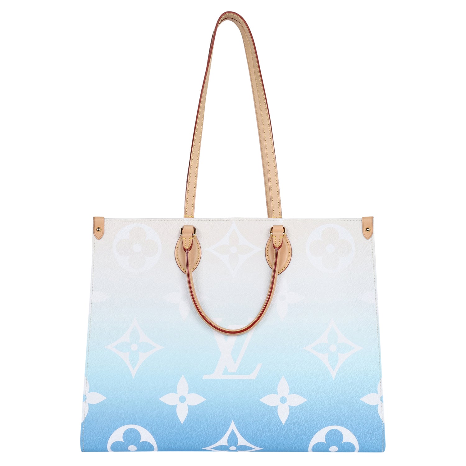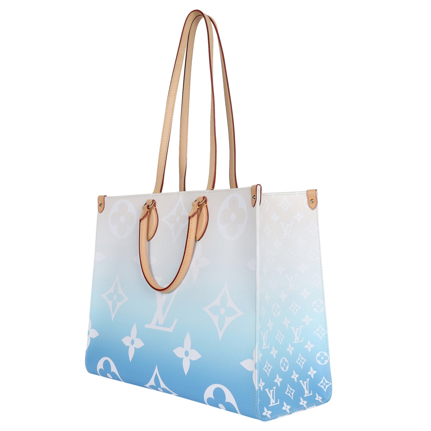 Authentic Louis Vuitton Monogram Giant By The Pool Onthego GM tote shoulder bag. This bag from Louis Vuitton is very similar to the Neverfull GM with a bit more structure and easier to carry. "The name says it all: Onthego takes care of business or shopping, with plenty of room for a busy woman's essentials. With classic blue and beige monogram leather, twin top handles and two shoulder straps, textile interior lining, gold hardware, flat interior zipped pocket, flat slip pockets, and rolled handles. You're going to love this bag. It is perfect for your cell phone, cosmetics, keys, wallet, laptop, Ipad, and so much more.