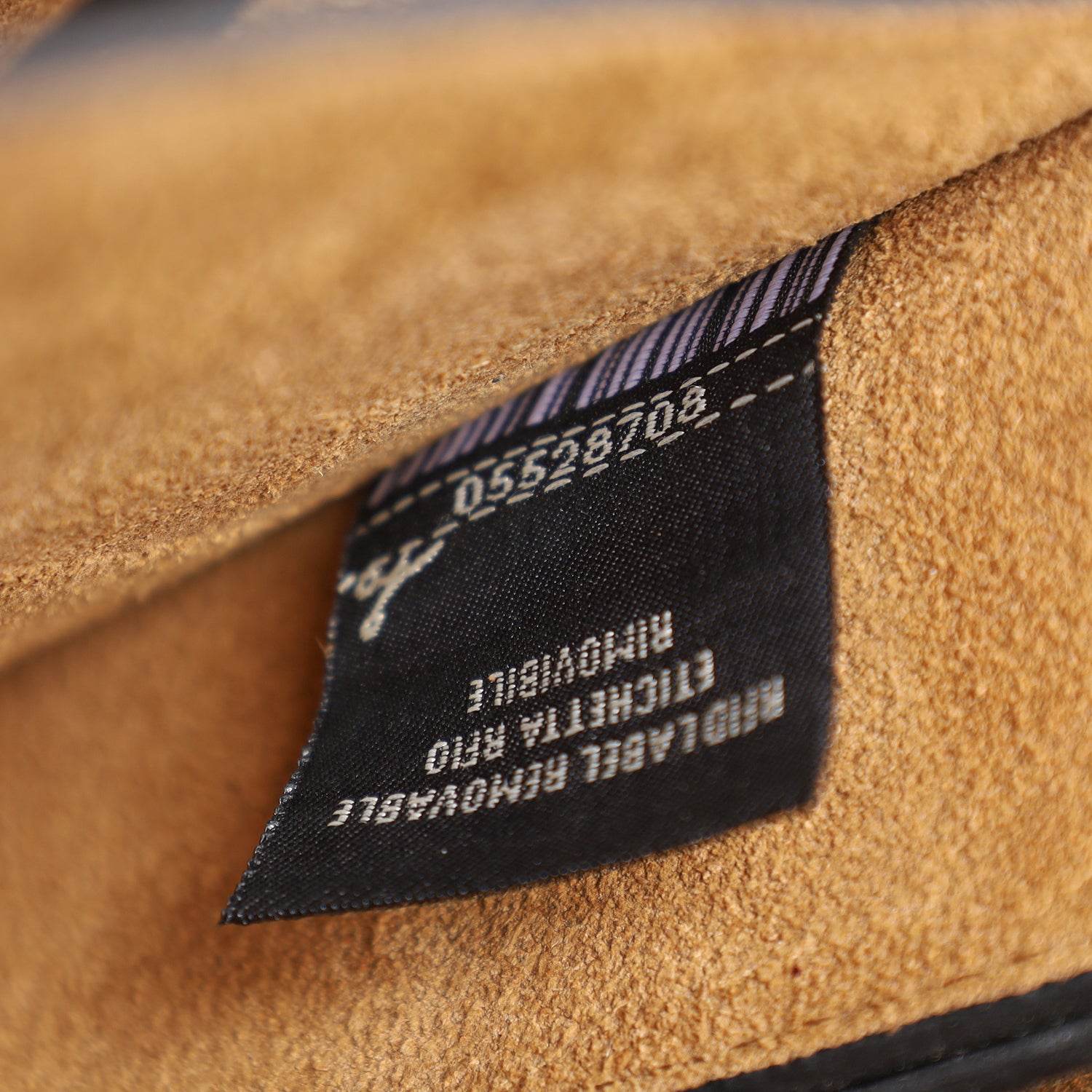 Features black calfskin leather, gold Fendi logo push lock closure, adjustable leather strap with gold hardware, partitioned brown suede interior with slip pocket.