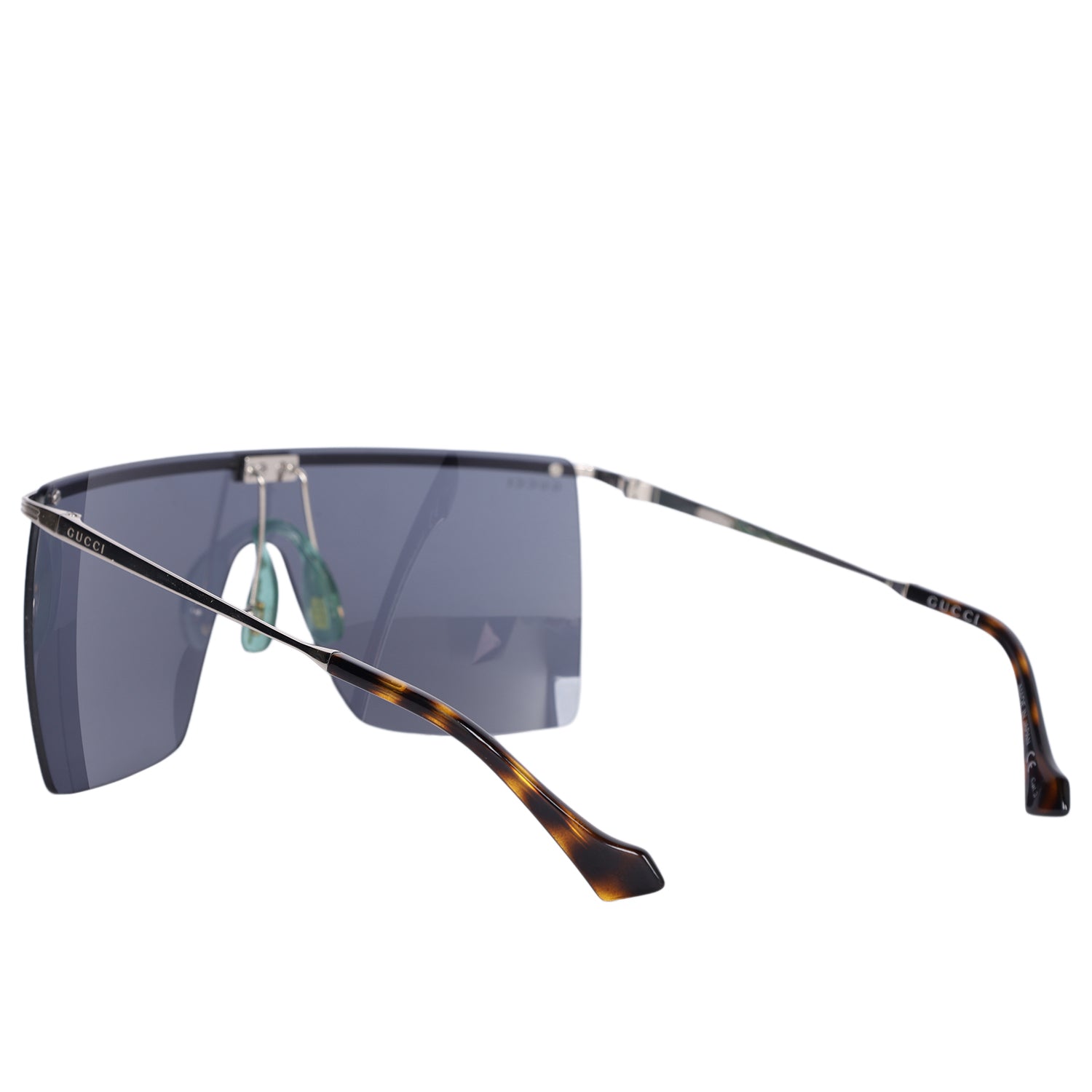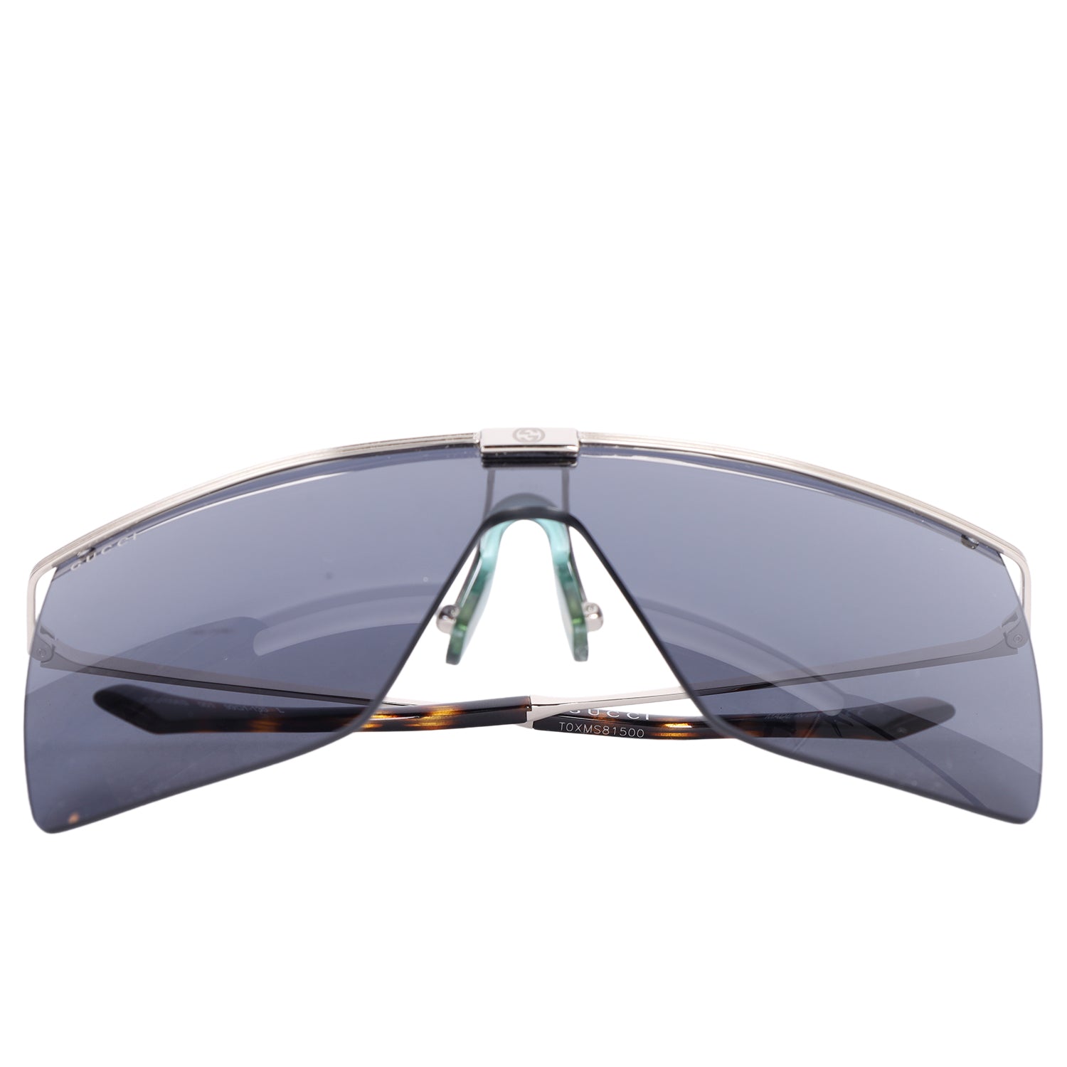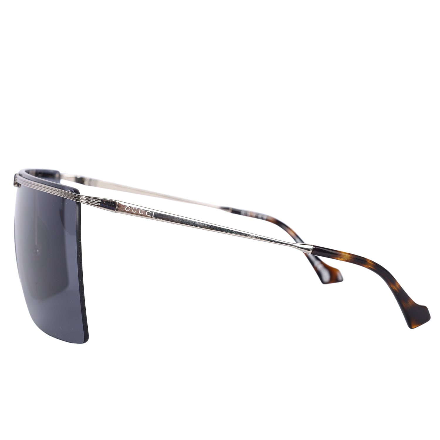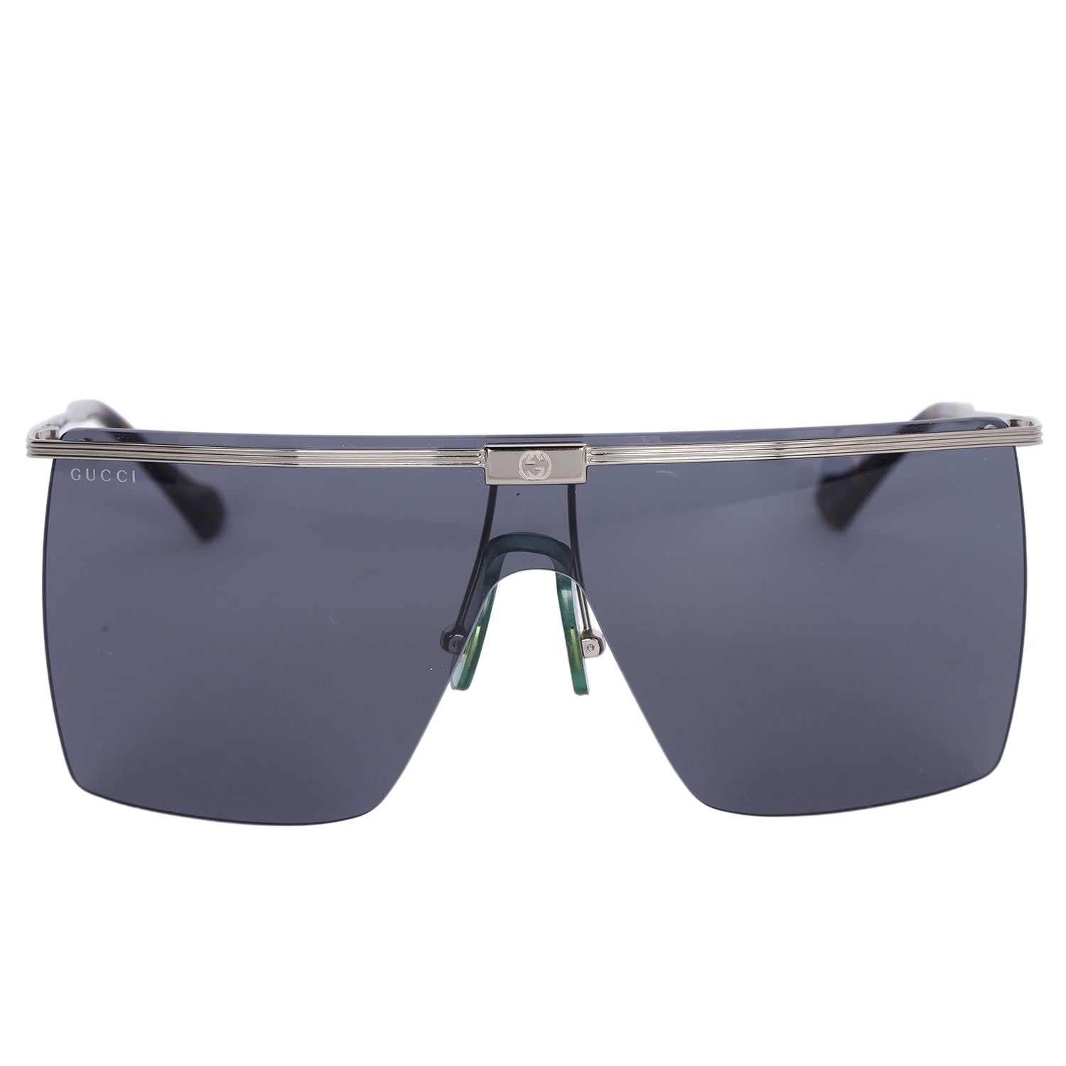 Authentic Gucci Oversized Sunglasses. These Gucci sunglasses feature a silver metal frame and tinted lenses.