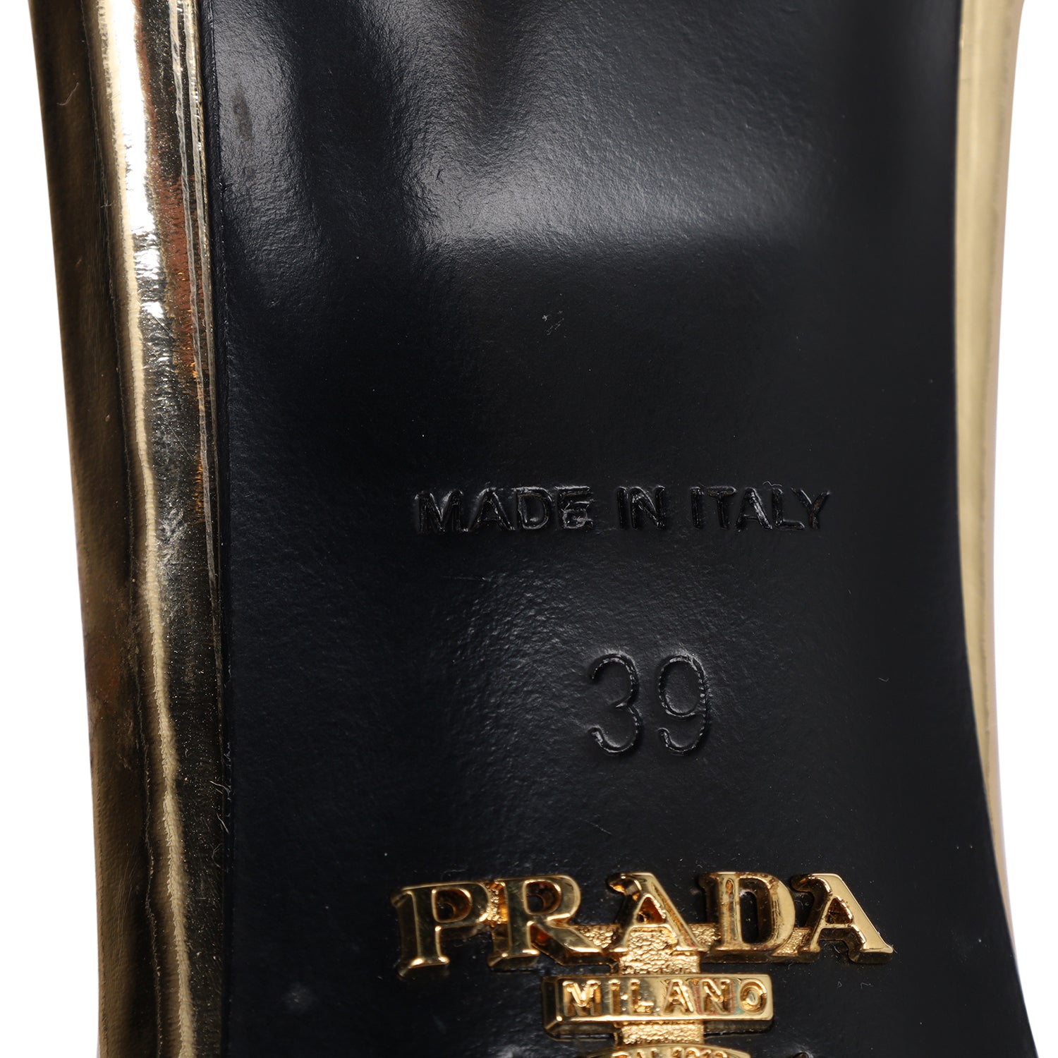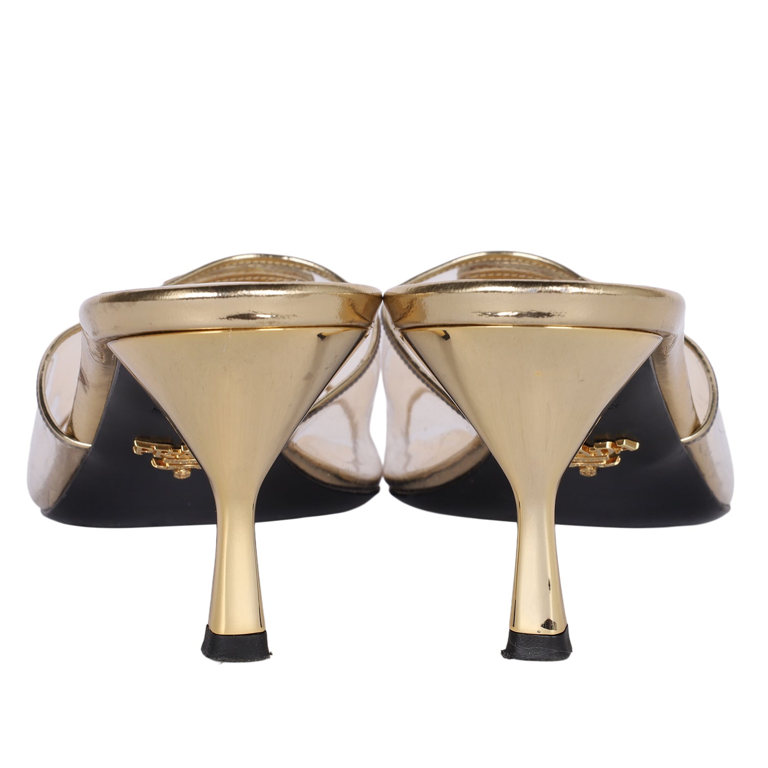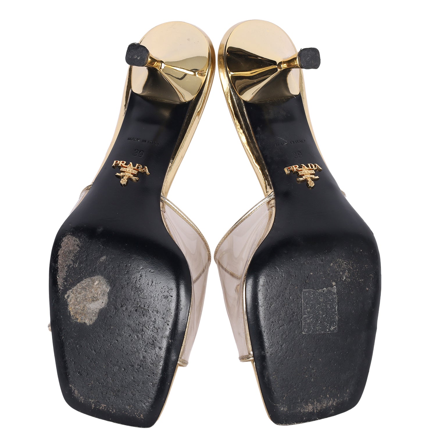 Authentic Prada Clear Metallic Mule Sandals with Prada logo.