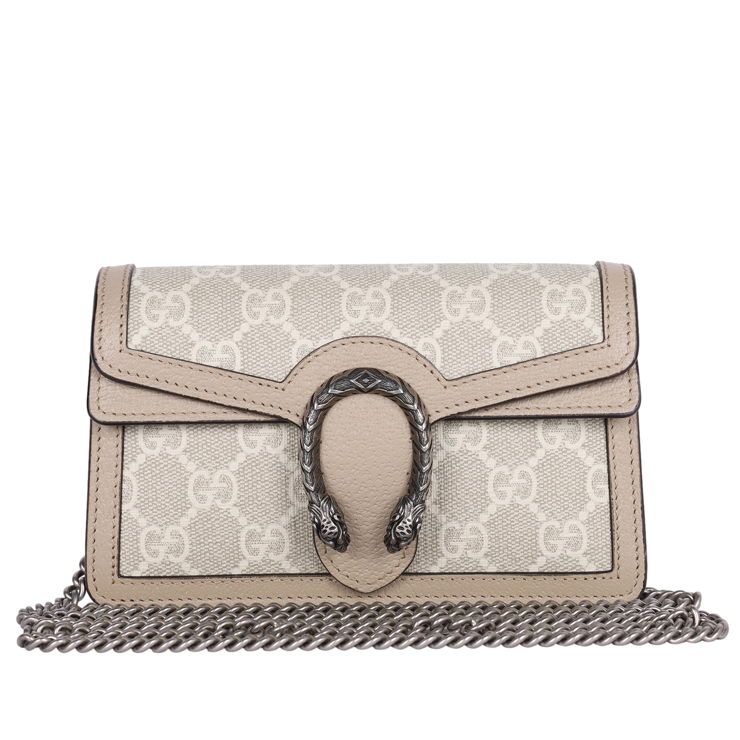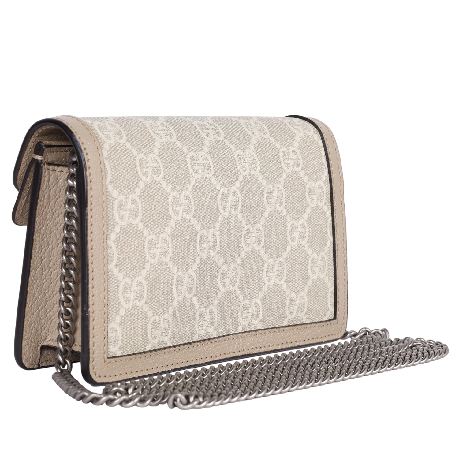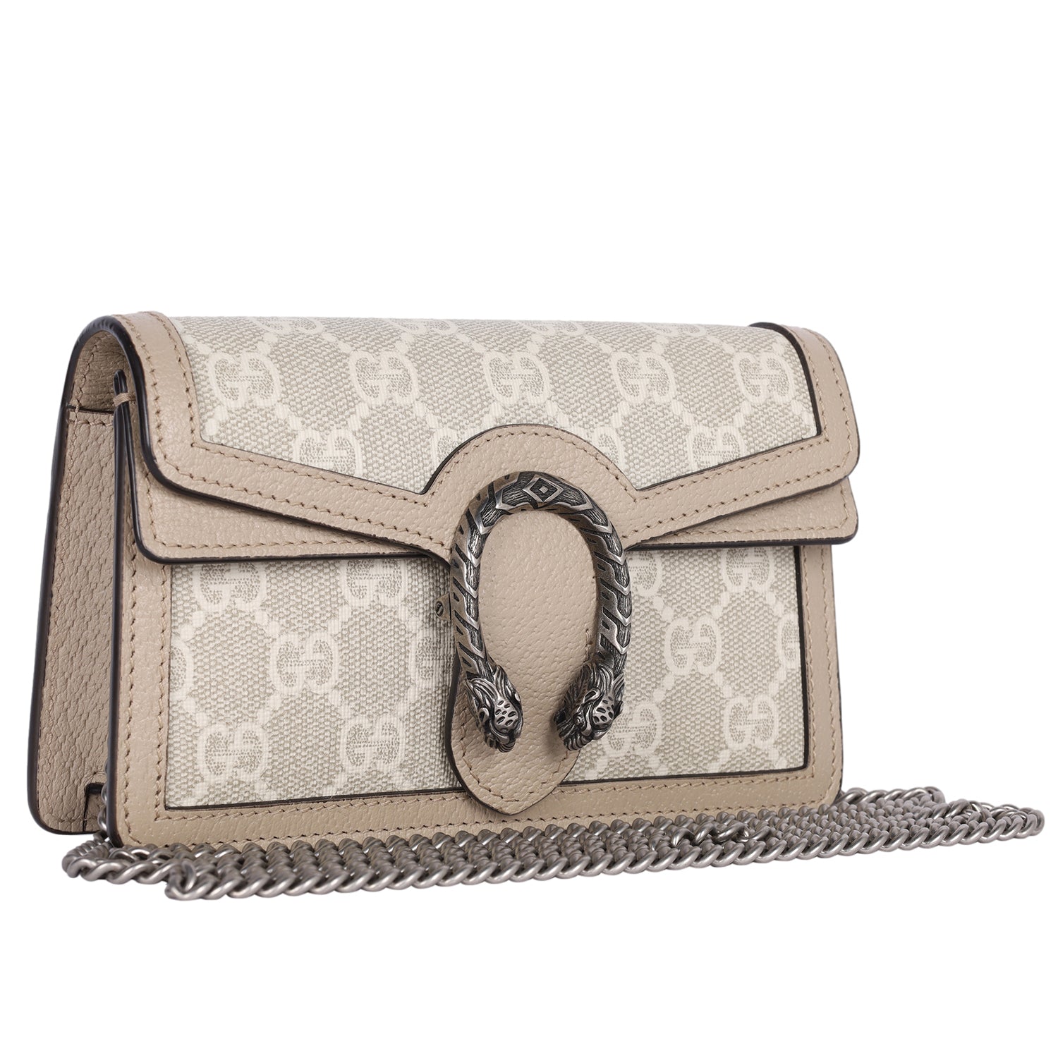 Authentic Like New Gucci GG Dionysus Denim Super Mini Crossbody Bag in Beige, Mystic White, and Oatmeal. This chic petite bag features Gucci GG supreme monogram coated canvas with beige leather trim, aged silver chain shoulder strap and a textured horseshoe tiger spur snap closure. The flap opens to a beige interior.
