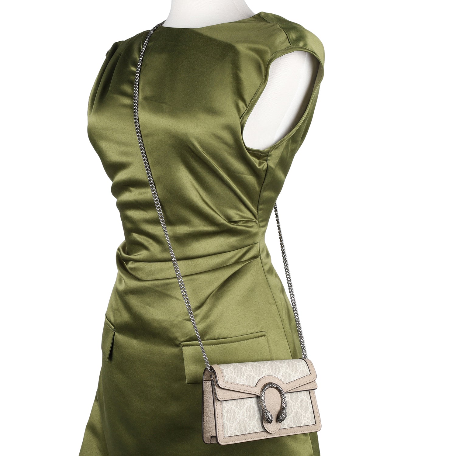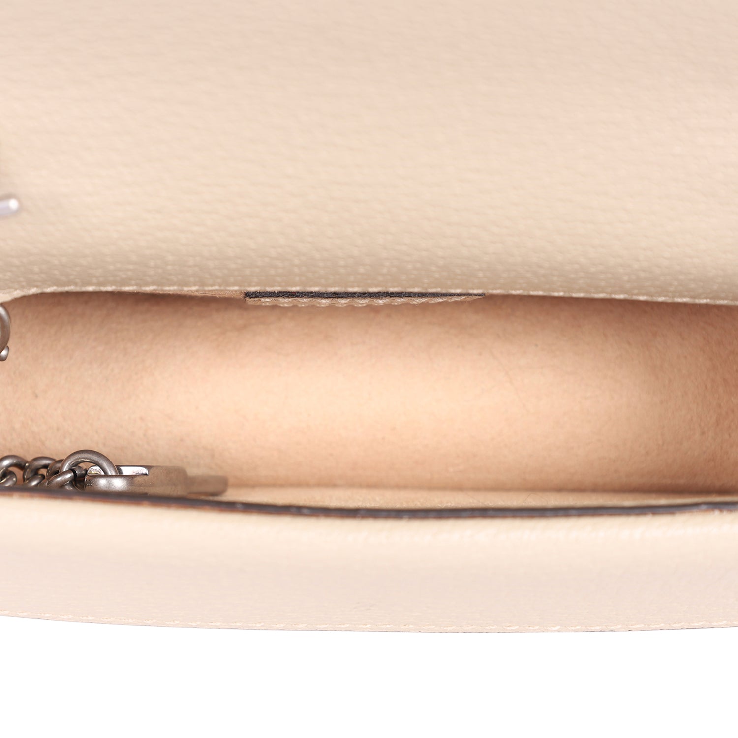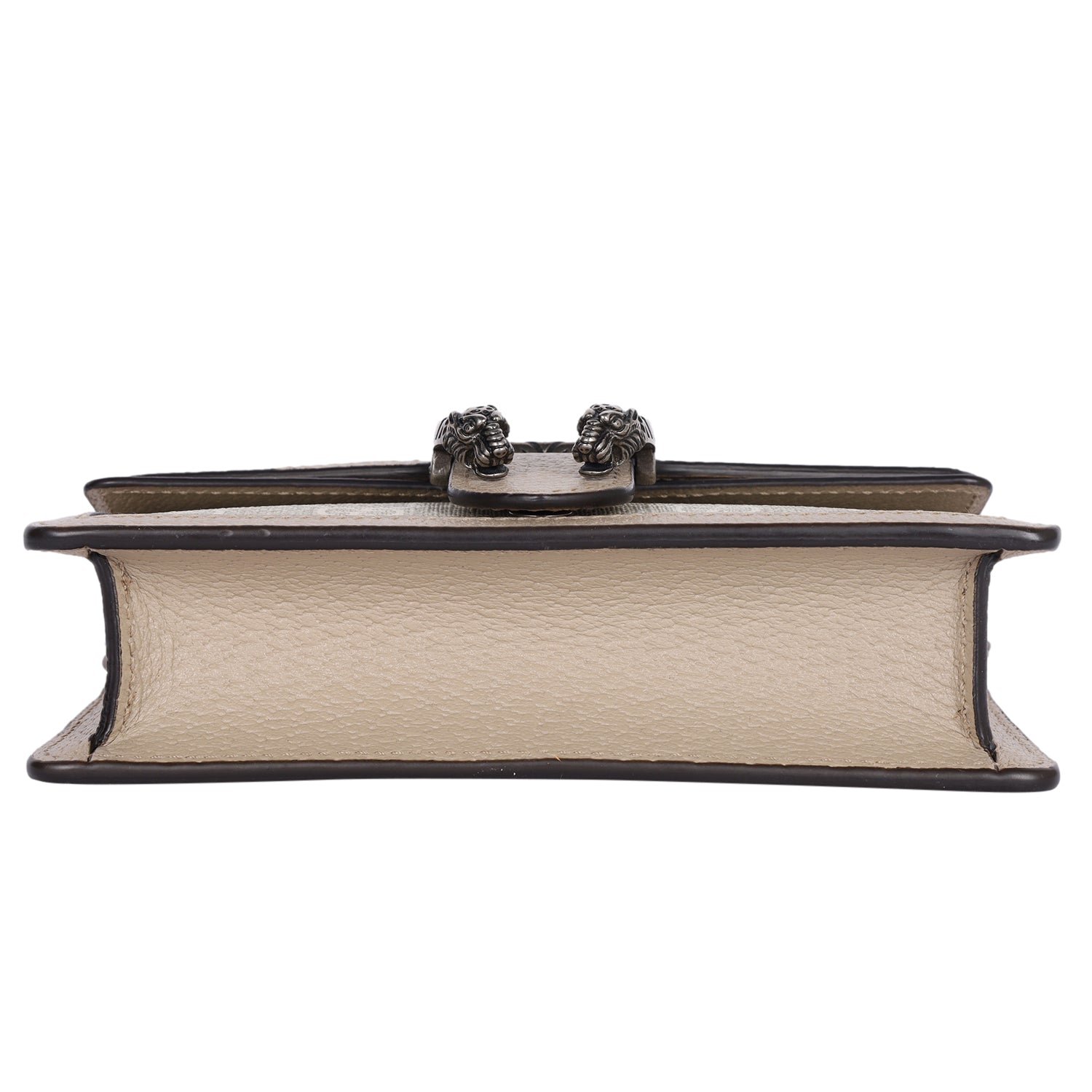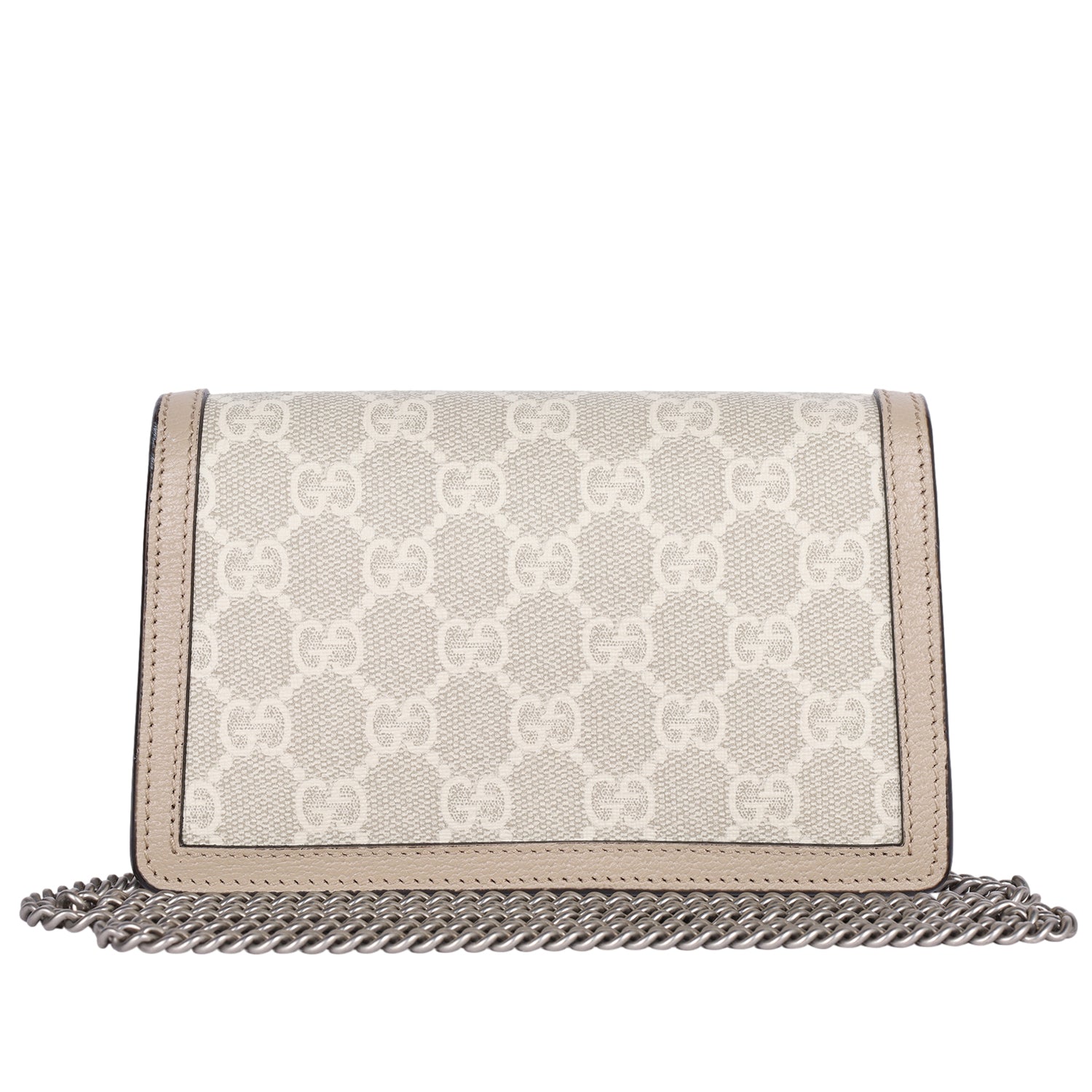 Authentic Like New Gucci GG Dionysus Denim Super Mini Crossbody Bag in Beige, Mystic White, and Oatmeal. This chic petite bag features Gucci GG supreme monogram coated canvas with beige leather trim, aged silver chain shoulder strap and a textured horseshoe tiger spur snap closure. The flap opens to a beige interior.
