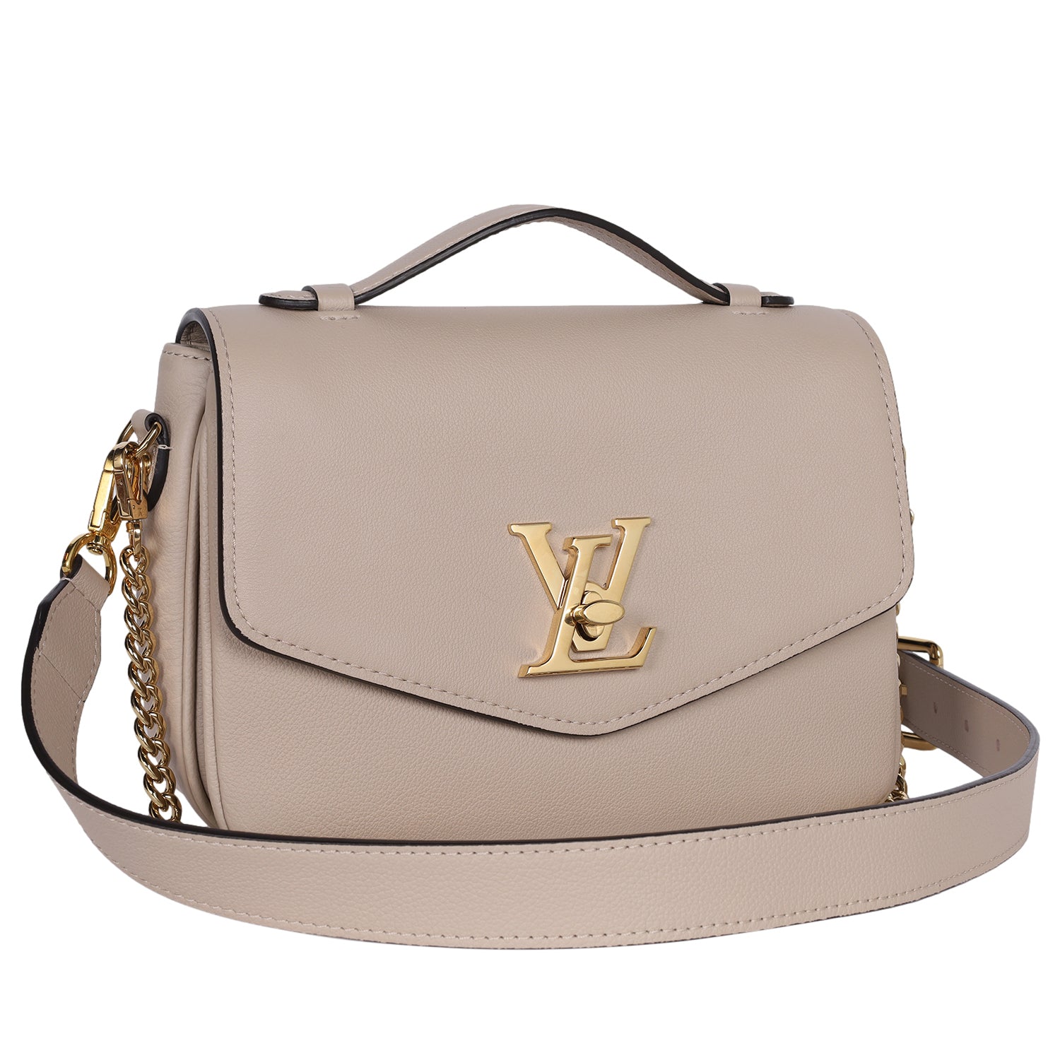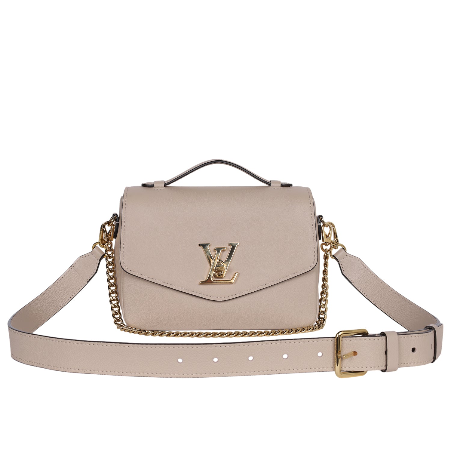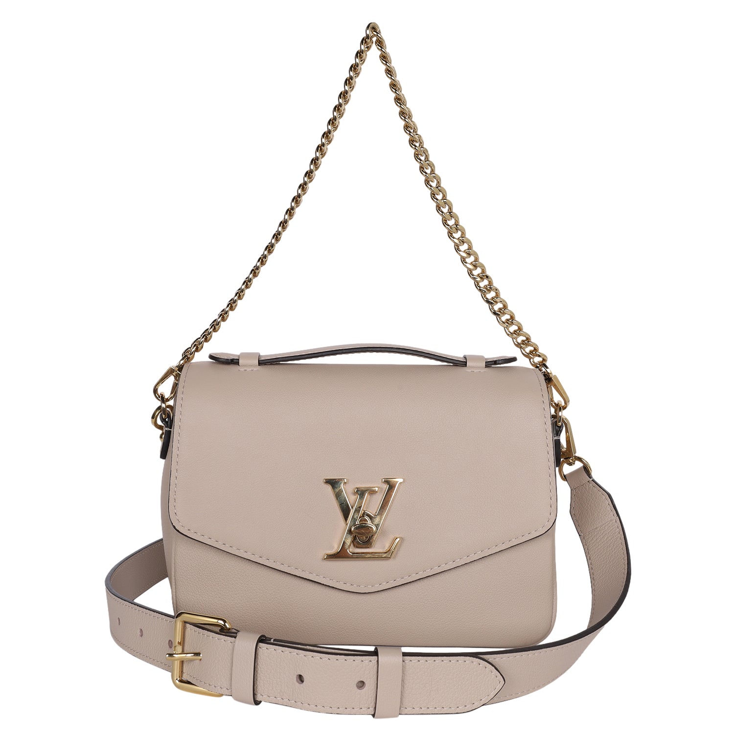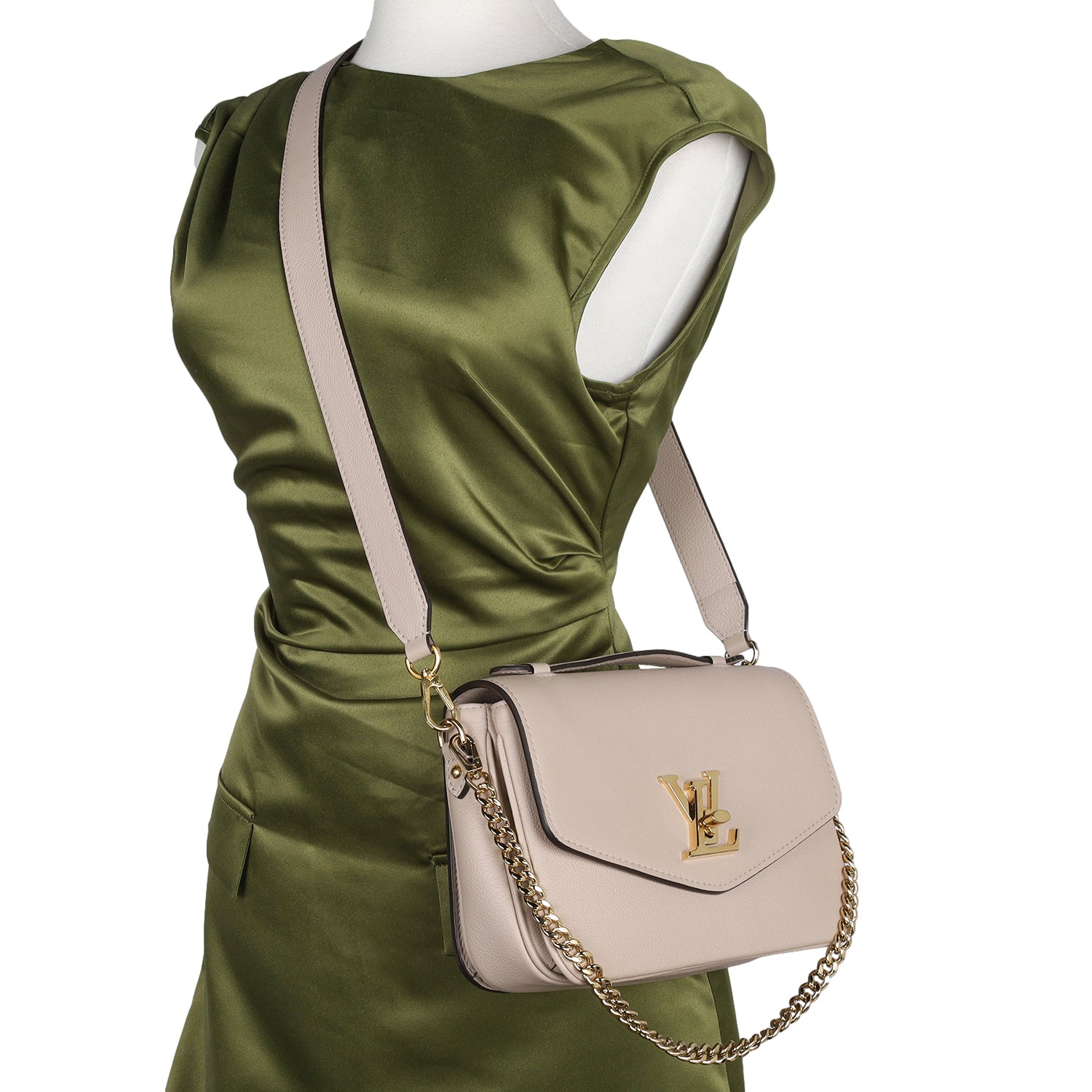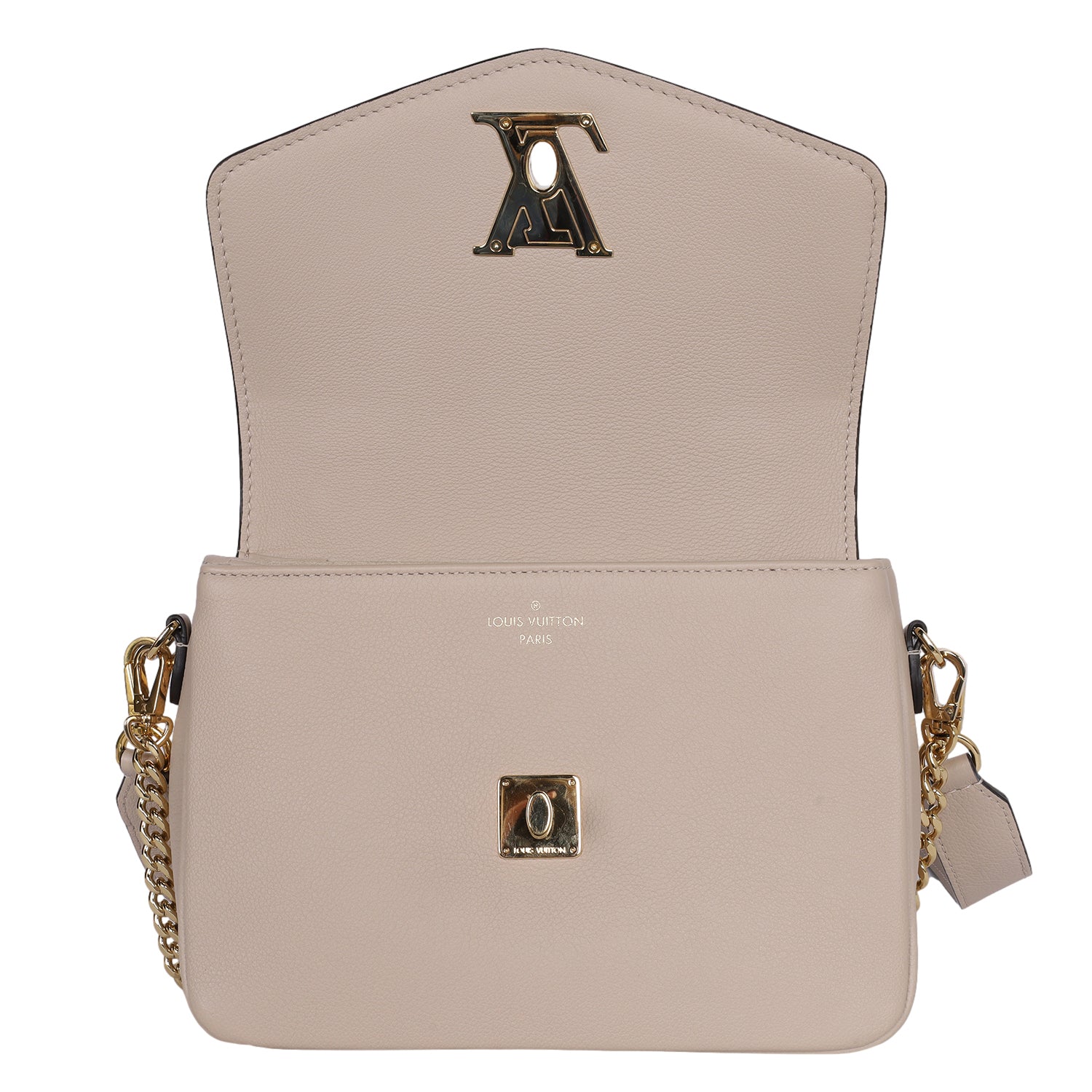 Authentic Louis Vuitton Grained Calfskin Lockme Oxford in tan. This Louis Vuitton handbag is a classic and is loved by all women. Women love this bag for the wonderful shape it has and how easy it is to open and close. Features calfskin leather in beige tan, chain and leather shoulder strap, a polished gold shoulder strap, gold LV turn-lock closure on the front flap, 2 section microfiber interior with rear slip pocket, back of the bag has a zipper pocket.