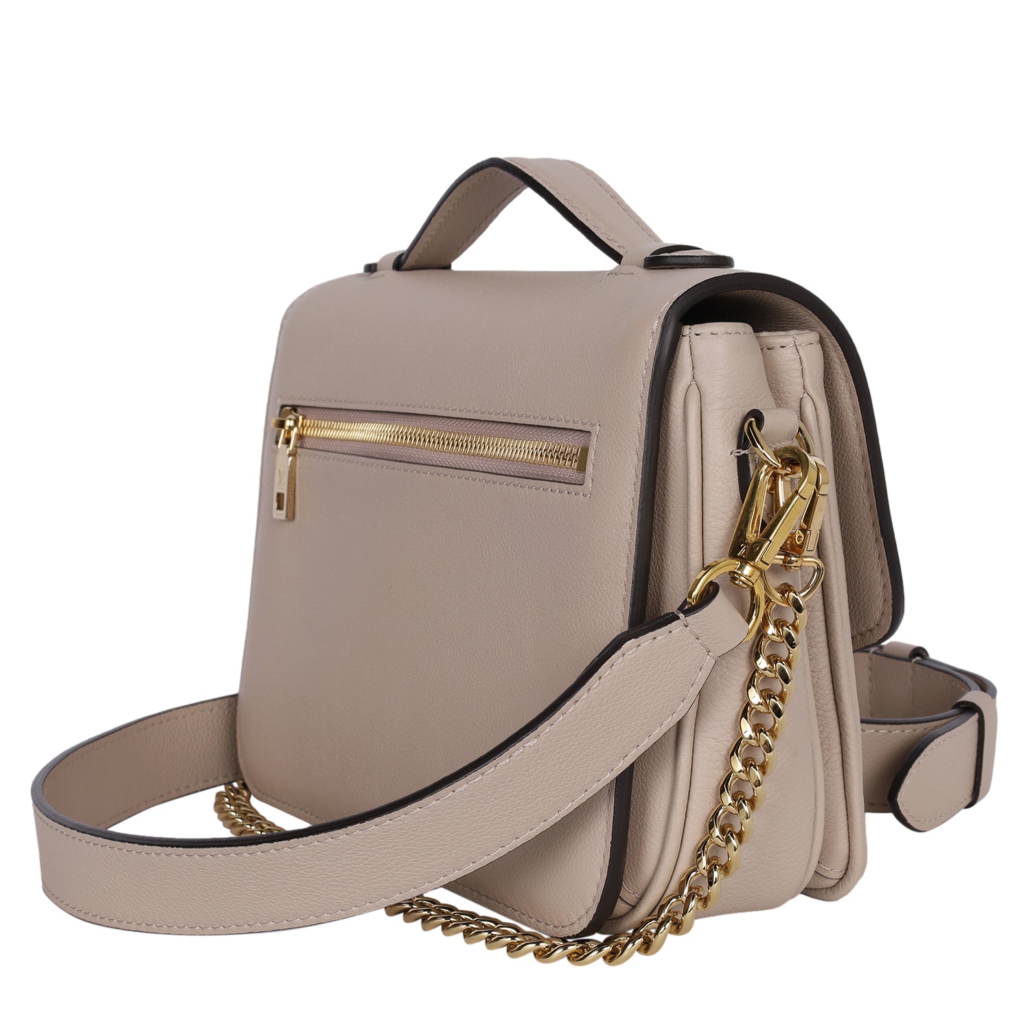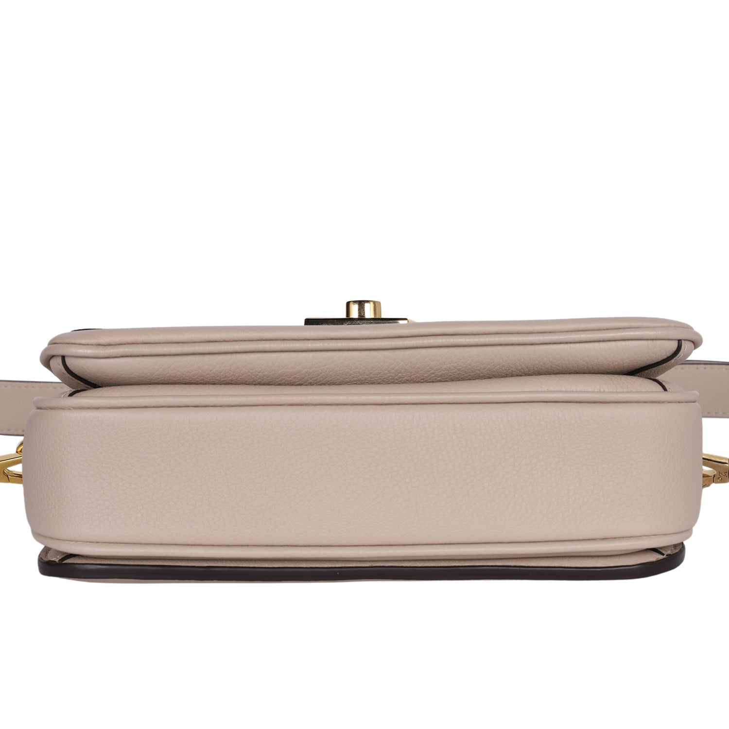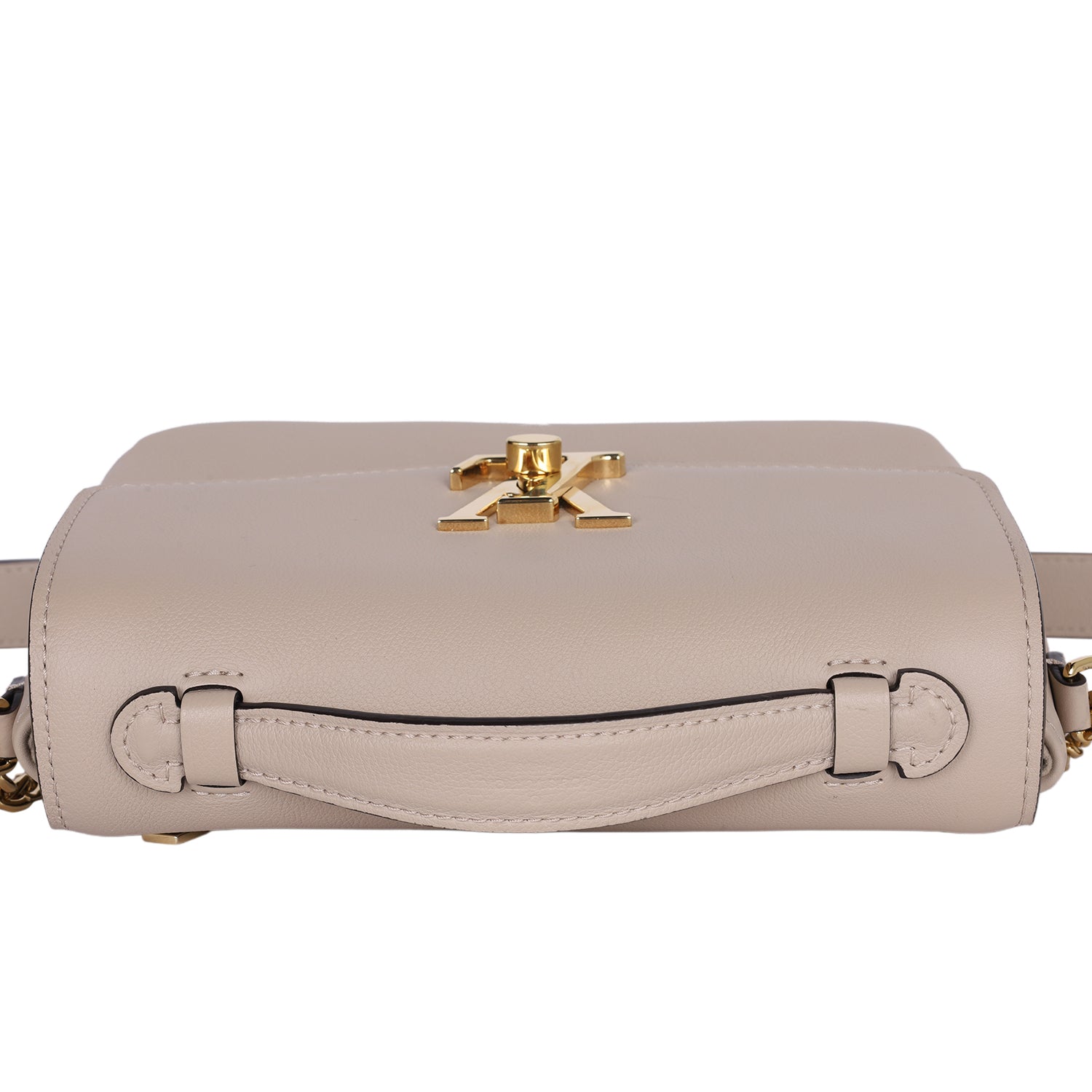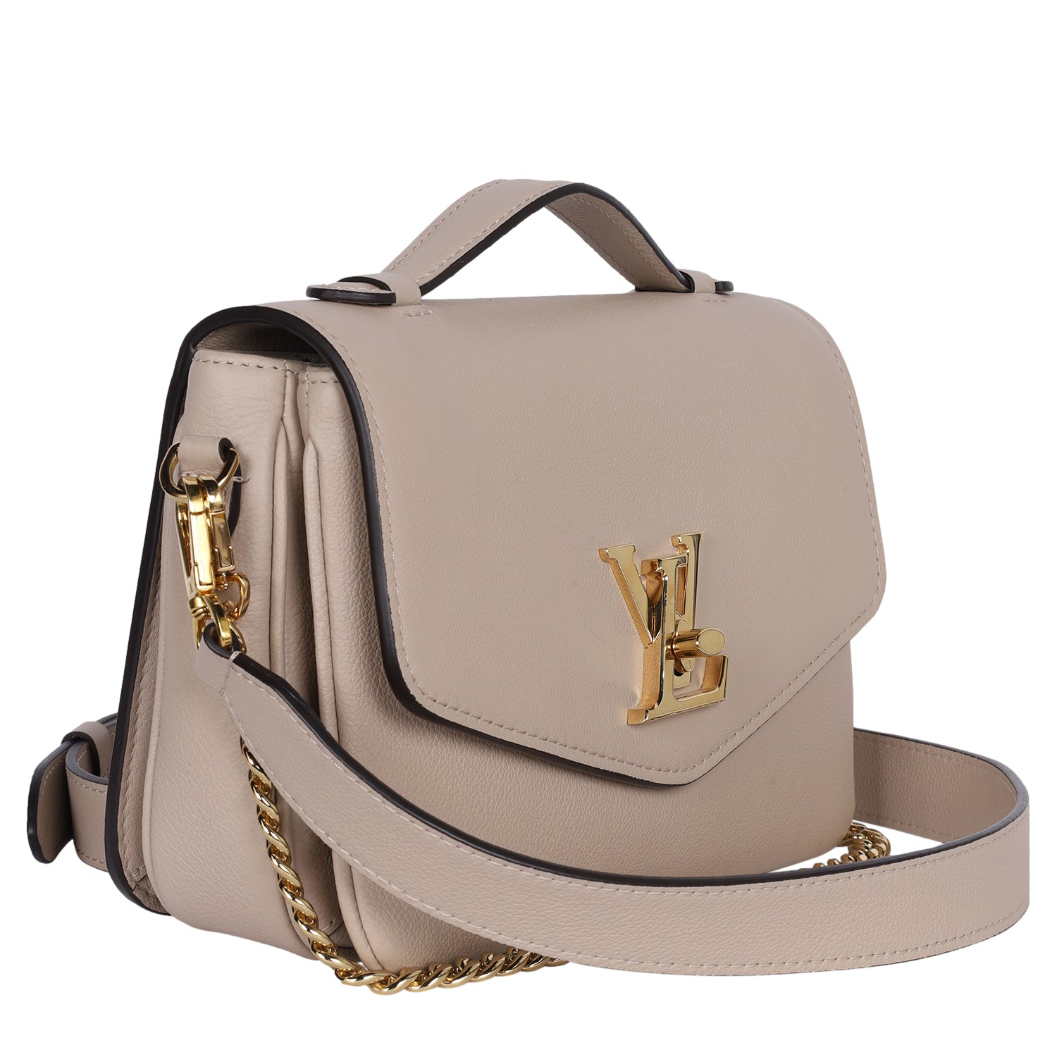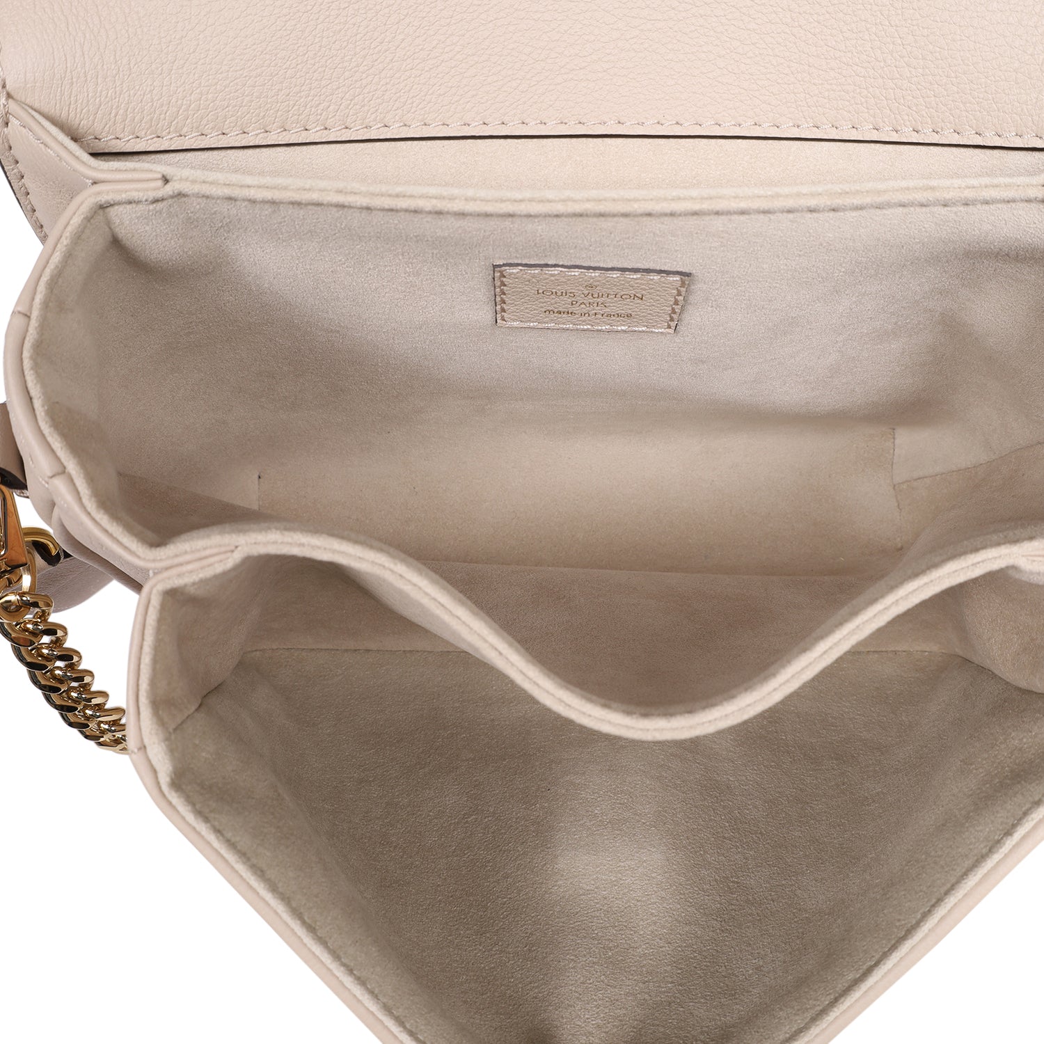 Authentic Louis Vuitton Grained Calfskin Lockme Oxford in tan. This Louis Vuitton handbag is a classic and is loved by all women. Women love this bag for the wonderful shape it has and how easy it is to open and close. Features calfskin leather in beige tan, chain and leather shoulder strap, a polished gold shoulder strap, gold LV turn-lock closure on the front flap, 2 section microfiber interior with rear slip pocket, back of the bag has a zipper pocket.