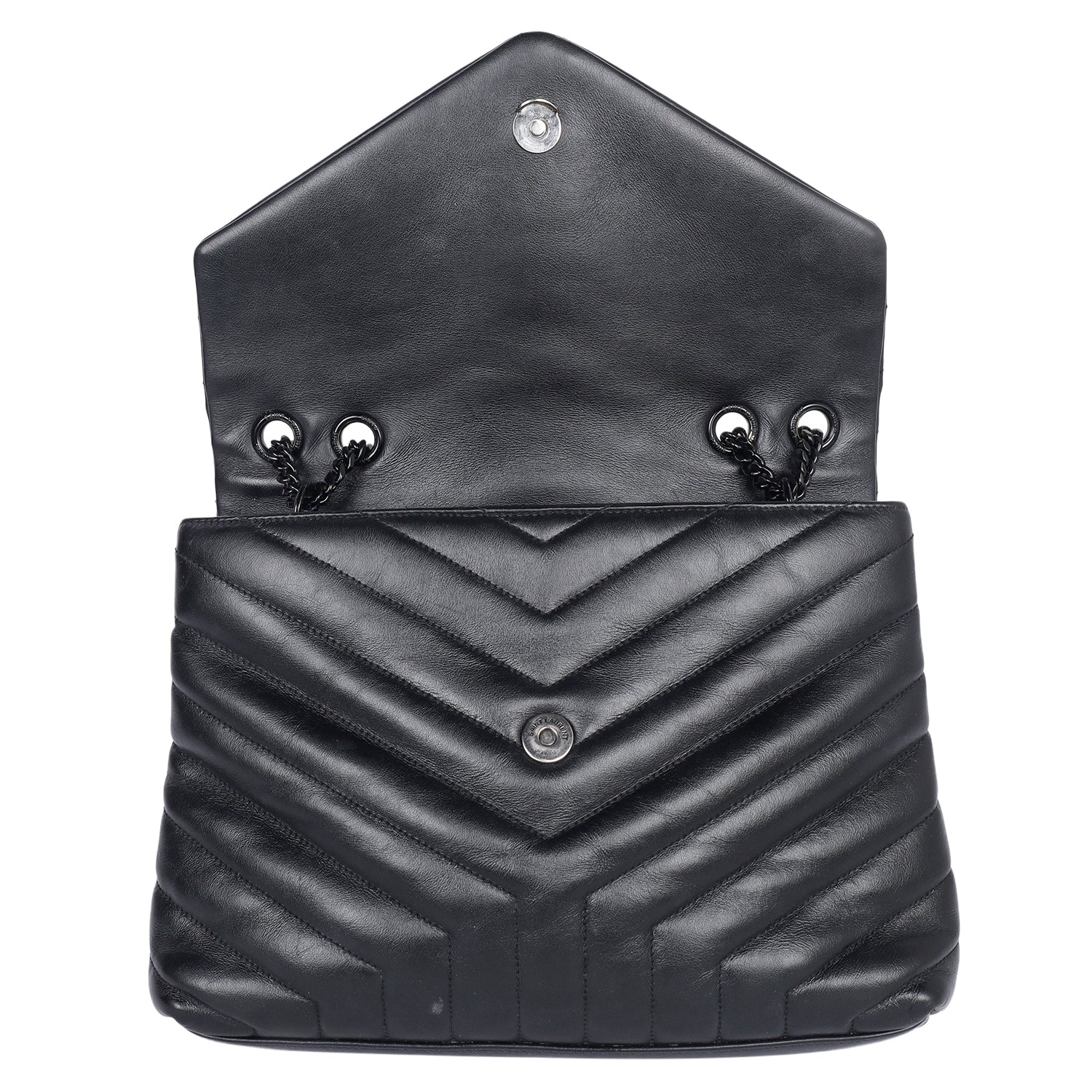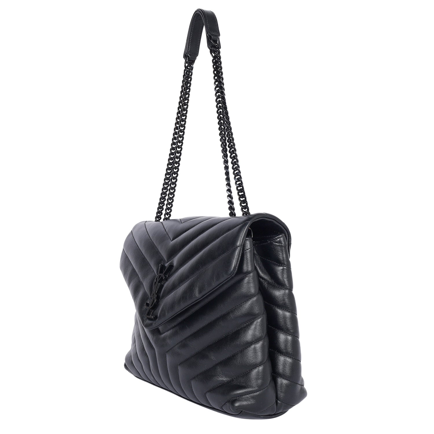 Authentic Saint Laurent Calfskin Y Quilted Monogram Monochrome Medium Loulou Shoulder Bag. Features adjustable top handle, fold over front flap, magnetic snap closure, black tone hardware, chevron-quilted calfskin leather, large interior with double sides, zipper middle compartment and zipper pocket.