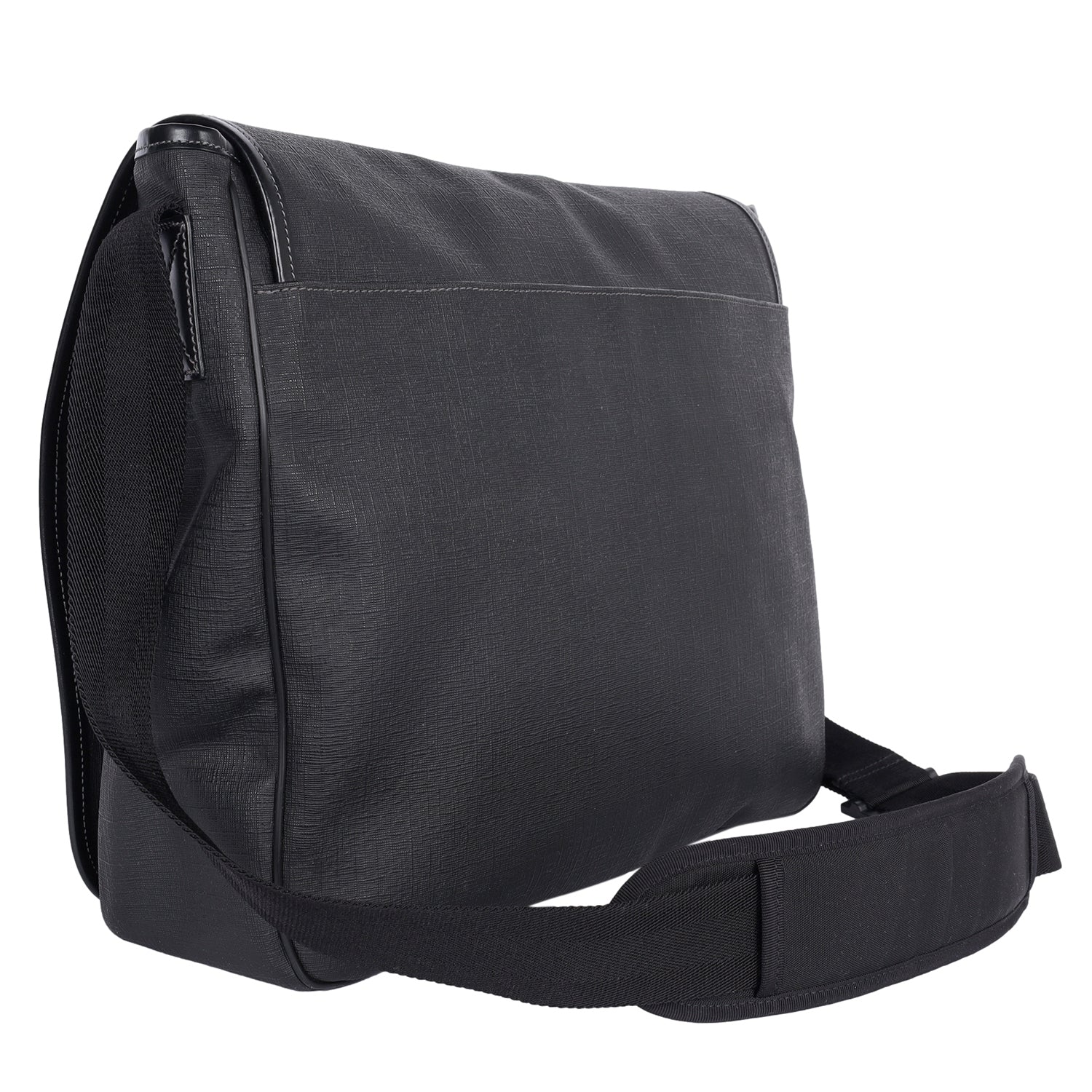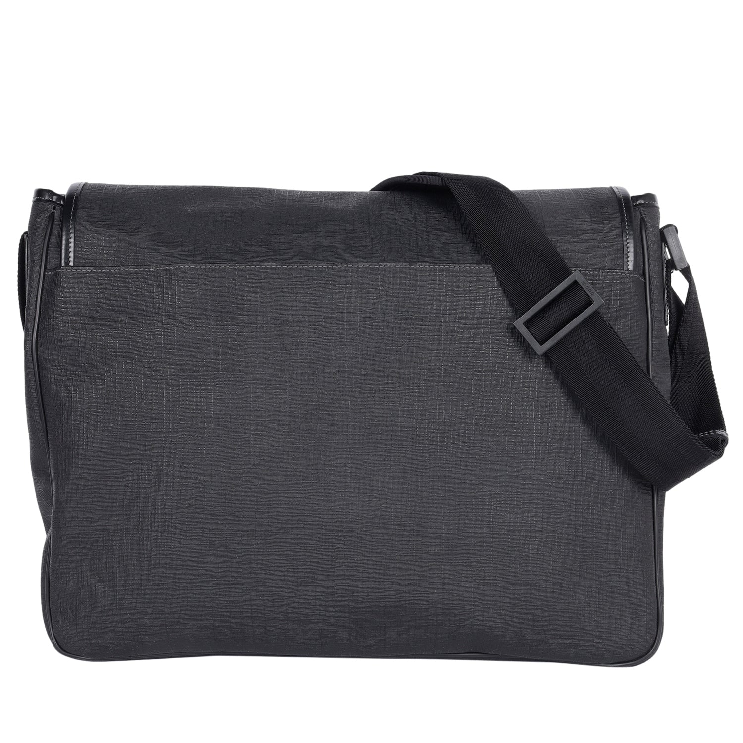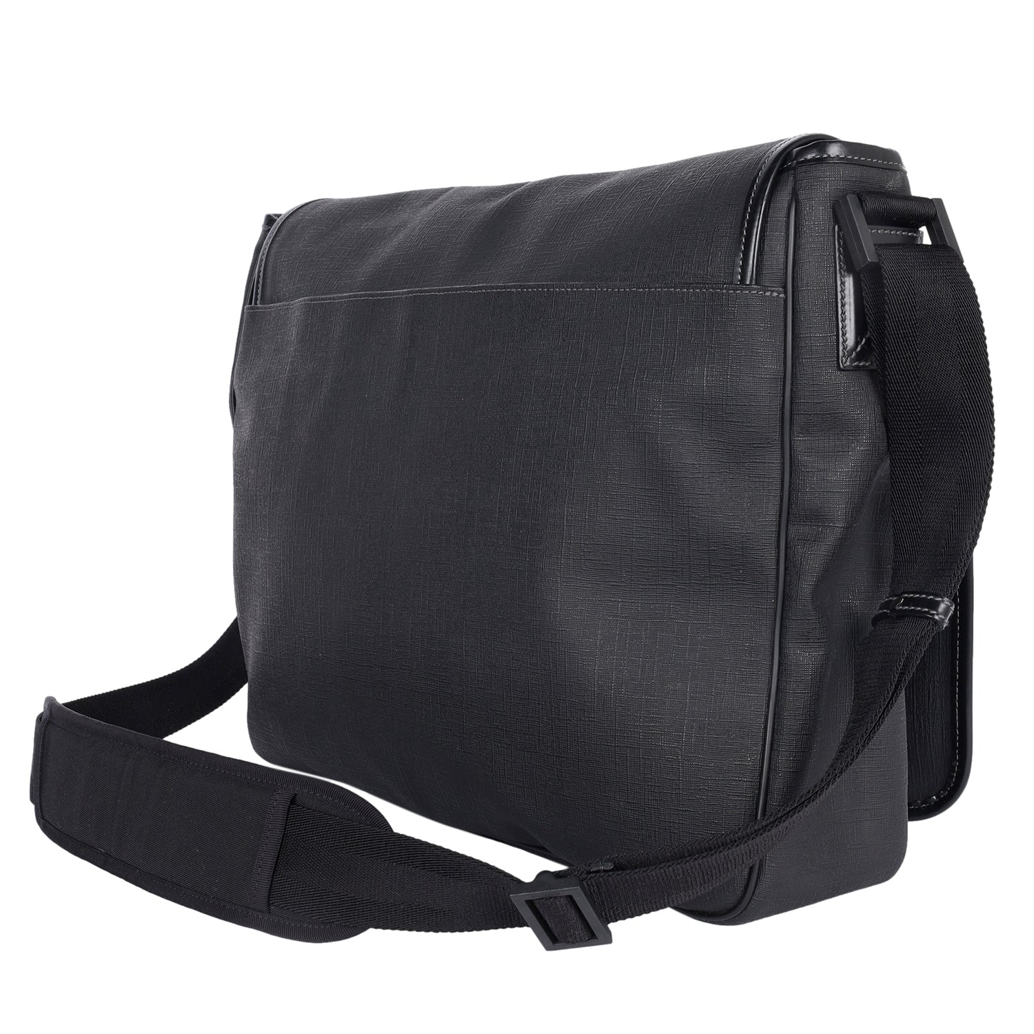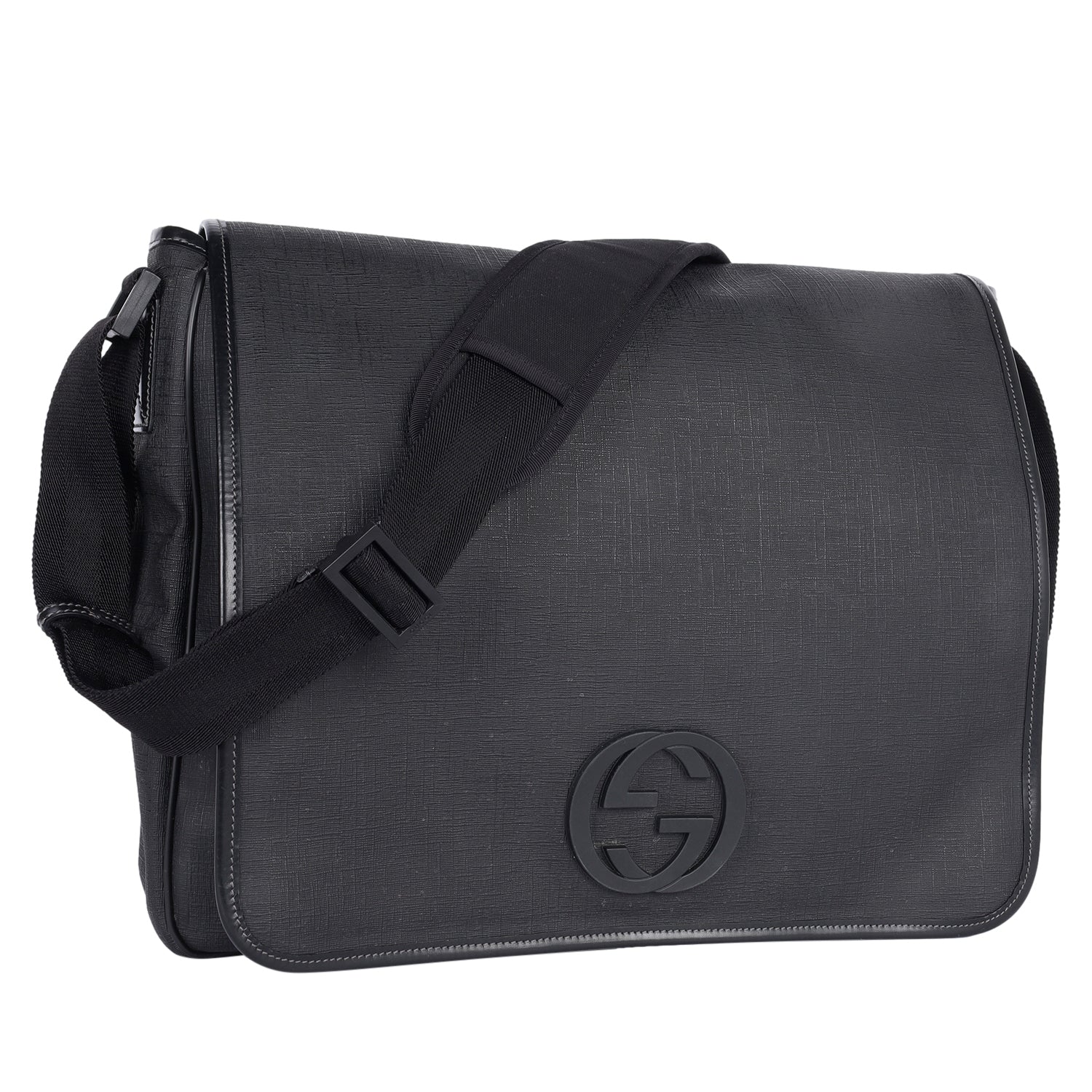 Authentic Gucci Coated Canvas Interlocking G Large Flap Messenger Bag Black. This bag is in great condition. Features coated canvas with an interlocking GG monogram on the front flap, front flap magnetic snap closure, large fabric interior with zipper pocket and slip pockets, black nylon cross body strap with black hard plastic hardware, leather trim and a full rear pocket.