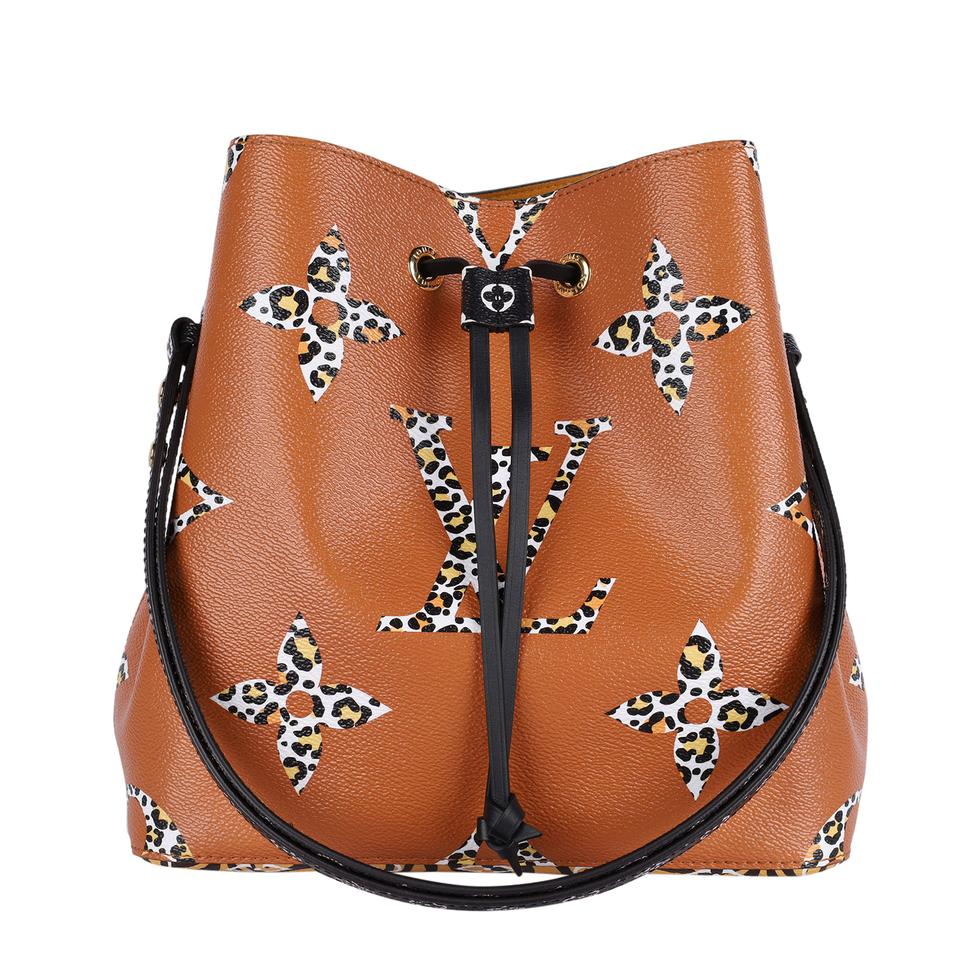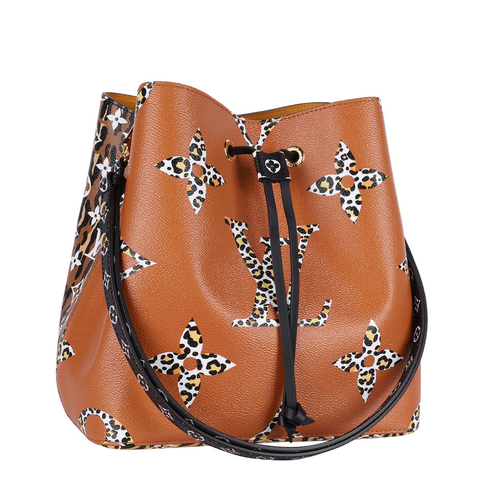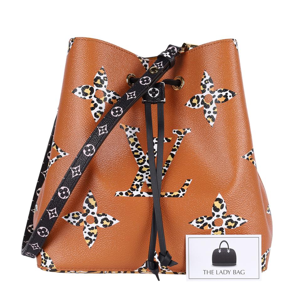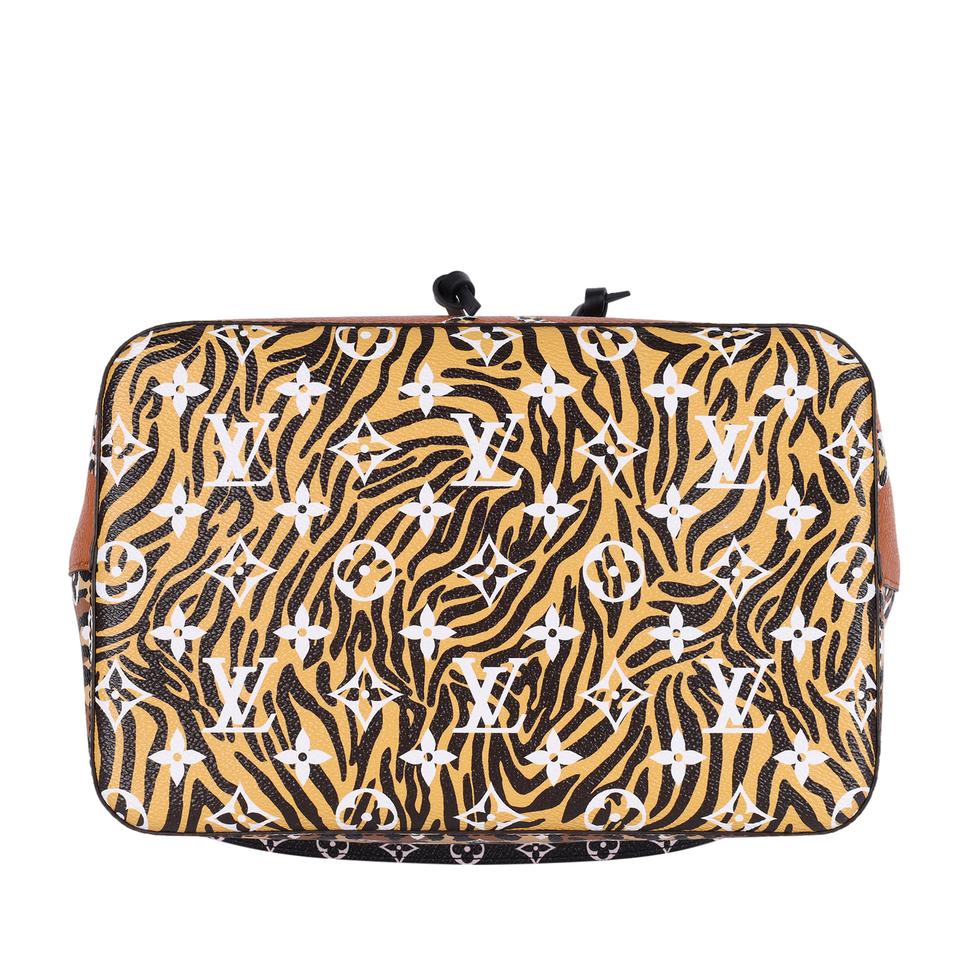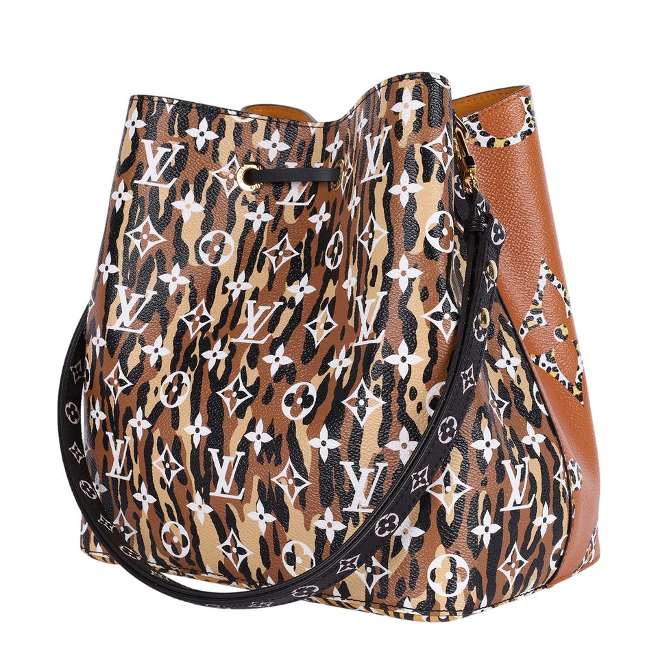 Authentic, rare, limited edition Louis Vuitton jungle Neonoe shoulder bag tote. This NEW limited edition bag mixes the monogram motif with reversible animal patterns. This bucket bag is both fashionable and practical. The bag is lightweight and can be carried on the shoulder or adjust the strap and carry it as a cross body bag. You're going to love it! Detailed features: caramel, black and brown colors, monogram coated canvas, textile interior lining with divided zipped pocket, gold-color hardware, removable and adjustable strap, 2 large interior compartments, zipped central flat pocket, and drawstring closure. This bag is a rare hard to find bag. Get it while it is available.