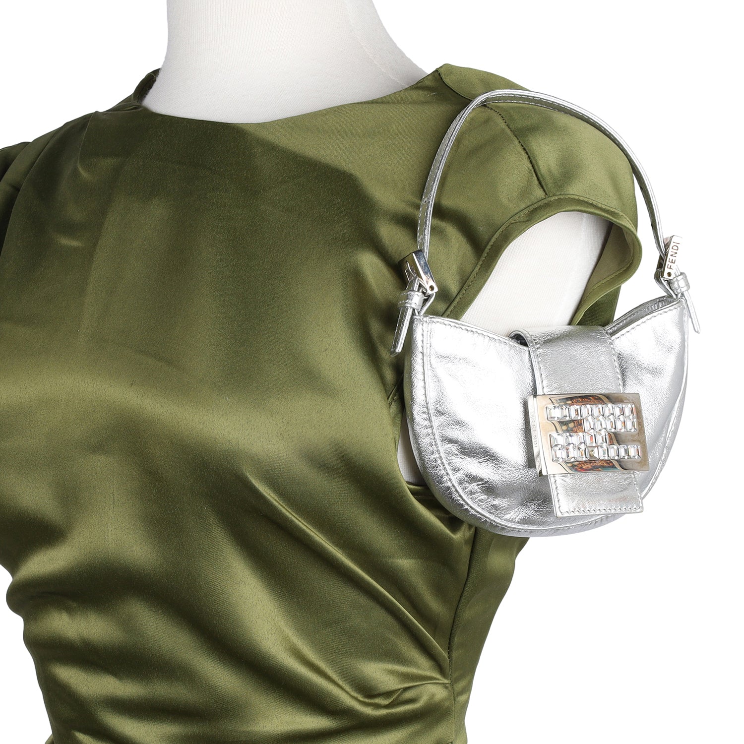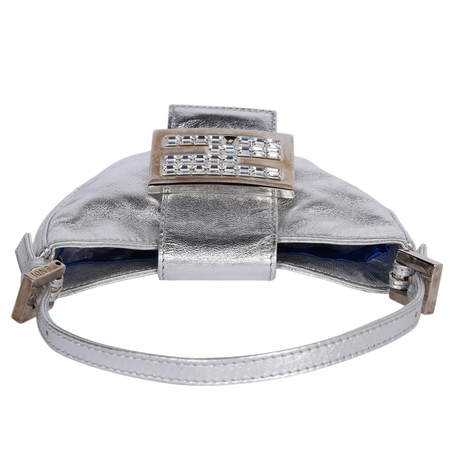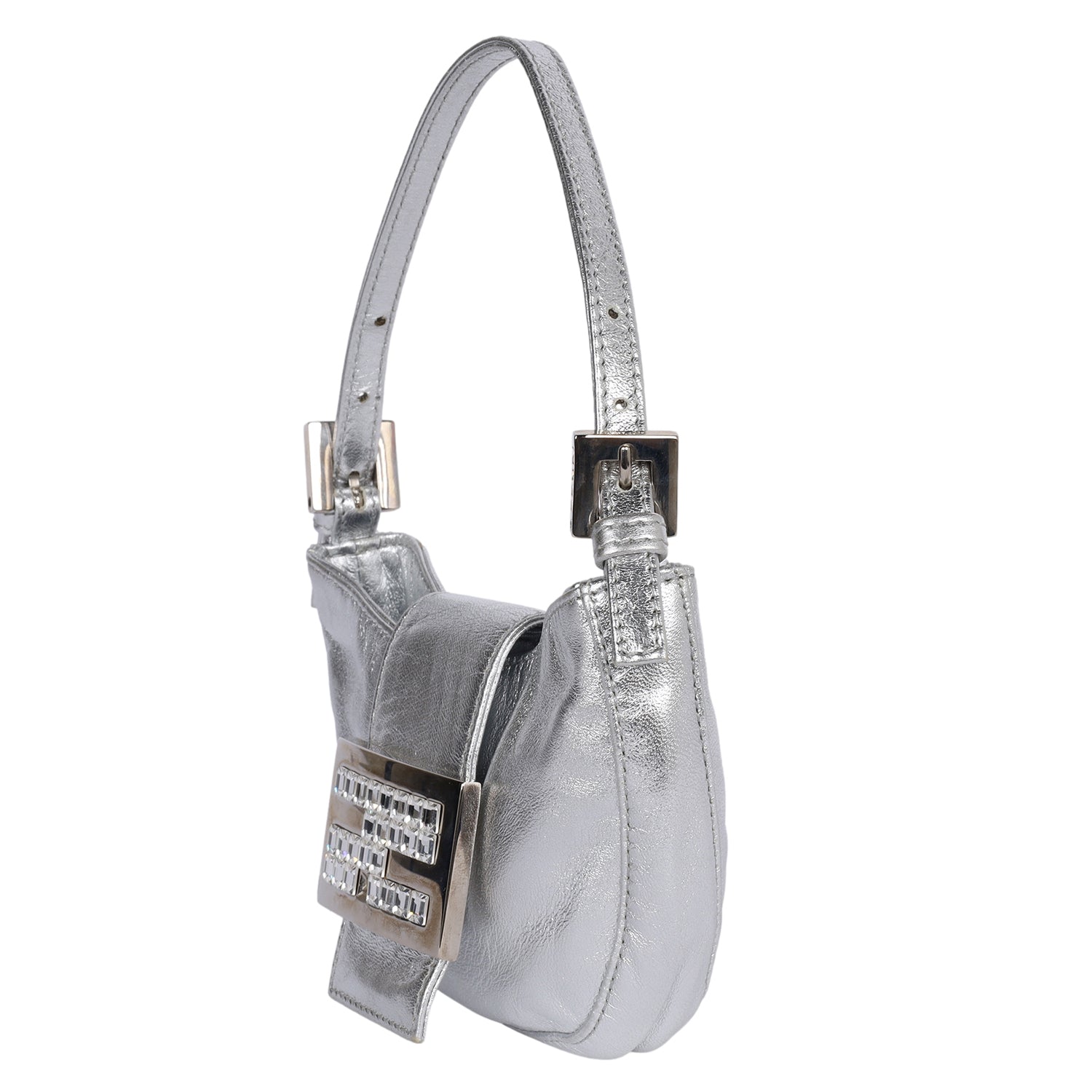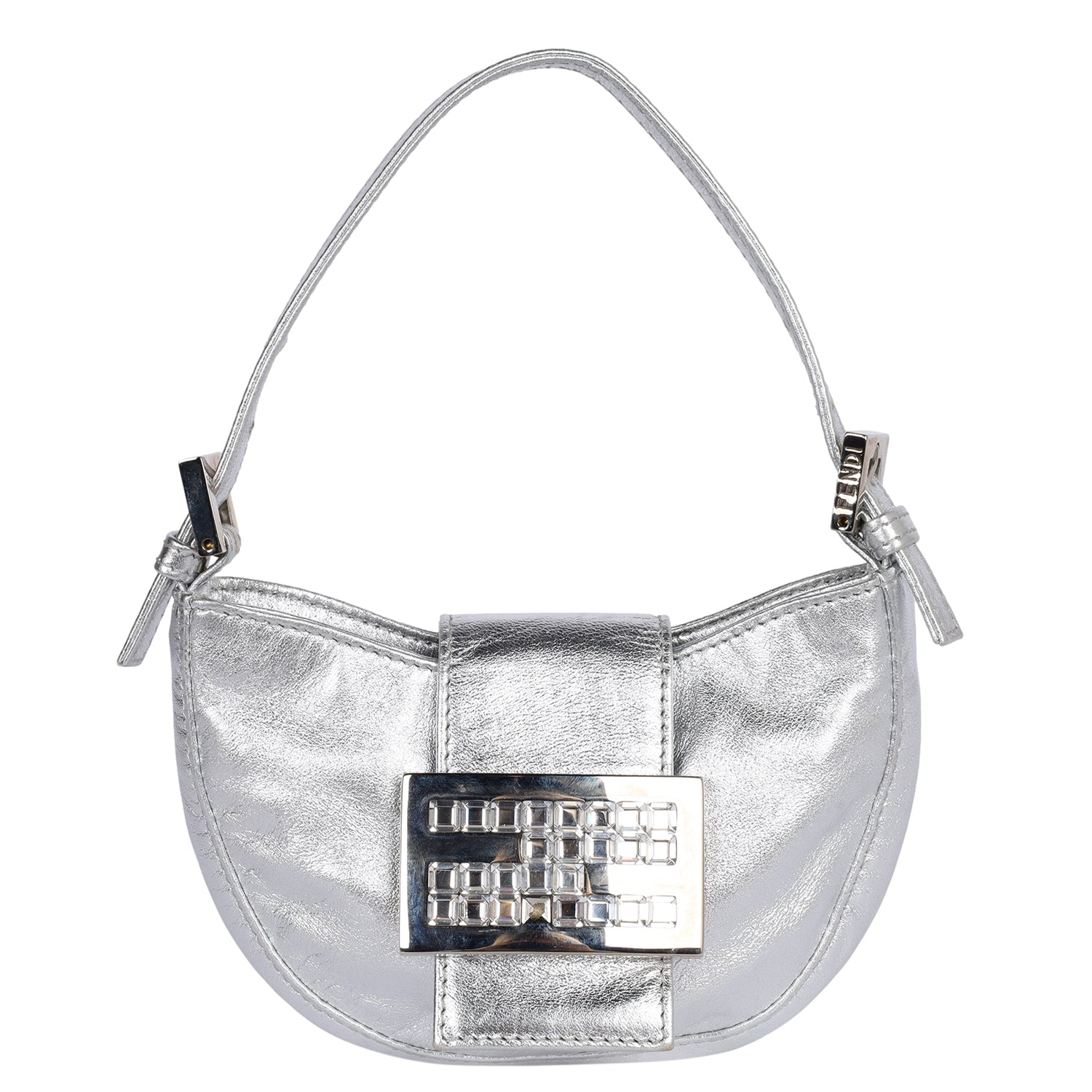 The most adorable fashion statement is about to be made with this Fendi! Circa late 1990s/early 2000s, this mini bag dubbed the 'croissant' features silver metallic leather and features a single adjustable top handle, silver hardware, and the iconic FF logo embellished with clear rhinestones. The interior is lined with electric blue satin and is stamped.