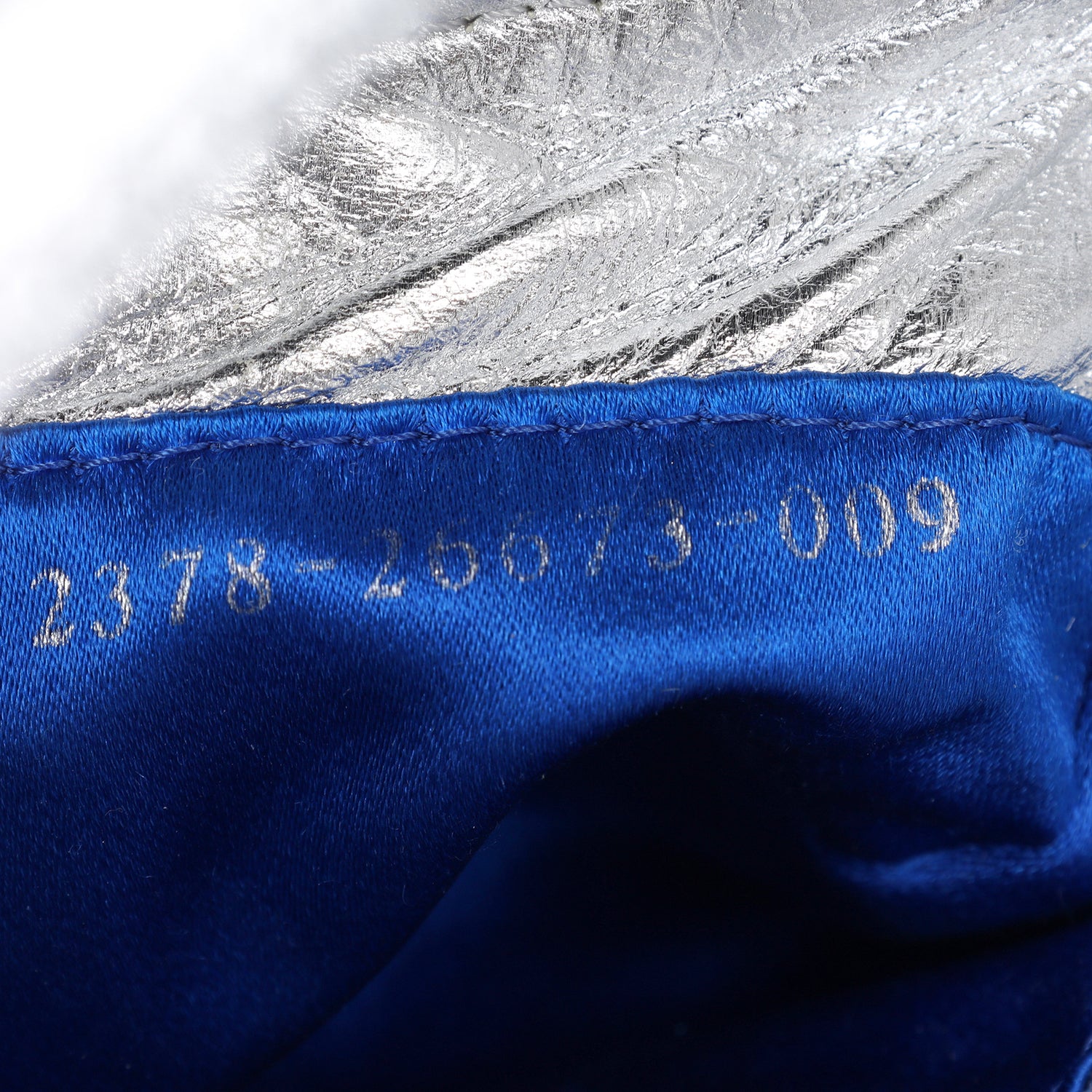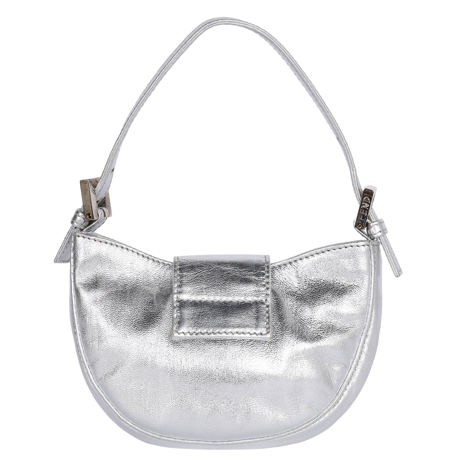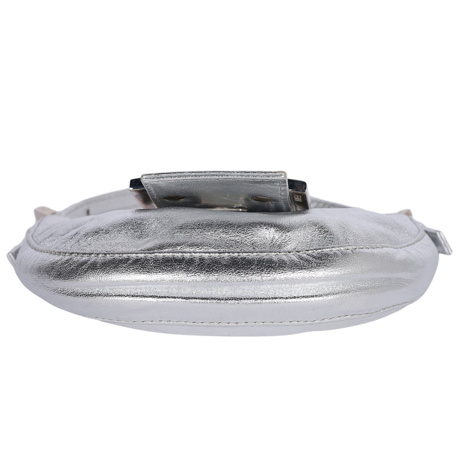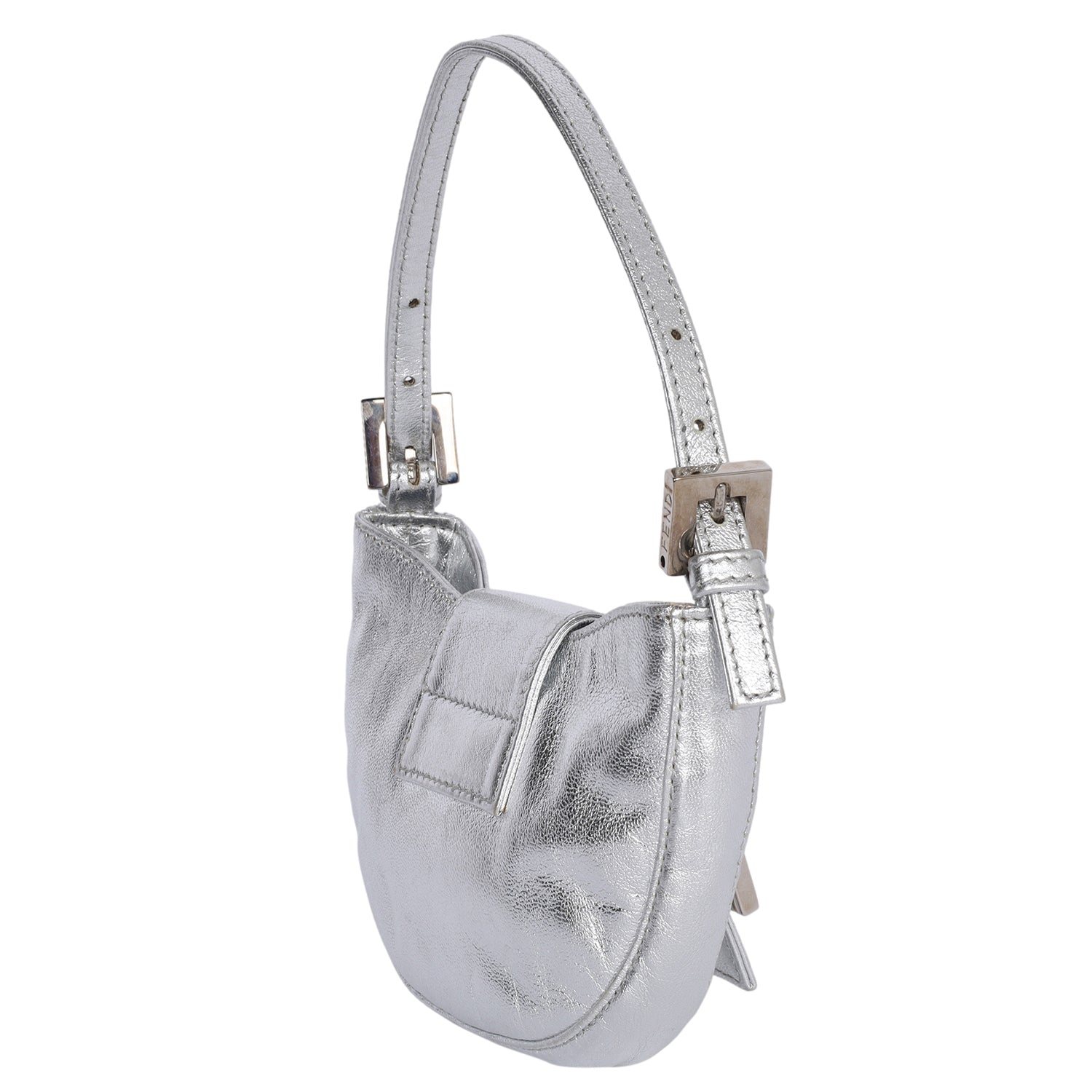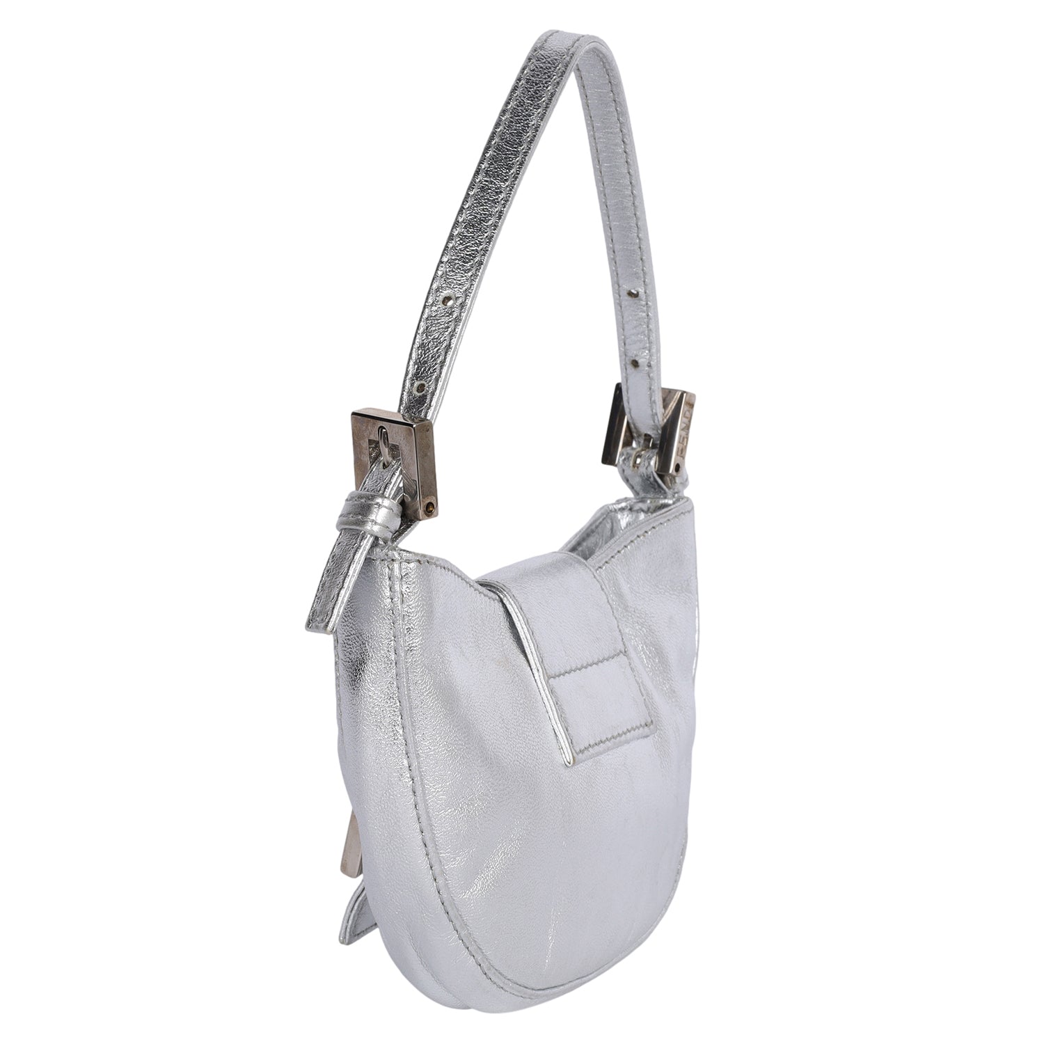 The most adorable fashion statement is about to be made with this Fendi! Circa late 1990s/early 2000s, this mini bag dubbed the 'croissant' features silver metallic leather and features a single adjustable top handle, silver hardware, and the iconic FF logo embellished with clear rhinestones. The interior is lined with electric blue satin and is stamped.