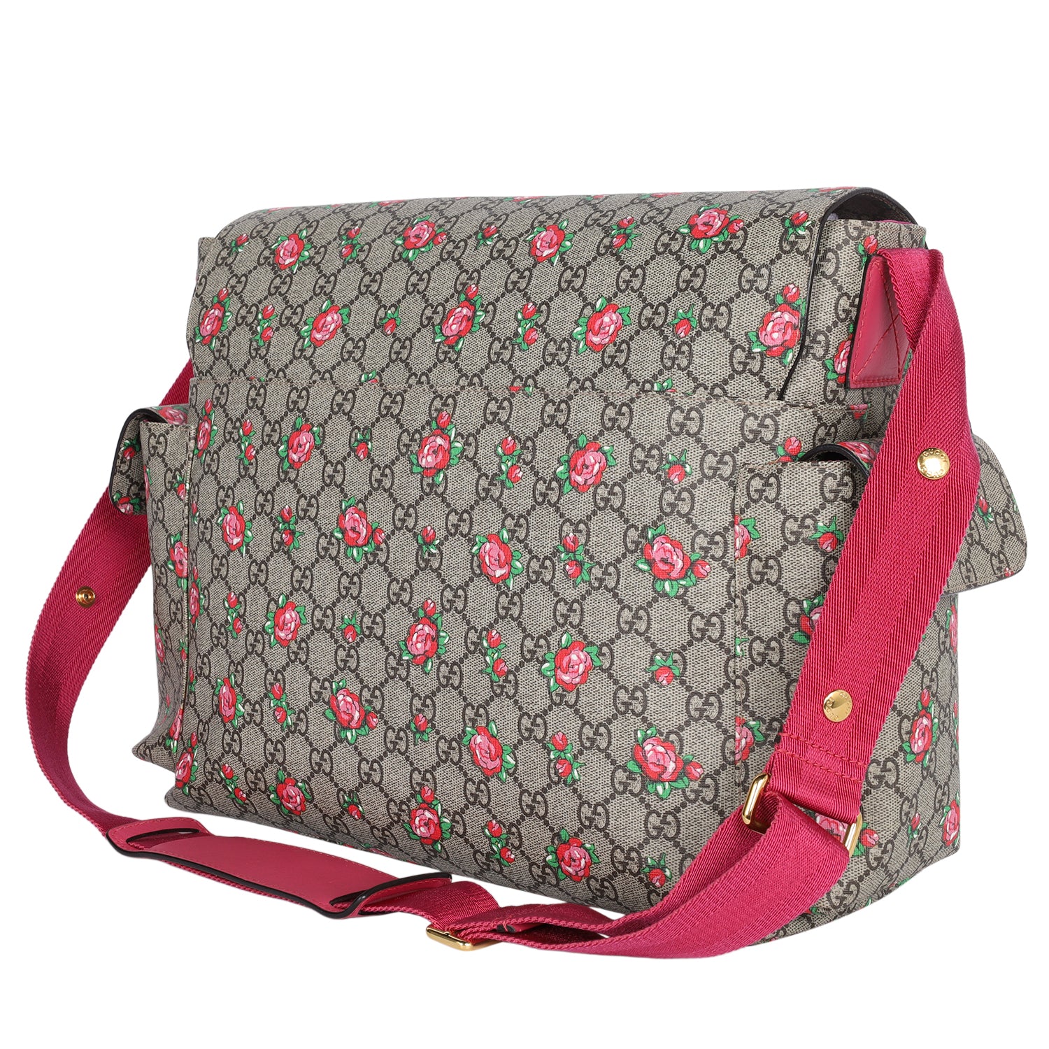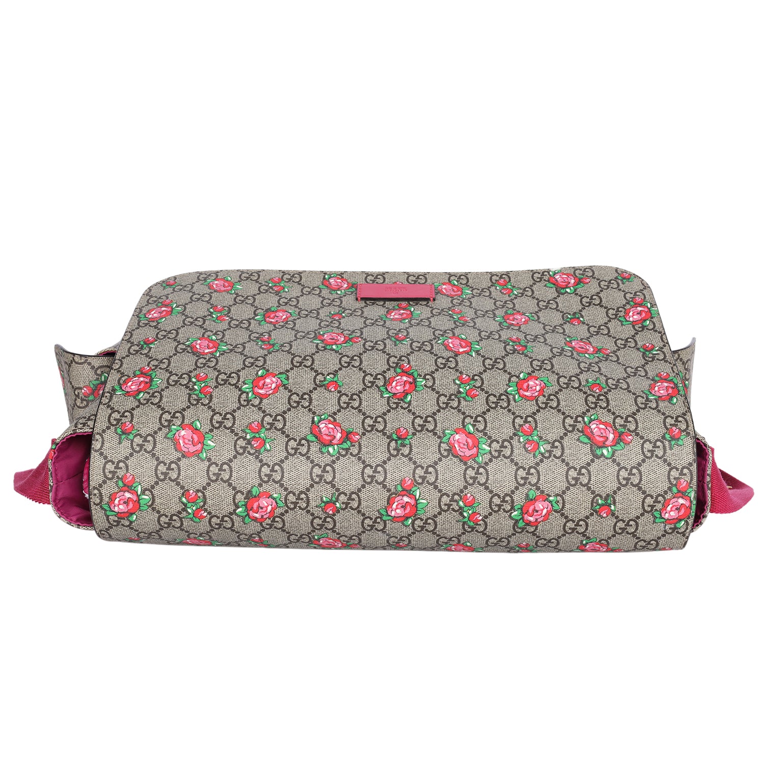 Authentic Gucci Strawberry Print GG Canvas diaper bag or messenger bag. Features strawberry print and leather trim. Adjustable shoulder strap with stroller snaps, front flap closure with Velcro, 2 exterior side pockets, extra large interior with slip pockets and fold-out changing pad. This bag can be used as a diaper bag or messenger bag. Add your laptop and travel needs, or your baby items. This is a must-have Gucci.