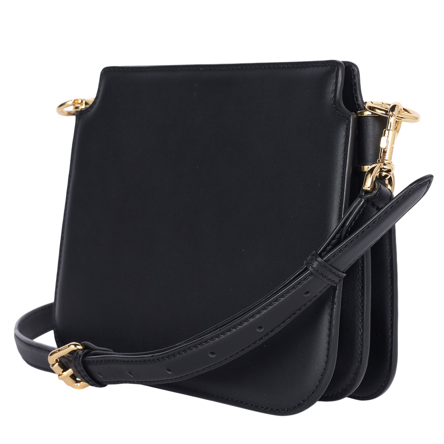 Features black calfskin leather, gold Fendi logo push lock closure, adjustable leather strap with gold hardware, partitioned brown suede interior with slip pocket.